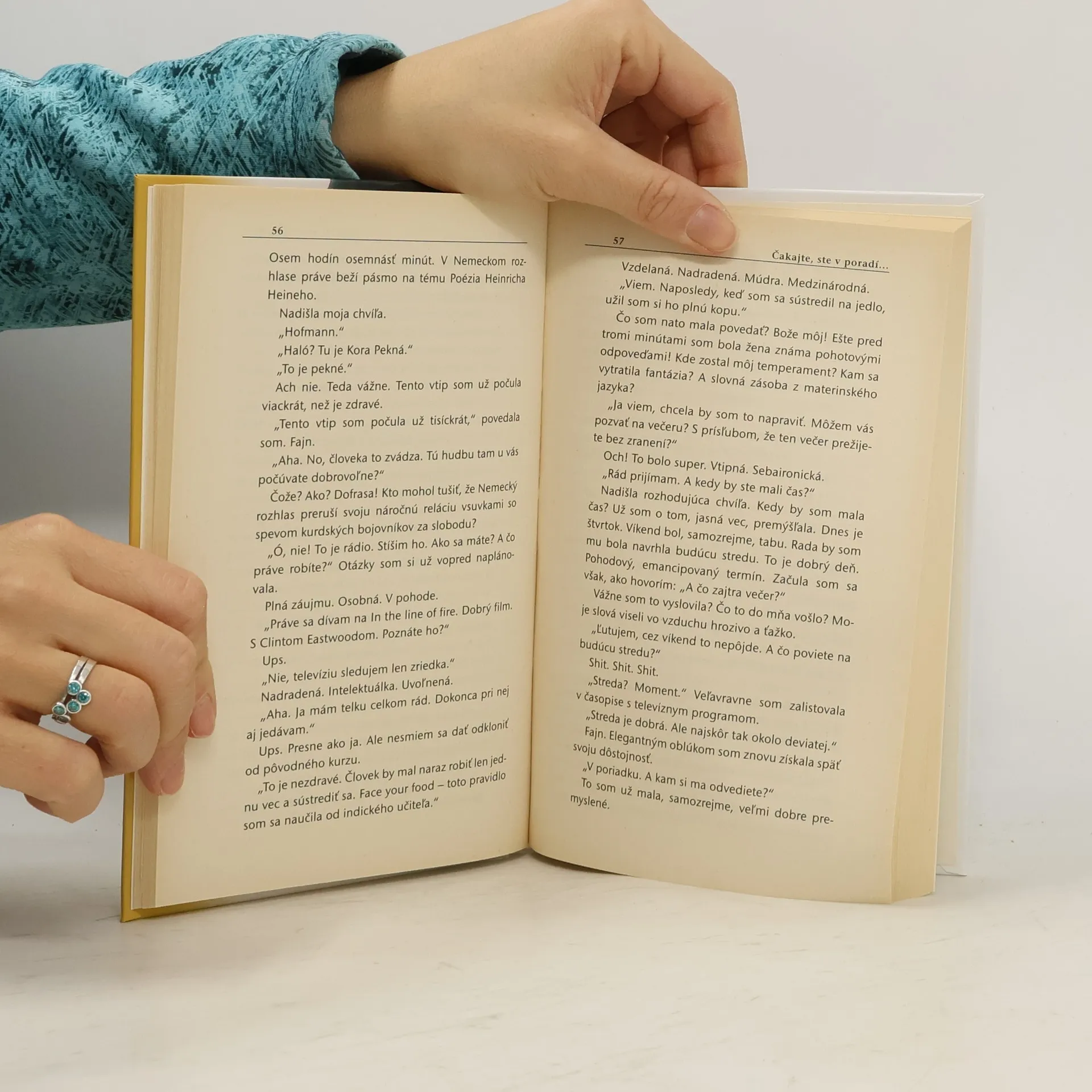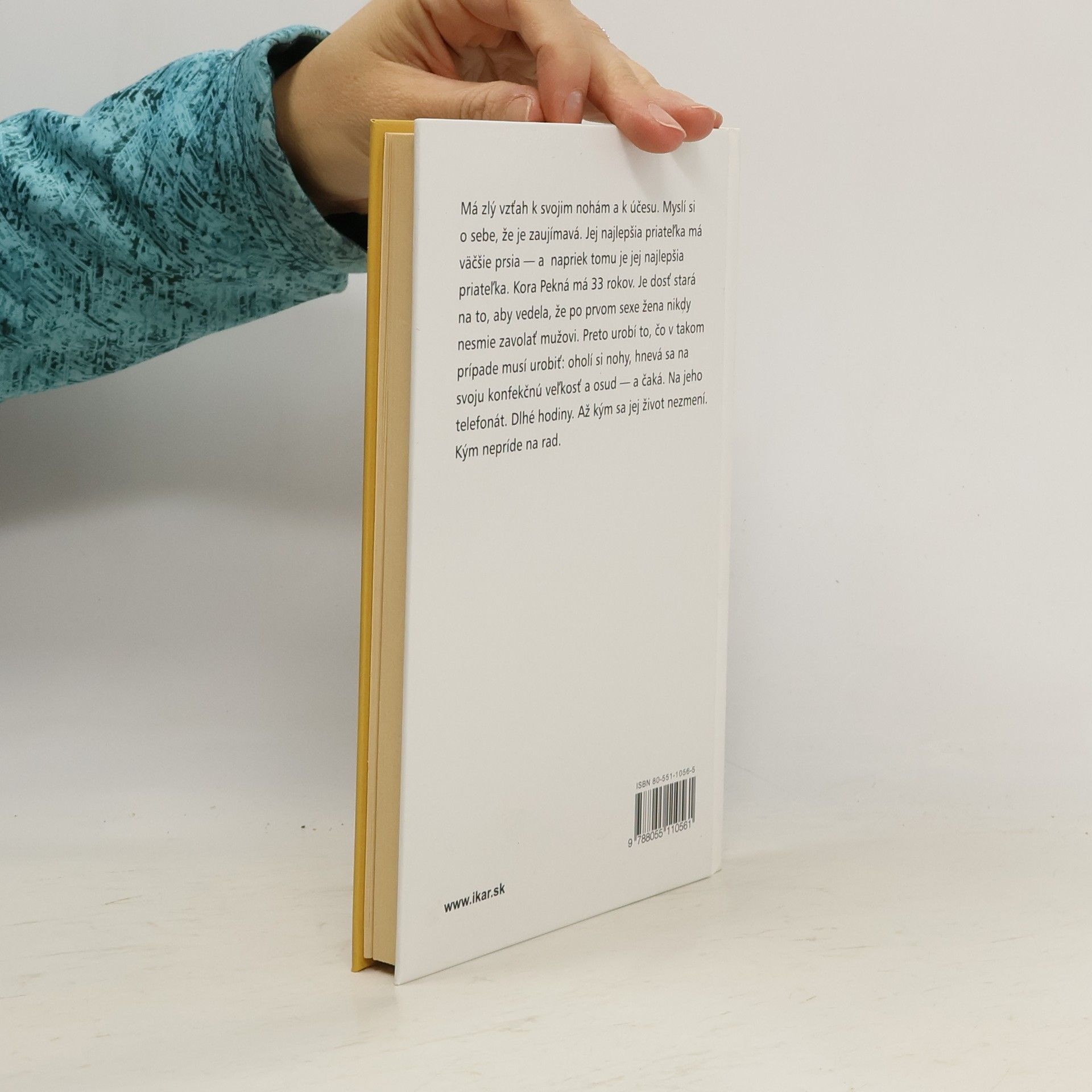Má zlý vzťah k svojim nohám a k účesu. Myslí si o sebe, že je zaujímavá. Jej najlepšia priateľka má väčšie prsia – a napriek tomu je jej najlepšia priateľka. Kora Pekná má 33 rokov. Je dosť stará na to, aby vedela, že po prvom sexe žena NIKDY nesmie zavolať mužovi. Preto urobí to, čo v takom prípade musí urobiť: oholí si nohy, hnevá sa na svoju konfekčnú veľkosť a osud – a čaká. Na jeho telefonát. Dlhé hodiny. Až kým sa jej život nezmení. Kým nepríde na rad.