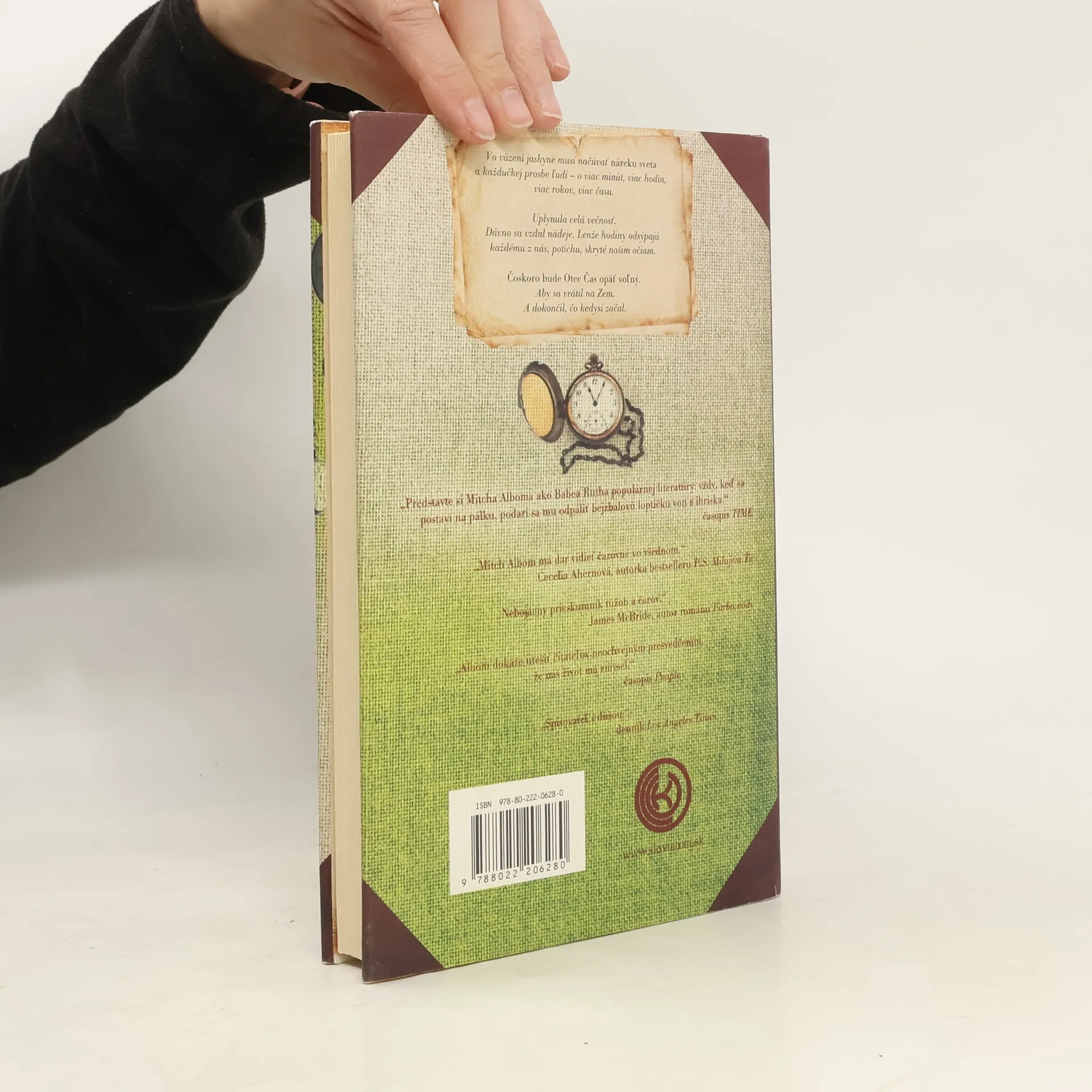 Mitch Albom vo svojom najnovšom diele krásnej literatúry rozpráva príbeh vynálezcu prvých hodín na svete, ktorého neminie trest za pokus odmeriavať najväčší dar od boha. Musí prežiť stáročia vo väzení jaskyne a načúvať hlasom, ktoré k nemu doliehajú s jedinou prosbou – prosbou o viac dní, viac rokov. Napokon, s dušou takmer zlomenou, získa otec Čas voľnosť a s ňou aj čarovné presýpacie hodiny a poslanie: dostane šancu odčiniť dávny hriech, ak naučí dvoch ľudí na Zemi skutočnému významu času. Vracia sa do moderného sveta, posadnutého meraním času, ktoré sám tak nevinne začal, a vydáva sa na púť s dvomi nezvyčajnými spoločníkmi: mladým dievčaťom, ktoré sa chystá skoncovať so životom, a zomierajúcim boháčom, ktorý baží po večnom živote. Ak sa chce otec Čas zachrániť, musí najprv zachrániť ich dvoch. A zastaviť svet, aby uspel. Príbeh, vyrozprávaný v Albomovom typicky stručnom štýle, pripomína čitateľom, aby zvážili vlastné chápanie času a zamysleli sa, ako ho trávia a aký je v skutočnosti vzácny.