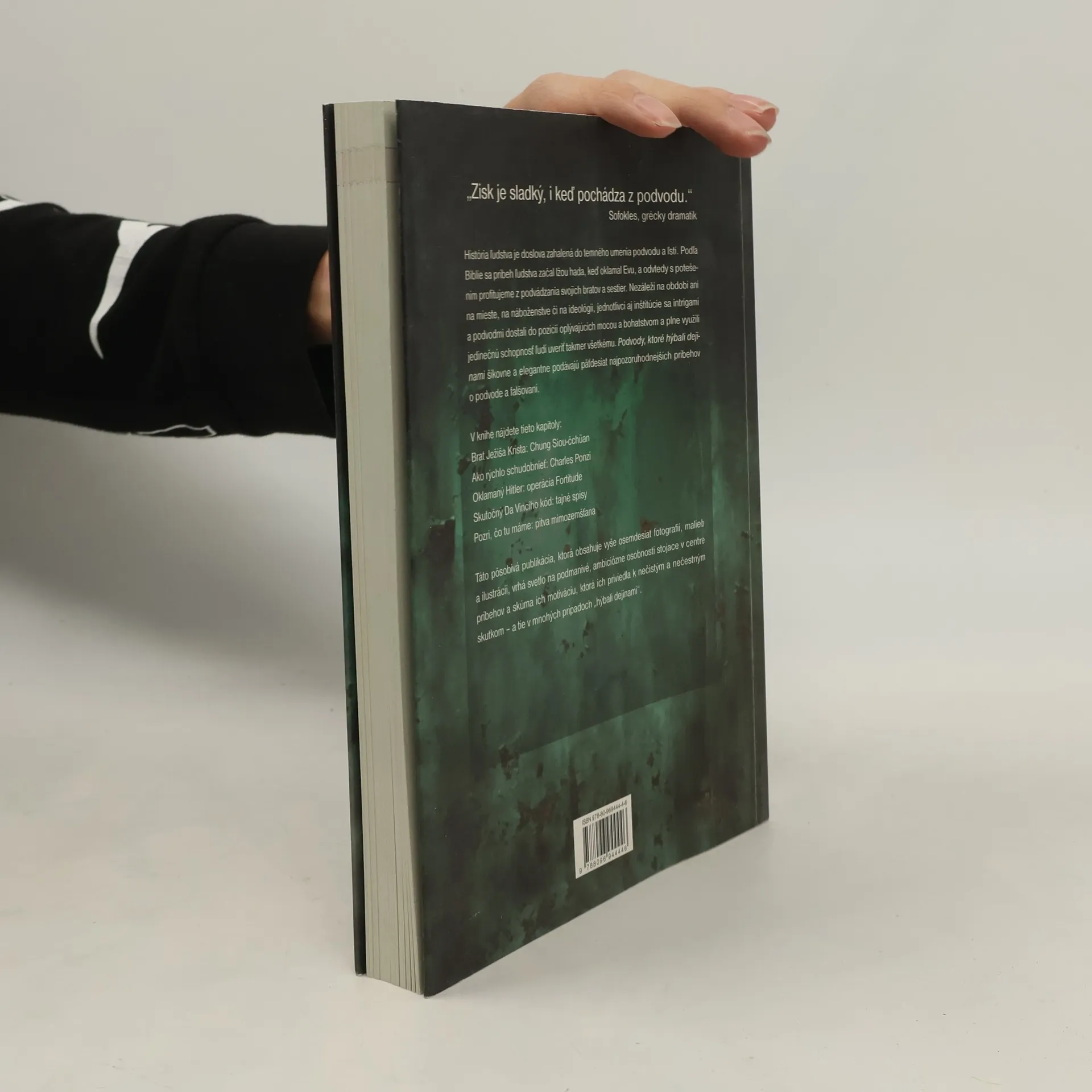 Kniha Podvody, ktoré hýbali dejinami prináša v chronologickom poradí najdôvtipnejšie a najzábavnejšie spôsoby, ako sa ľudia dokázali navzájom okabátiť a podviesť. V pozadí niektorých prípadov stojí finančný motív, ako napríklad v pyramídových hrách Charlesa Ponziho či Bernarda Madoffa. Inokedy vedci zmanipulovali dôkazy v planej nádeji, že dokážu svoje milované teórie; najúspešnejší umelci sfalšovali diela predošlých majstrov, aby zozbierali aspoň omrvinky ich slávy; iní podvodníci hľadali spôsob, ako skryť svoju bezvýznamnosť a nezaujímavý pôvod pod pláštikom požičaného mena. Táto pôsobivá publikácia, ktorá obsahuje vyše osemdesiat fotografií, malieb a ilustrácií, vrhá svetlo na podmanivé, ambiciózne osobnosti stojace v centre príbehov a skúma ich motiváciu, ktorá ich priviedla k nečistým a nečestným skutkom – a tie v mnohých prípadoch „hýbali dejinami“.
