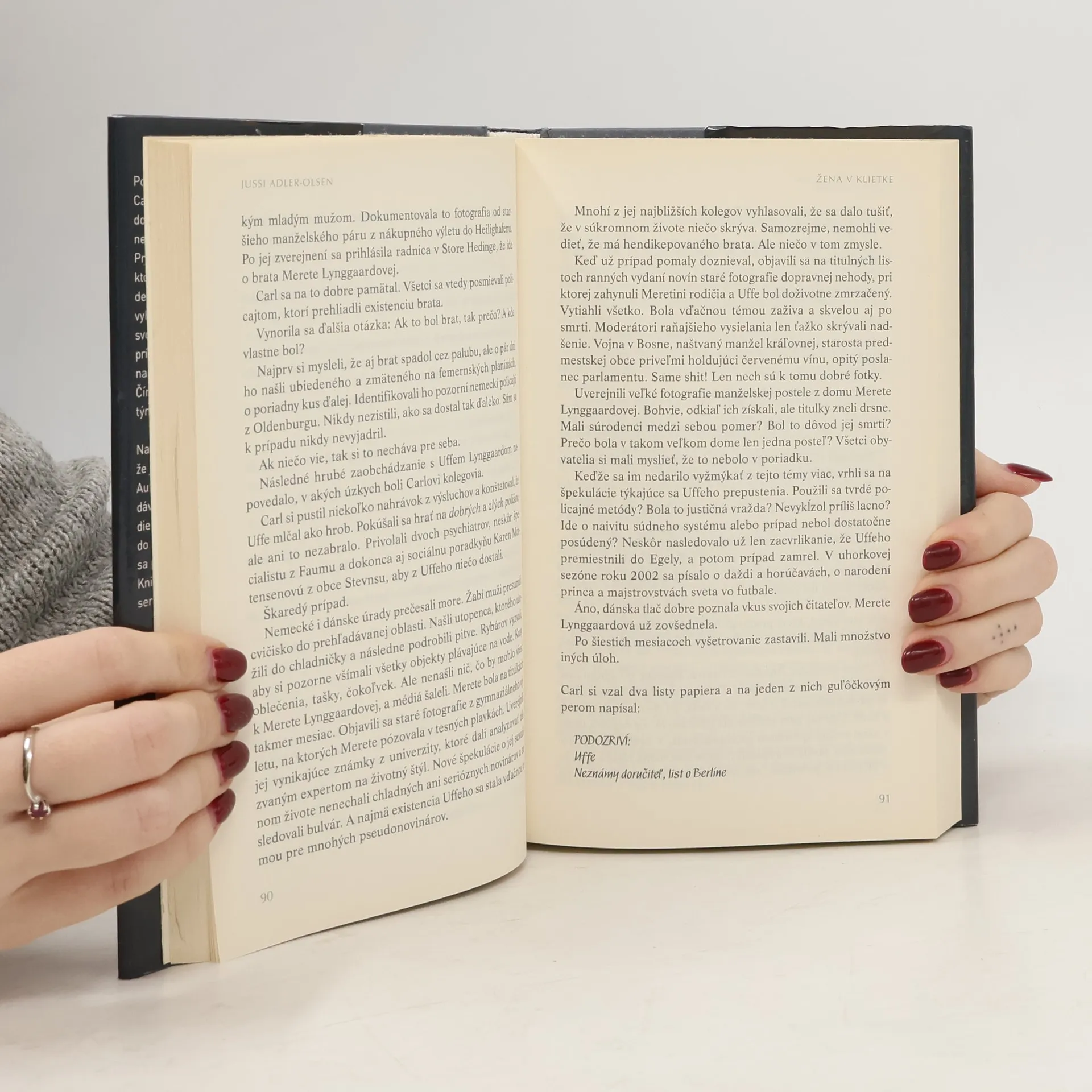Neobyčajne pútavý triler o bezbrannej žene, ktorá musí znášať utrpenie, o jednom tvrdohlavom kriminalistovi a o páchateľovi, ktorý nepozná zľutovanie. Napínavé čítanie a súčasne sonda do temných hlbín ľudskej duše. Po traumatickej udalosti, ktorú komisár Carla Morck prežil počas služby, ho preložili do nového Oddelenia Q, kde sa má zaoberať nevyšetrenými prípadmi z minulosti. Prípad mladej političky Merete Lynggaardovej, ktorá pred rokmi zmizla bez stopy, v ňom prebudí detektívne inštinkty, ktoré považoval za dávno vyhasnuté. Pri pátraní mu účinne pomáha svojrázny arabský prisťahovalec Asad, ktorého prítomnosť v príbehu je zdrojom multikultúrneho napätia i mnohých humorných situácií. Čím hlbšie Carl Morck preniká do prípadu, tým väčšie nezrovnalosti nachádza. Naozaj je možné, že tá žena ešte žije, že ju niekto väzní a týra na neznámom mieste? Autor sa pohráva s detailmi, s potešením dávkuje dej a na konci pozvoľna spája jednotlivé diely skladačky. Zápletka je zložitá, premyslená do najmenšieho detailu.