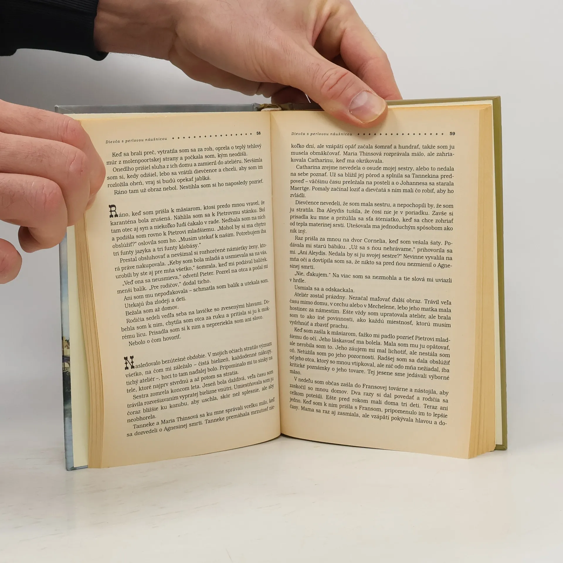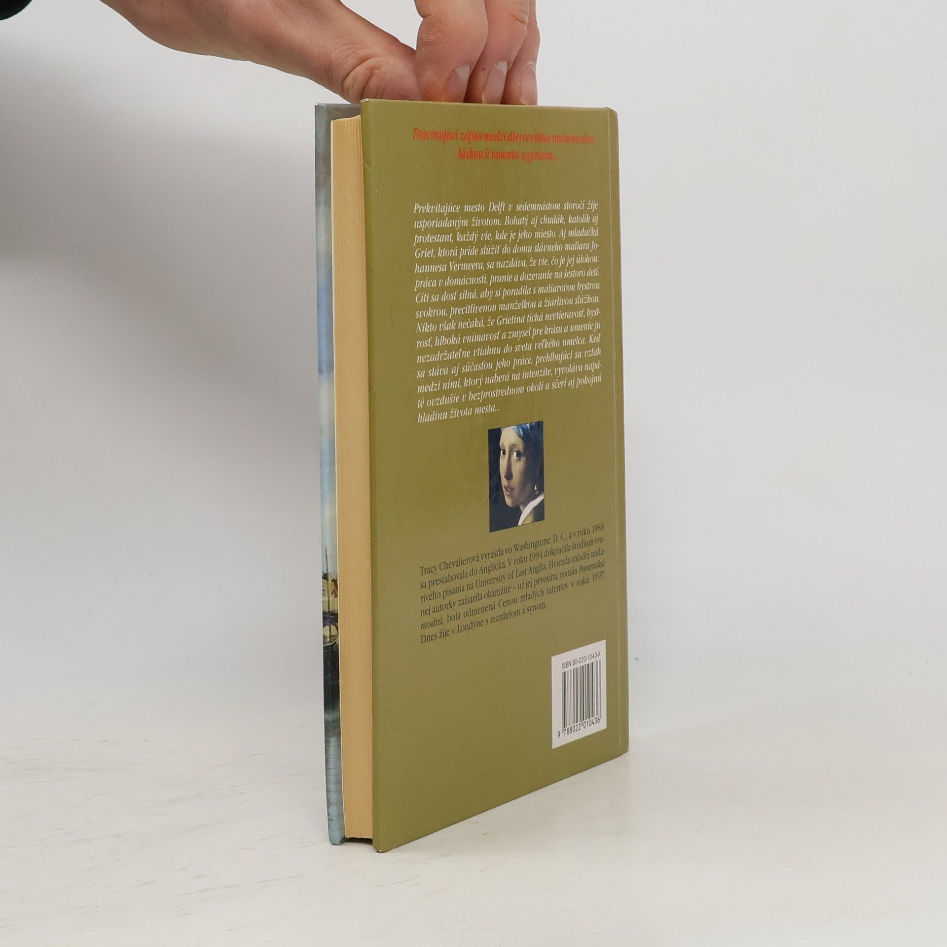 Román o zápase medzi nevinnosťou a láskou k umeniu i mužovi, napísaný podľa Vermeerovho známeho obrazu. Prekvitajúce mesto Delft v sedemnástom storočí žije usporiadaným životom. Bohatý aj chudák, katolík aj protestant, každý vie, kde je jeho miesto. Aj mladučká Griet, ktorá príde slúžiť do domu slávneho maliare Johannesa Vermeera, sa nazdáva, že vie, čo je jej úlohou: práca v domácnosti, pranie a dozeranie na šestoro detí. Cíti sa dosť silná, aby si poradila s maliarovou bystrou svokrou, precitlivelou manželkou a žiarlivou slúžkou. Nikto však nečaká, že Grietina tichá nevtieravosť, bystrosť, hlboká vnímavosť a zmysel pre krásu a umenie ju nezadržateľne vtiahnu do sveta veľkého umelca. Keď sa stáva aj súčasťou jeho práce, prehlbujúci sa vzťah medzi nimi, ktorý naberá na intenzite, vyvoláva napäté ovzdušie v bezprostrednom okolí a sčerí aj pokojnú hladinu života mesta...