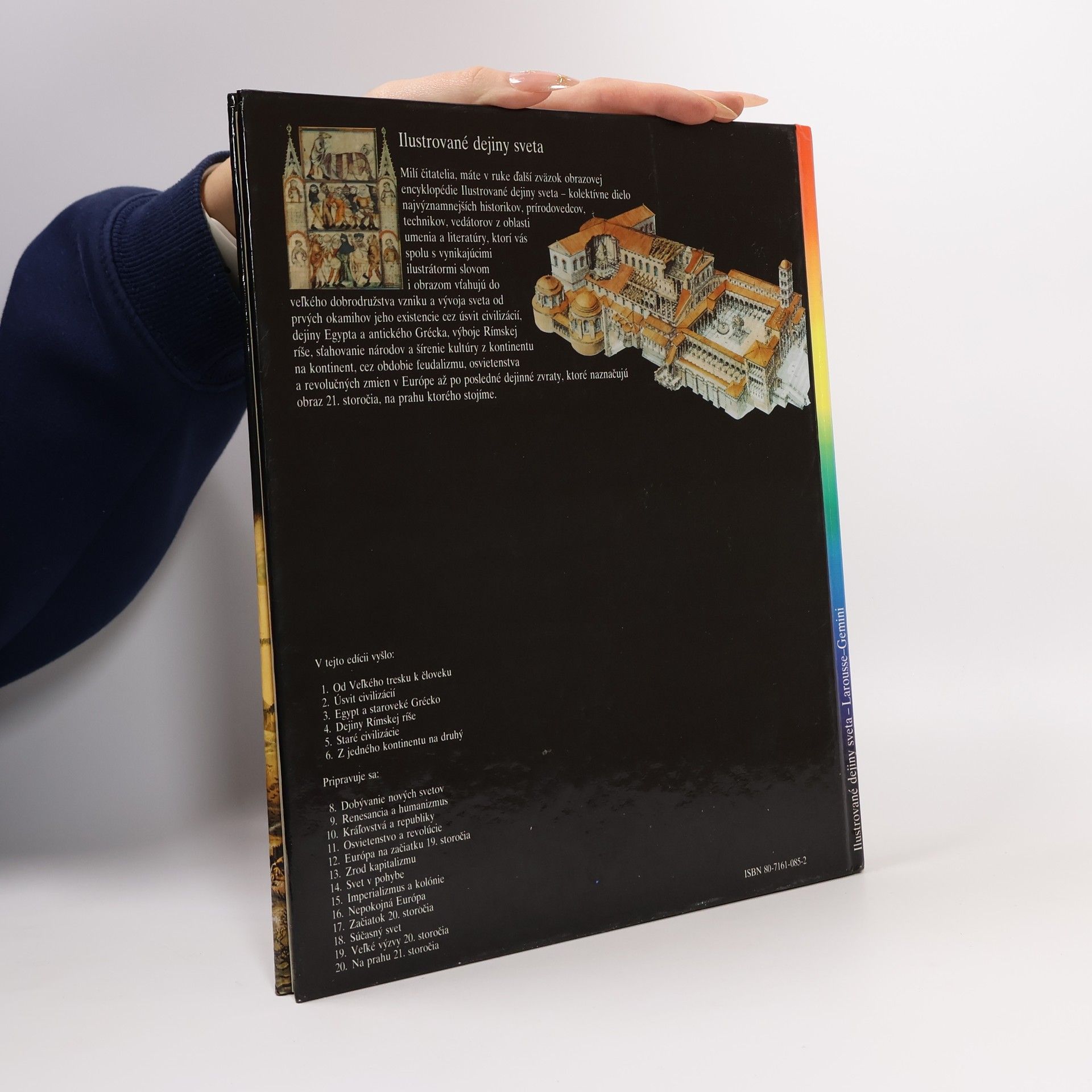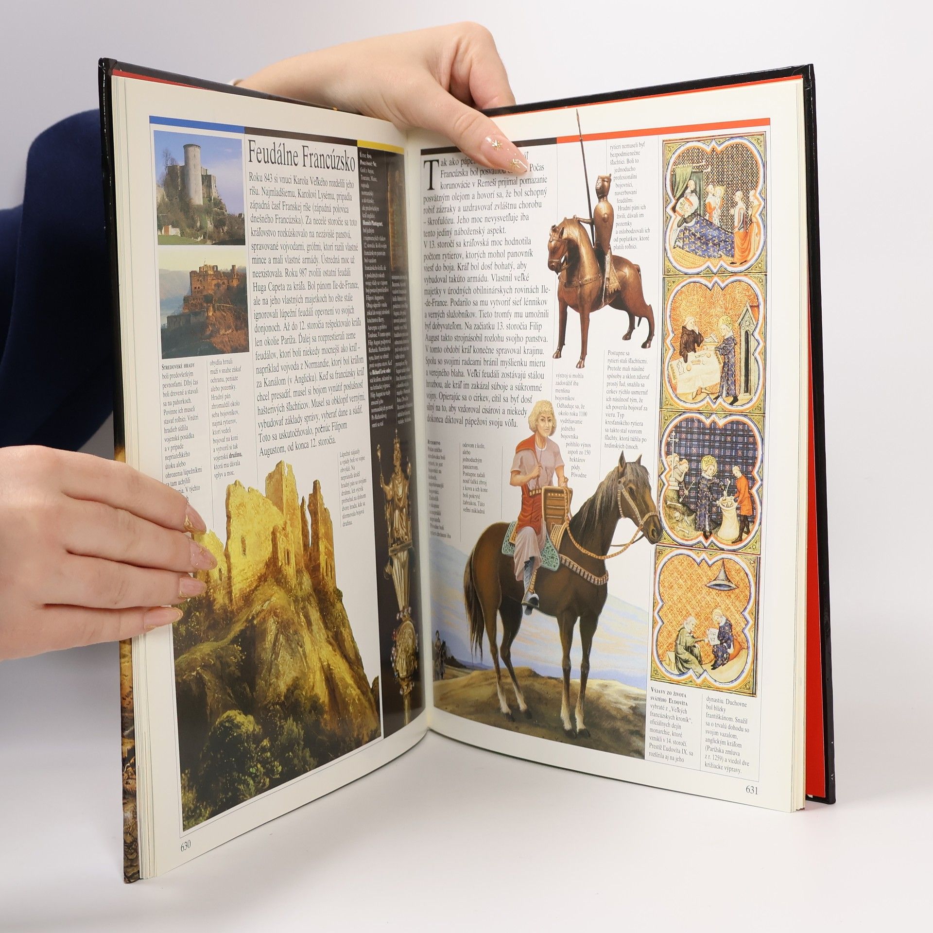 Kapitoly: V čase hradov-Dobytie pevnosti, Dvojitý charakter feudálnej moci, Pomalý pokrok, Vojna, Turnaje, Z poľovačky k stolu, Život na hrade, Európa hradov. Pútnici a križiaci-Sv. Jakub z Compostelly, Trojnásobné posvätné mesto Jeruzalem, Prvá križiacka výprava, Obrana Svätej zeme, Latinské štáty Východu, Akka, Križiacke výpravy Ľudovíta IX. Ľudové križiacke výpravy, Reconquista, Uctievanie relikvií. Vek katedrál-Opátstva a kláštory, Každodenný život v kláštore, Explózia románskeho umenia, Fantastické umenie sochárov, Gotická revolúcia, Katedrála, pýcha mesta, Obrázková kniha kresťanstva, Vývoj gotického štýlu. Klasický stredovek-Svätá ríša, Pápežstvo, Feudálne Francúzsko, Nadvláda Normanov, Feudálne mestá, Politické ideály, Mocní mešťania, Krehká rovnováha. Stredoveké mestá-Život v meste, Zablatené ulice, Bohatstvo miest, Námorný obchod, Sviatky a karneval, Univerzita, Metla moru. Mesto zrodené z vĺn-Zrod veľmoci, Republika v čase kráľov, Svetový trh, Arzenál, Vrchol slávy Benátok, Humanizmus, Včela a medvede, Súmrak benátskych bohov. Prvé vydanie.