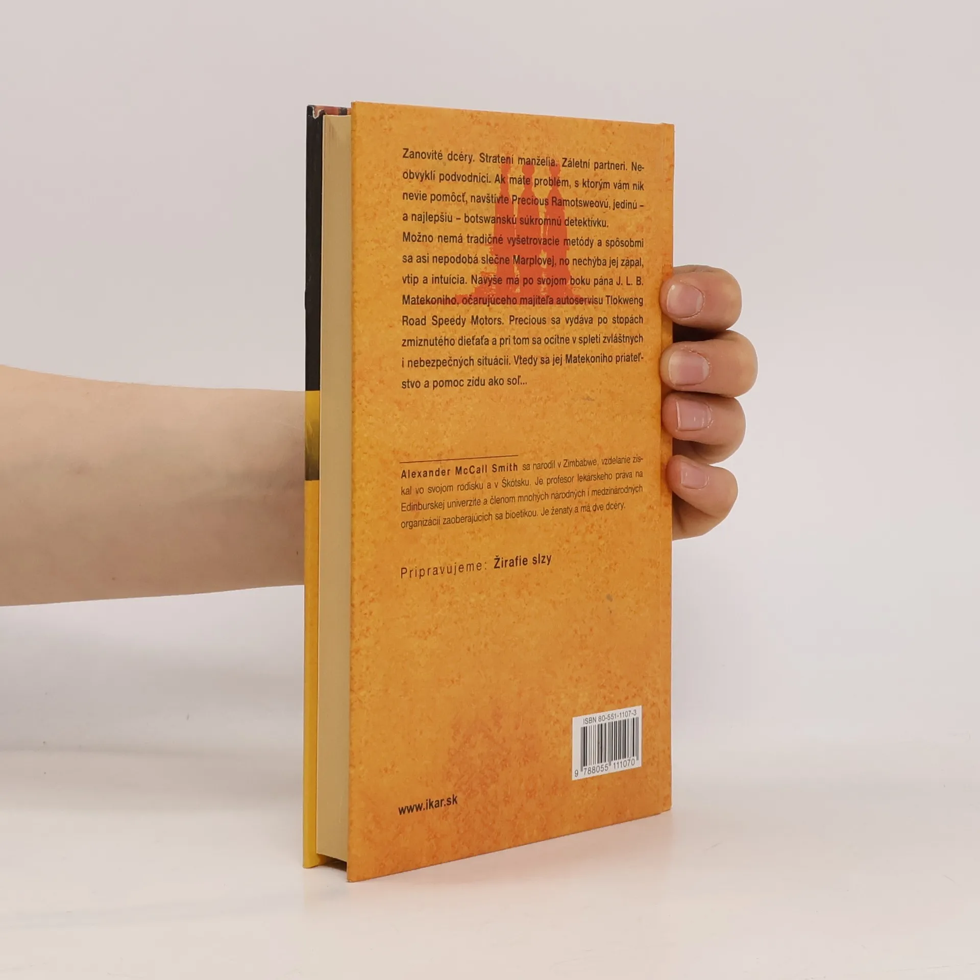 Zanovité dcéry. Stratení manželia. Záletní partneri. Neobvyklí podvodníci. Ak máte problém, s ktorým vám nik nevie pomôcť, navštívte Precious Ramotsweovú, jedinú – a najlepšiu – botswanskú súkromnú detektívku. Možno nemá tradičné vyšetrovacie metódy a spôsobmi sa asi nepodobá slečne Marplovej, no nechýba jej zápal, vtip a intuícia. Navyše má po svojom boku pána J. L. B. Matekoniho, očarujúceho majiteľa autoservisu Tlokweng Road Speedy Motors. Precious sa vydáva po stopách zmiznutého dieťaťa a pri tom sa ocitne v spleti zvláštnych i nebezpečných situácií. Vtedy sa jej Matekoniho priateľstvo a pomoc zídu ako soľ.