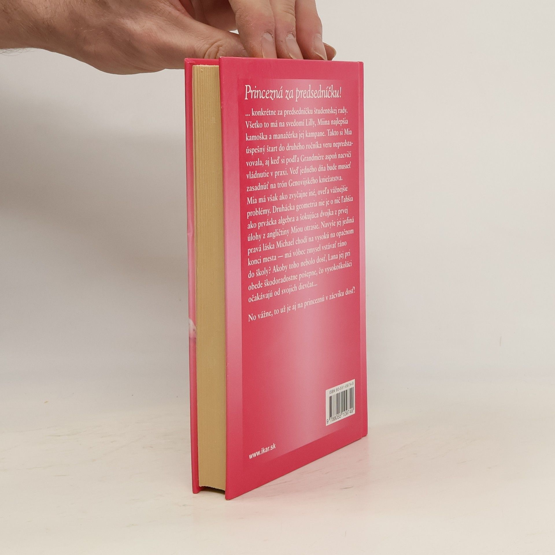 Princezná za predsedníčku! ... konkrétne za predsedníčku študentskej rady. Všetko to má na svedomí Lilly, Miina najlepšia kamoška a manažérka jej kampane. Takto si Mia úspešný štart do druhého ročníka veru nepredstavovala, aj keď si podľa Grandmére aspoň nacvičí vládnutie v praxi. Veď jedného dňa bude musieť zasadnúť na trón Genovijského kniežatstva. Mia má však ako zvyčajne iné, oveľa vážnejšie problémy. Druhácka geometria nie je o nič ľahšia ako prvácka algebra a šokujúca dvojka z prvej úlohy z angličtiny Miou otrasie. Navyše jej jediná pravá láska Michael chodí na vysokú na opačnom konci mesta – má vôbec zmysel vstávať ráno do školy? Akoby toho nebolo dosť, Lana jej pri obede škodoradostne pošepne, čo vysokoškoláci očakávajú od svojich dievčat... No vážne, to už je aj na princeznú v zácviku dosť!
