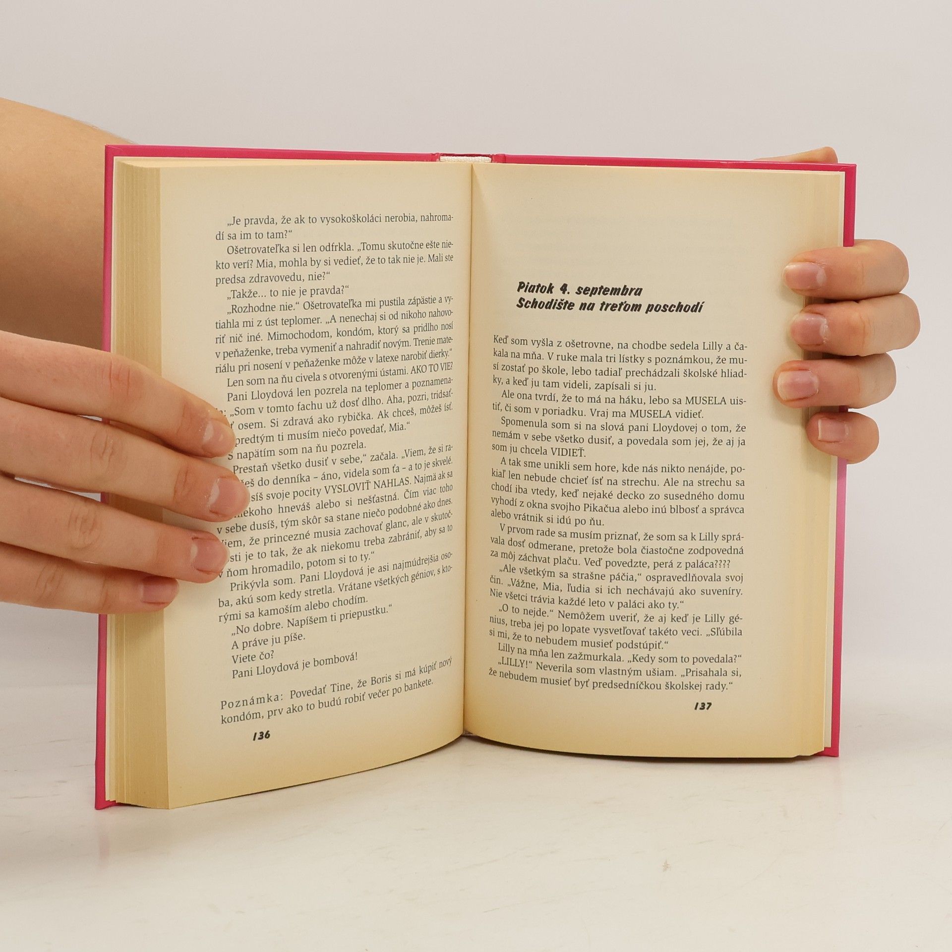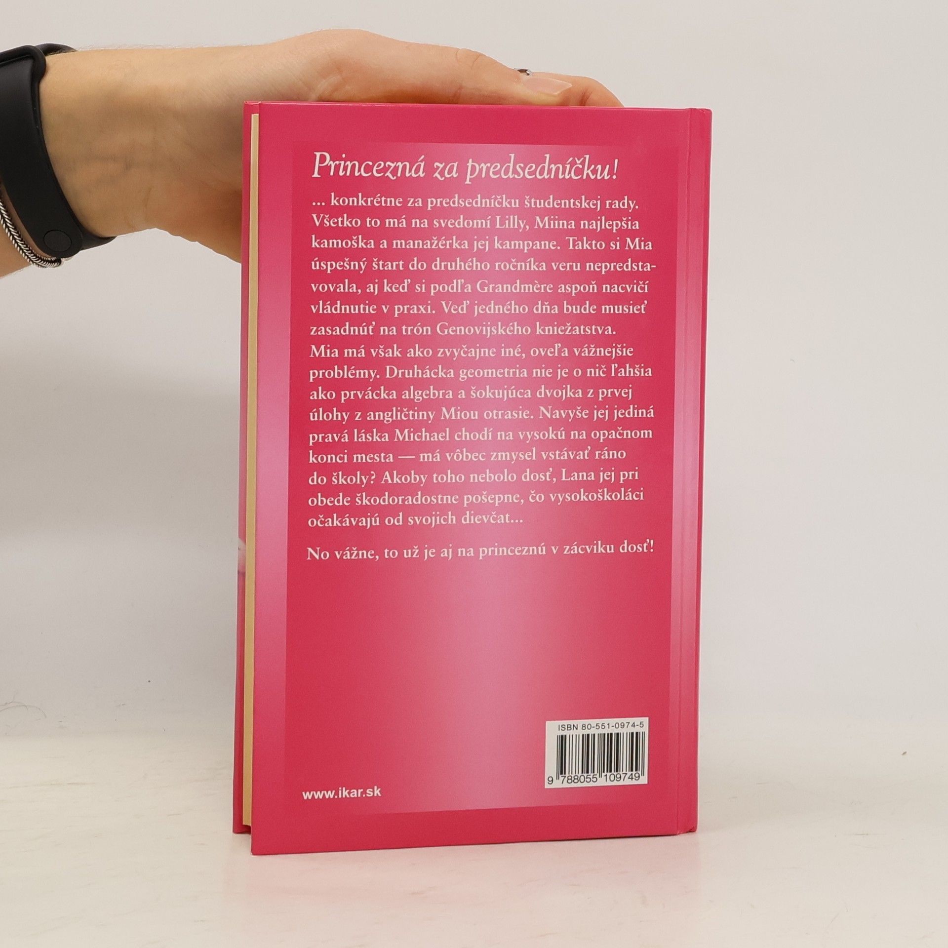 Princezná za predsedníčku! ... konkrétne za predsedníčku študentskej rady. Všetko to má na svedomí Lilly, Miina najlepšia kamoška a manažérka jej kampane. Takto si Mia úspešný štart do druhého ročníka veru nepredstavovala, aj keď si podľa Grandmére aspoň nacvičí vládnutie v praxi. Veď jedného dňa bude musieť zasadnúť na trón Genovijského kniežatstva. Mia má však ako zvyčajne iné, oveľa vážnejšie problémy. Druhácka geometria nie je o nič ľahšia ako prvácka algebra a šokujúca dvojka z prvej úlohy z angličtiny Miou otrasie. Navyše jej jediná pravá láska Michael chodí na vysokú na opačnom konci mesta – má vôbec zmysel vstávať ráno do školy? Akoby toho nebolo dosť, Lana jej pri obede škodoradostne pošepne, čo vysokoškoláci očakávajú od svojich dievčat... No vážne, to už je aj na princeznú v zácviku dosť!