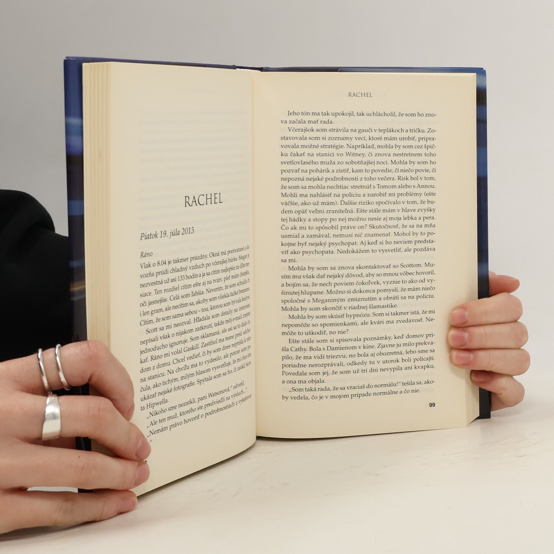 Príbeh čerstvo rozvedenej Ráchel býva často prirovnávaný ku Stratenému dievčaťu (The Gone Girl) alebo ku románu Dřív než půjdu spát. Rachel každé ráno cestuje tým istým vlakom do Londýna. Vie, že pri jednom návestidle spoj vždy zastaví a že si chvíľu môže prezerať domy s malými záhradkami. Dokonca má pocit, akoby obyvateľov jedného z nich už poznala. Volá ich Jess a Jason a ich život sa jej zdá dokonalý. Škoda, že ona nemala toľko šťastia. Rachelino manželstvo sa rozpadlo, nedávno prišla o prácu, býva v podnájme a každý deň predstiera, že chodí do roboty. Potom však uvidí niečo šokujúce - oznam v novinách, že „Jess“, pani dokonalá, je nezvestná - a odrazu sa všetko zmení. Rachel má konečne šancu stať sa súčasťou života, ktorý pozorovala len z diaľky, a ukázať, že je oveľa viac, ako iba dievča vo vlaku.