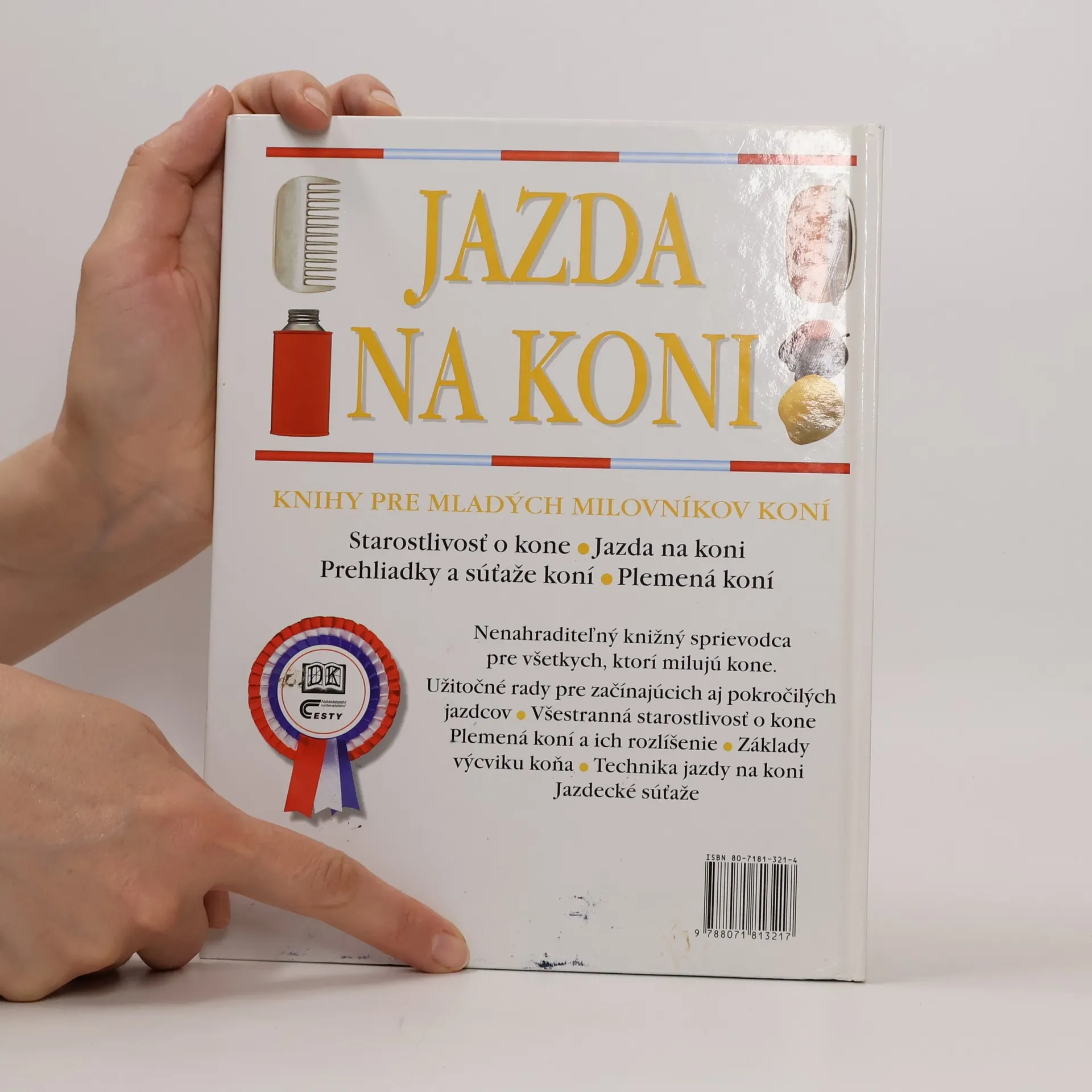 Nenahraditeľný knižný sprievodca pre všetkých, ktorí milujú kone. Užitočné rady pre začínajúcich aj pokročilých jazdcov. Všestranná starostlivosť o kone. Plemená koní a ich rozlíšenie. Základy výcviku koňa. Technika jazdy na koni. Jazdecké súťaže. Kapitoly: Začínaš, Uzdenie a sedlanie koňa, Nasadanie a zosadanie, V sedle, Prvé kroky, Klus, Výcvik v sedle, Cval a trysk, Pre pokročilých, Učíš sa skákať, Vychádzky do terénu, Pre pokročilých, Skákanie pre pokročilých, Westernové jazdenie, Pomáhaš pri výcviku, Ťažko ovládateľné kone, Dovolenka v sedle, Prvá pomoc a zásady bezpečnosti. Prvé vydanie.