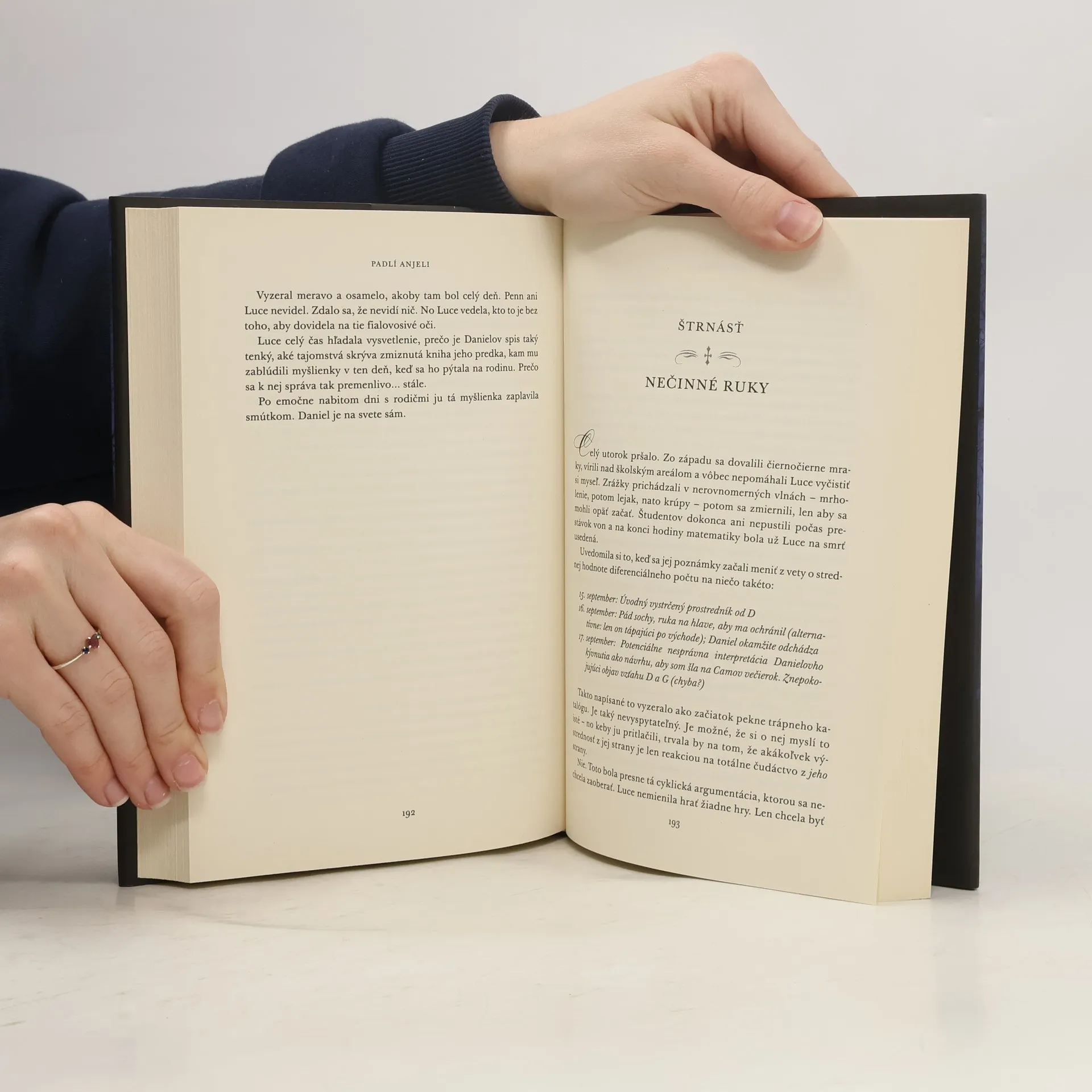Na Danielovi Grigorim je čosi bolestne známe. Tajomný, uzavretý chlapec pritiahne pozornosť sedemnásťročnej Luce Priceovej hneď v jej prvý deň na internátnej škole Meč a kríž pri meste Savannah. Je jediným svetlým bodom na mieste, kde nie sú dovolené mobilné telefóny, ostatní študenti sú vyšinutí a bezpečnostné kamery ich sledujú na každom kroku. Daniel však nechce mať s Luce nič spoločné – a dáva jej to jasne najavo. No ona sa nevzdáva. Mládenec ju priťahuje ako svetlo nočného motýľa a Luce musí zistiť, čo pred ňou tak zúfalo skrýva... aj keby ju to malo stáť život. Nebezpečne vzrušujúci a temne romantický triler PÁD je súčasne najúžasnejším príbehom lásky!