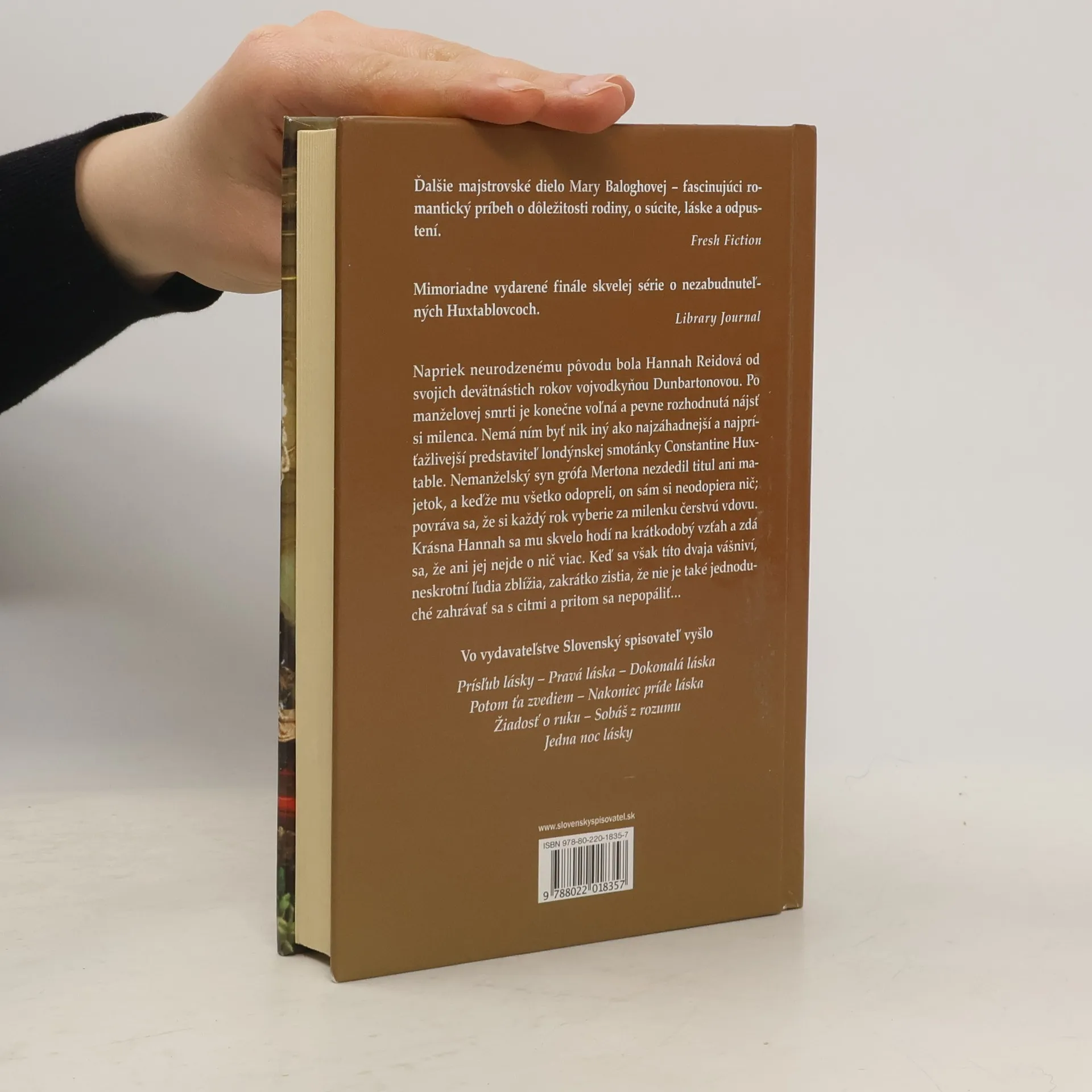 Fascinujúci romantický príbeh, ktorý uzatvára skvelú sériu o rode Huxtablovcov. Hannah Reidová je po smrti svojho manžela vojvodu Dunbartona rozhodnutá nájsť si milenca. Nemá ním byť nik iný ako záhadný Constantine Huxtable. Nemanželský syn grófa Mertona nezdedil titul ani majetok, a keďže mu všetko odopreli, on sám si neodopiera nič: povráva sa, že si na svojom statku užíva zmyselné rozkoše a každý rok si vyberie za milenku čerstvú vdovu. Krásna Hannah sa mu skvelo hodí na krátkodobý vzťah a zdá sa, že ani jej nejde o nič viac...