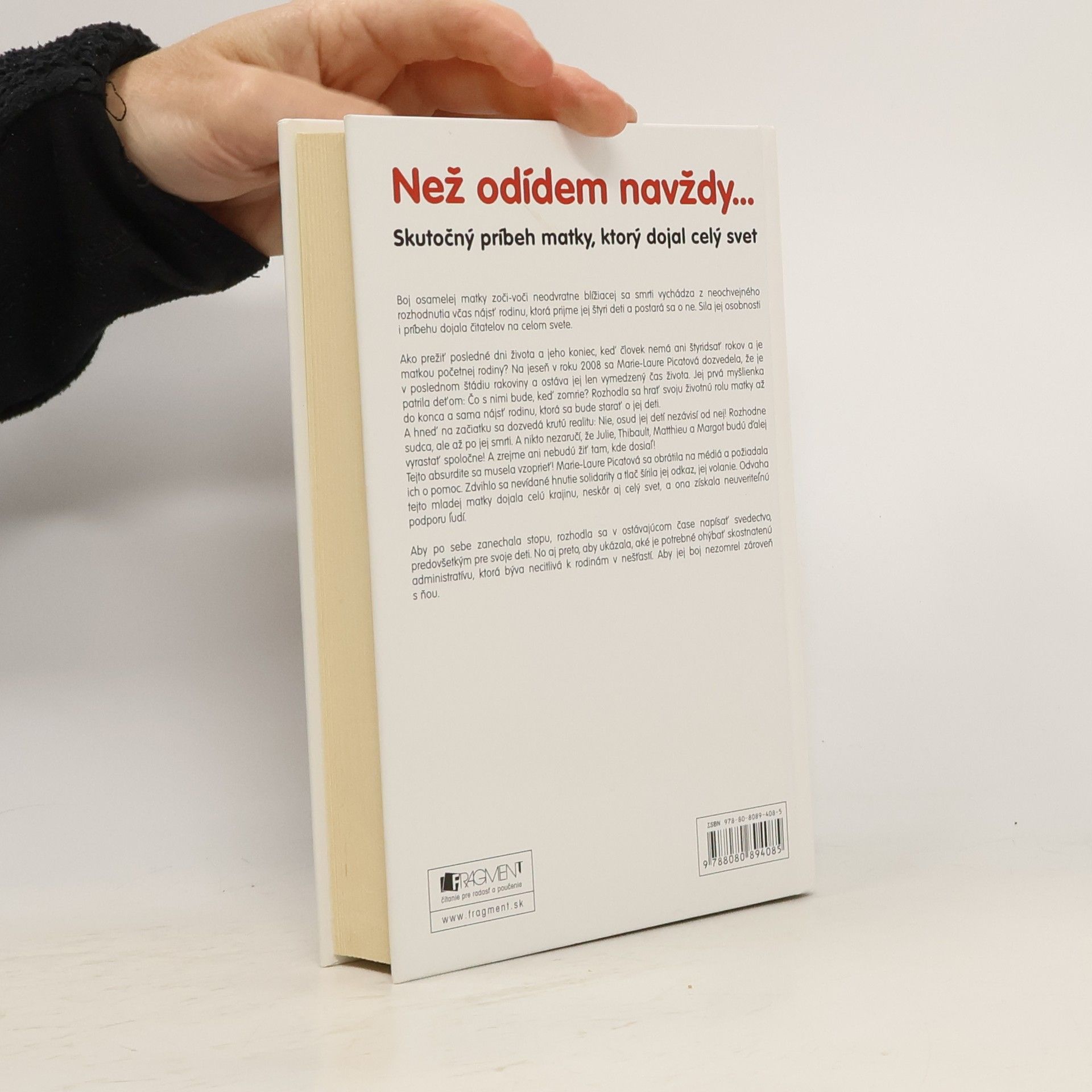 Boj osamelej matky zoči-voči neodvratne blížiacej sa smrti vychádza z neochvejného rozhodnutia včas nájsť rodinu, ktorá prijme jej štyri deti a postará sa o ne. Sila jej osobnosti i príbehu dojala čitateľov na celom svete. Teraz jej príbeh prichádza na Slovensko. Ako prežiť posledné dni života a jeho koniec? Čo robiť, keď ešte nemáte ani štyridsať rokov a ste matkou početnej rodiny? Jeseň 2008. Marie-Laure Picatová zisťuje nekompromisnú diagnózu – rakovina v poslednom klinickom štádiu. Ostáva jej len vymedzený čas života. Jej prvá myšlienka okamžite patrí deťom: Čo s nimi bude, keď zomrie? Nie, teraz sa nemôže zosypať! Marie-Laure musí hrať svoju životnú rolu matky až do konca, a preto sa rozhodne sama nájsť rodinu, ktorá sa bude starať o jej deti... Hneď na začiatku sa Picatová dozvedá krutú realitu: Osud jej detí nezávisí od nej! Rozhodne pridelený sudca, a to dokonca až po jej smrti. A nikto nezaručí, že Julie, Thibault, Matthieu a Margot budú naďalej vyrastať spoločne...