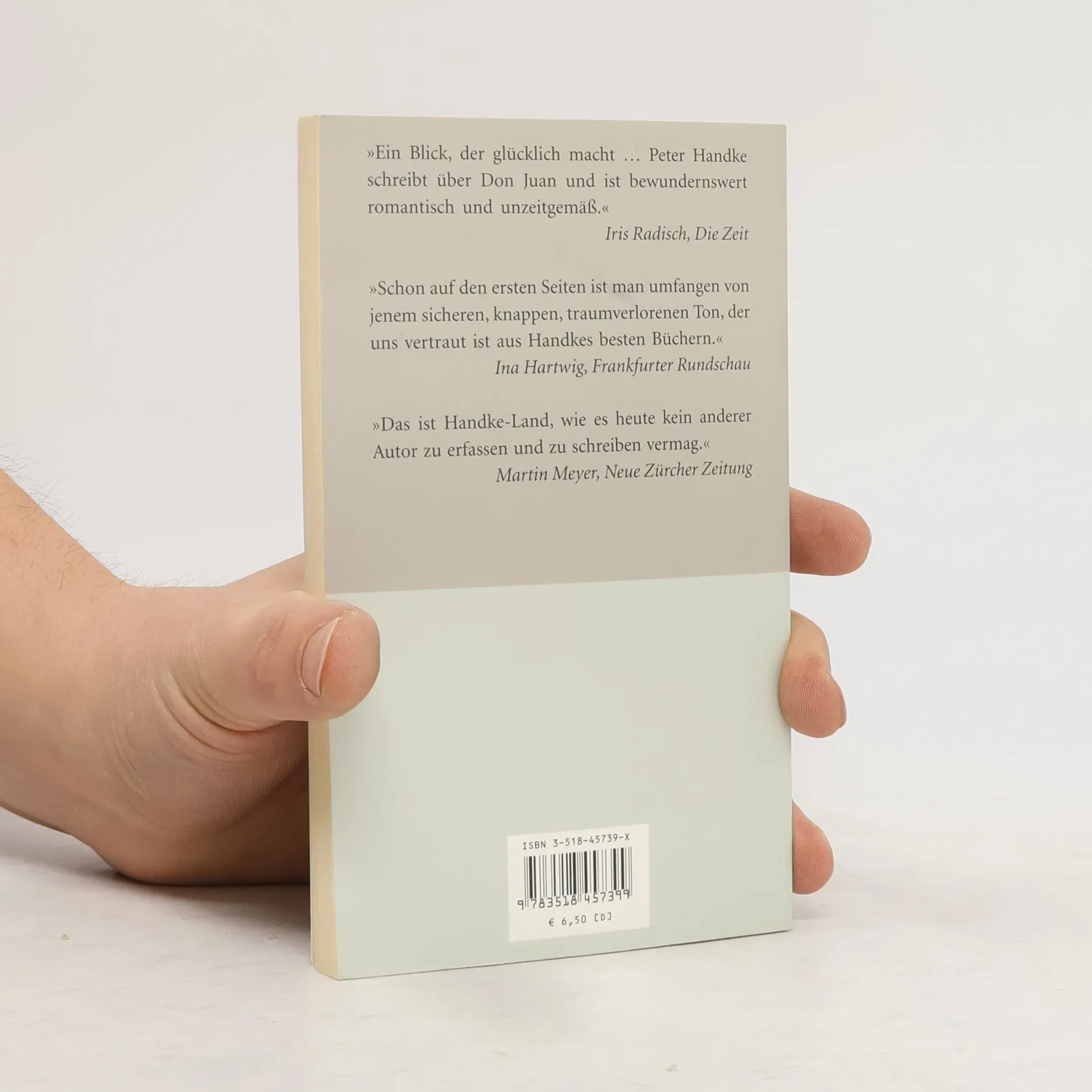 Peter Handke erzählt nichts weniger als »die endgültige und die einzig wahre Geschichte Don Juans«. Genauer gesagt: Er läßt Don Juan selbst erzählen, sieben Tage lang in einem Maigarten nahe Port-Royal-des-Champs, und nur ab und an findet sich ein Kommentar desjenigen, dem die Abenteuer der vergangenen sieben Tage vorgetragen werden. Dieser Zuhörer bezeugt, daß all die Don Juans im Fernsehen, in der Oper, im Theater oder auch im »primären Leben« die falschen sind. »Don Juan ist ein anderer. Ich sah ihn als einen, der treu war – die Treue in Person.« Das heißt nun nicht, daß die Geschichten mit Frauen, Geschichten von geglückten Begegnungen und geglückten Abschieden, ausgeblendet bleiben, im Gegenteil: An jeder Station der Reise, die Don Juan zunächst zu einer Hochzeit in den Kaukasus führt, dann nach Damaskus, am dritten Tag in die nordafrikanische Enklave von Ceüta, weiter auf einen Bootssteg in einem Fjord bei Bergen, zu einer Düne in Holland … überall trifft er Frauen, mit denen er, energisch trauernd, in eine Zeit des großen Innehaltens eintauchen kann, in eine Zeit, in der Augenblick und Ewigkeit in eins fallen.