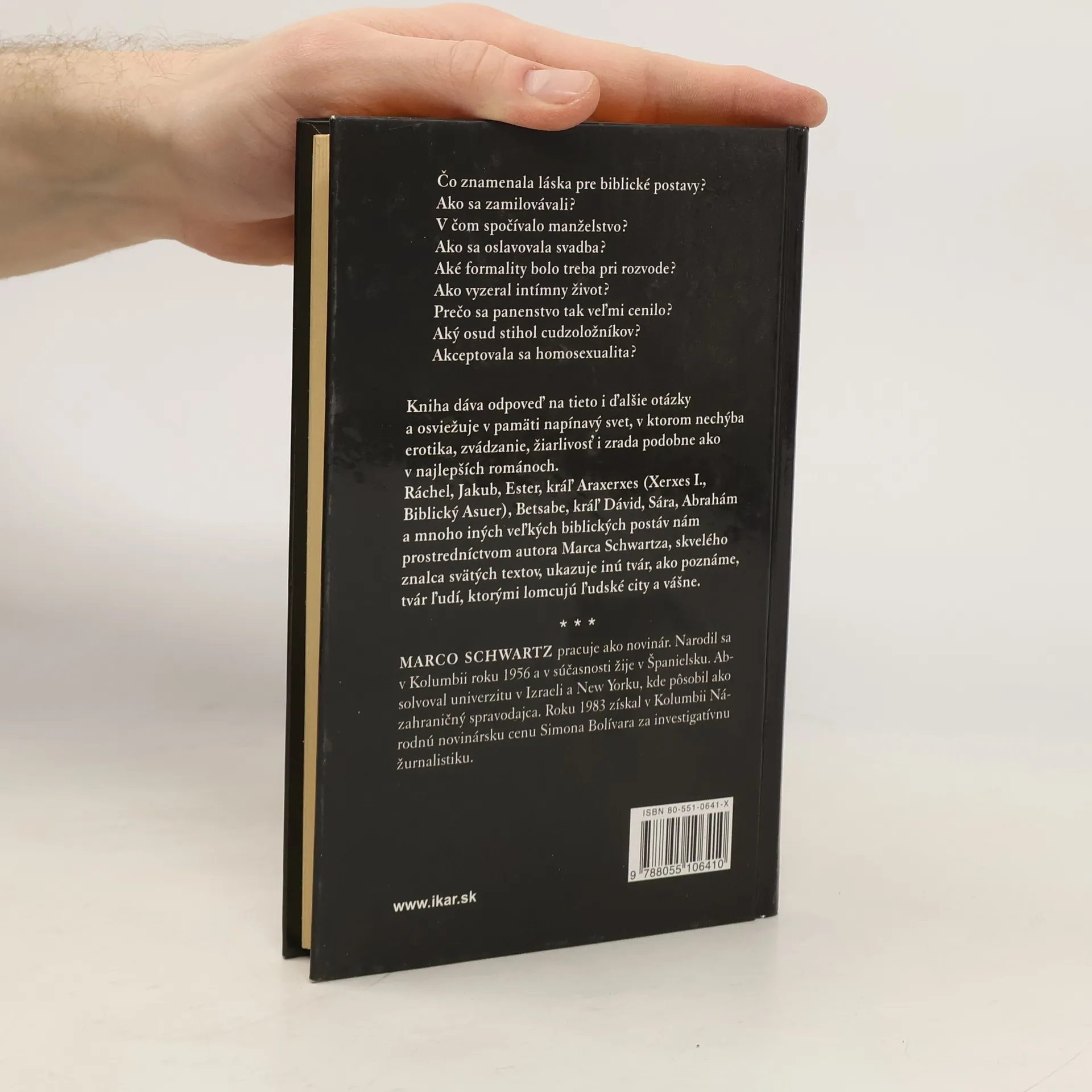 Čo znamenala láska pre biblické postavy? Ako sa zamilovávali? V čom spočívalo manželstvo? Ako sa oslavovala svadba? Aké formality bolo treba pri rozvode? Ako vyzeral intímny život? Prečo sa panenstvo tak veľmi cenilo? Aký osud stihol cudzoložníkov? Akceptovala sa homosexualita? Kniha dáva odpoveď na tieto i ďalšie otázky a osviežuje v pamäti napínavý svet, v ktorom nechýba erotika, zvádzanie, žiarlivosť i zrada podobne ako v najlepších románoch. Ráchel, Jakub, Ester, kráľ Araxerxes (Xerxes I., Biblický Asuer), Betsabe, kráľ Dávid, Sára, Abrahám a mnoho iných veľkých biblických postáv nám prostredníctvom autora Marca Schwartza, skvelého znalca svätých textov, ukazuje inú tvár, ako poznáme, tvár ľudí, ktorými lomcujú ľudské city a vášne. MARCO SCHWARTZ pracuje ako novinár. Narodil sa v Kolumbii roku 1956 a v súčasnosti žije v Španielsku. Absolvoval univerzitu v Izraeli a New Yorku, kde pôsobil ako zahraničný spravodajca. Roku 1983 získal v Kolumbii Národnú novinársku cenu Simona Bolívara za investigatívnu žurnalistiku.
