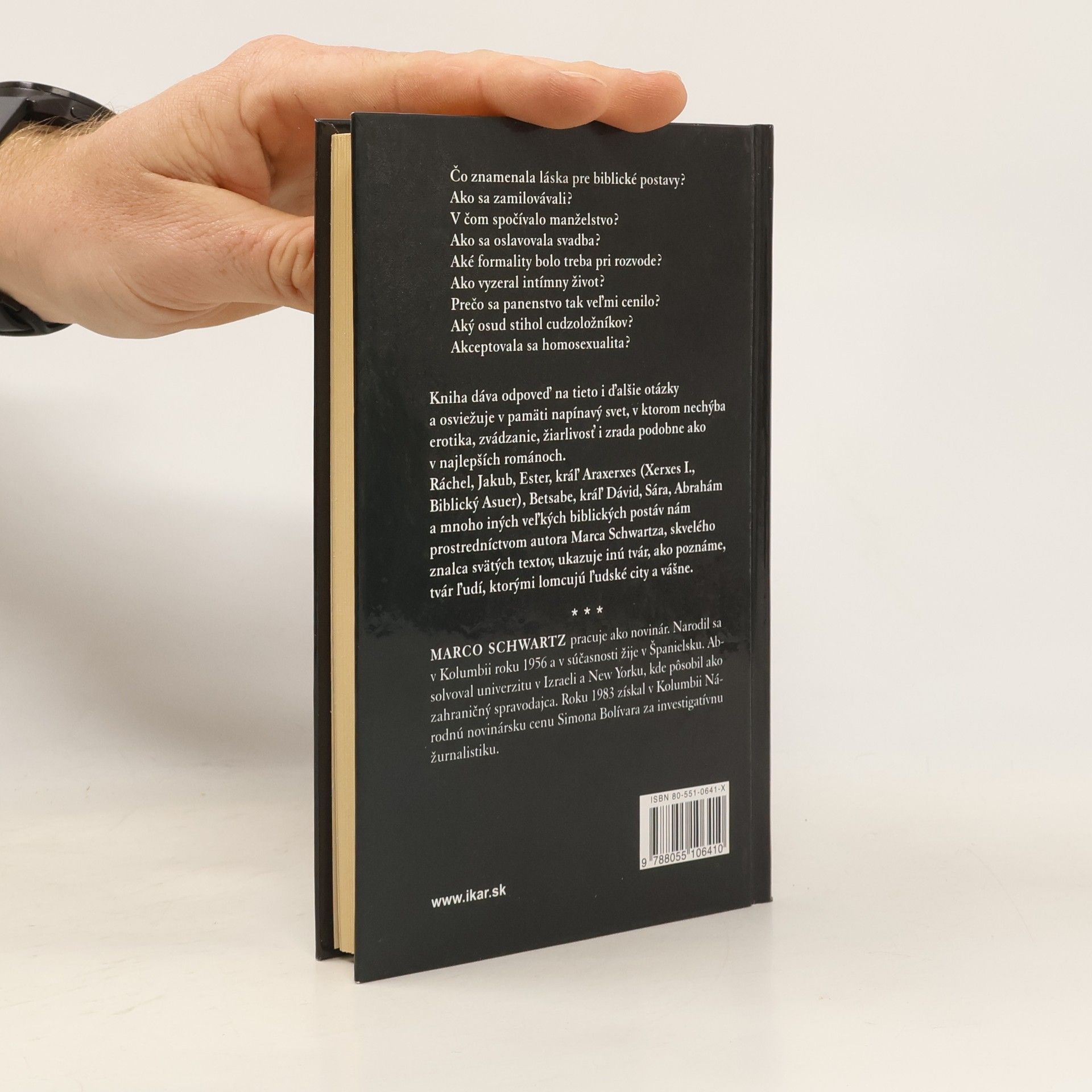 Čo znamenala láska pre biblické postavy? Ako sa zamilovávali? V čom spočívalo manželstvo? Ako sa oslavovala svadba? Aké formality bolo treba pri rozvode? Ako vyzeral intímny život? Prečo sa panenstvo tak veľmi cenilo? Aký osud stihol cudzoložníkov? Akceptovala sa homosexualita? Kniha dáva odpoveď na tieto i ďalšie otázky a osviežuje v pamäti napínavý svet, v ktorom nechýba erotika, zvádzanie, žiarlivosť i zrada podobne ako v najlepších románoch. Ráchel, Jakub, Ester, kráľ Araxerxes (Xerxes I., Biblický Asuer), Betsabe, kráľ Dávid, Sára, Abrahám a mnoho iných veľkých biblických postáv nám prostredníctvom autora Marca Schwartza, skvelého znalca svätých textov, ukazuje inú tvár, ako poznáme, tvár ľudí, ktorými lomcujú ľudské city a vášne. MARCO SCHWARTZ pracuje ako novinár. Narodil sa v Kolumbii roku 1956 a v súčasnosti žije v Španielsku. Absolvoval univerzitu v Izraeli a New Yorku, kde pôsobil ako zahraničný spravodajca. Roku 1983 získal v Kolumbii Národnú novinársku cenu Simona Bolívara za investigatívnu žurnalistiku.