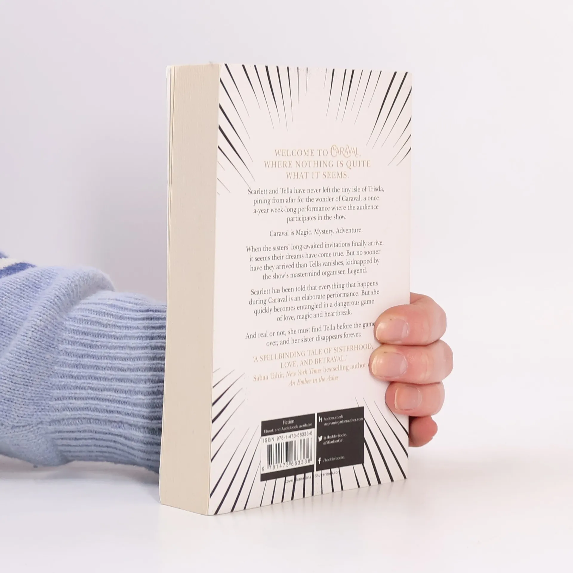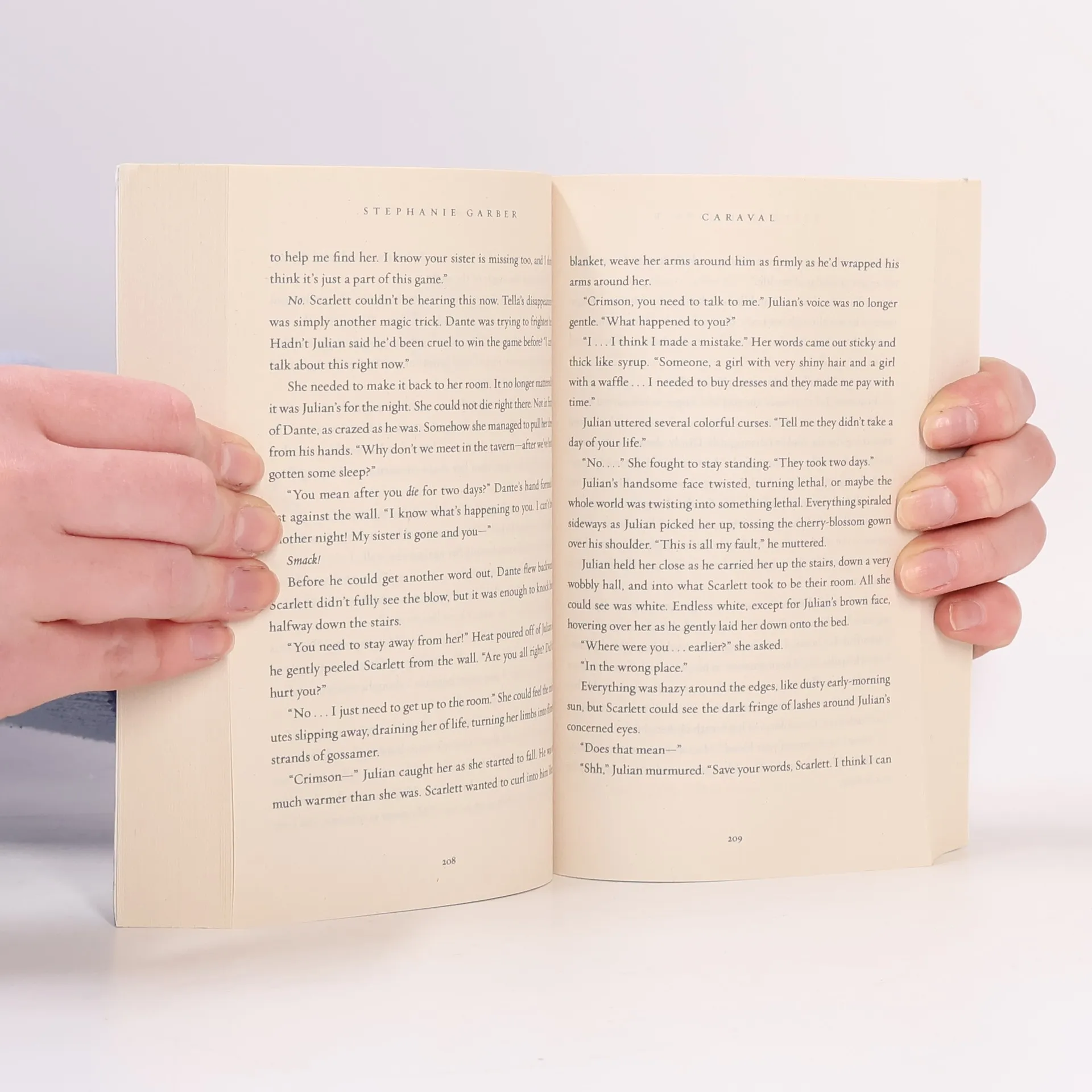 Scarlett has never left the tiny island where she and her beloved sister, Tella, live with their ruthless father. Now Scarlett's father has arranged a marriage for her, and Scarlett thinks her dreams of seeing Caraval, the legendary, once-a-year performance where the audience participates in the show, are over. But this year, Scarlett's long-dreamt-of invitation finally arrives. With the help of a mysterious sailor who she has just met, Tella whisks Scarlett away to the show. Only, as soon as they arrive, Tella is kidnapped by Caraval's mastermind organizer, Legend. It turns out that this season's Caraval revolves around Tella, and whoever finds her first is the winner