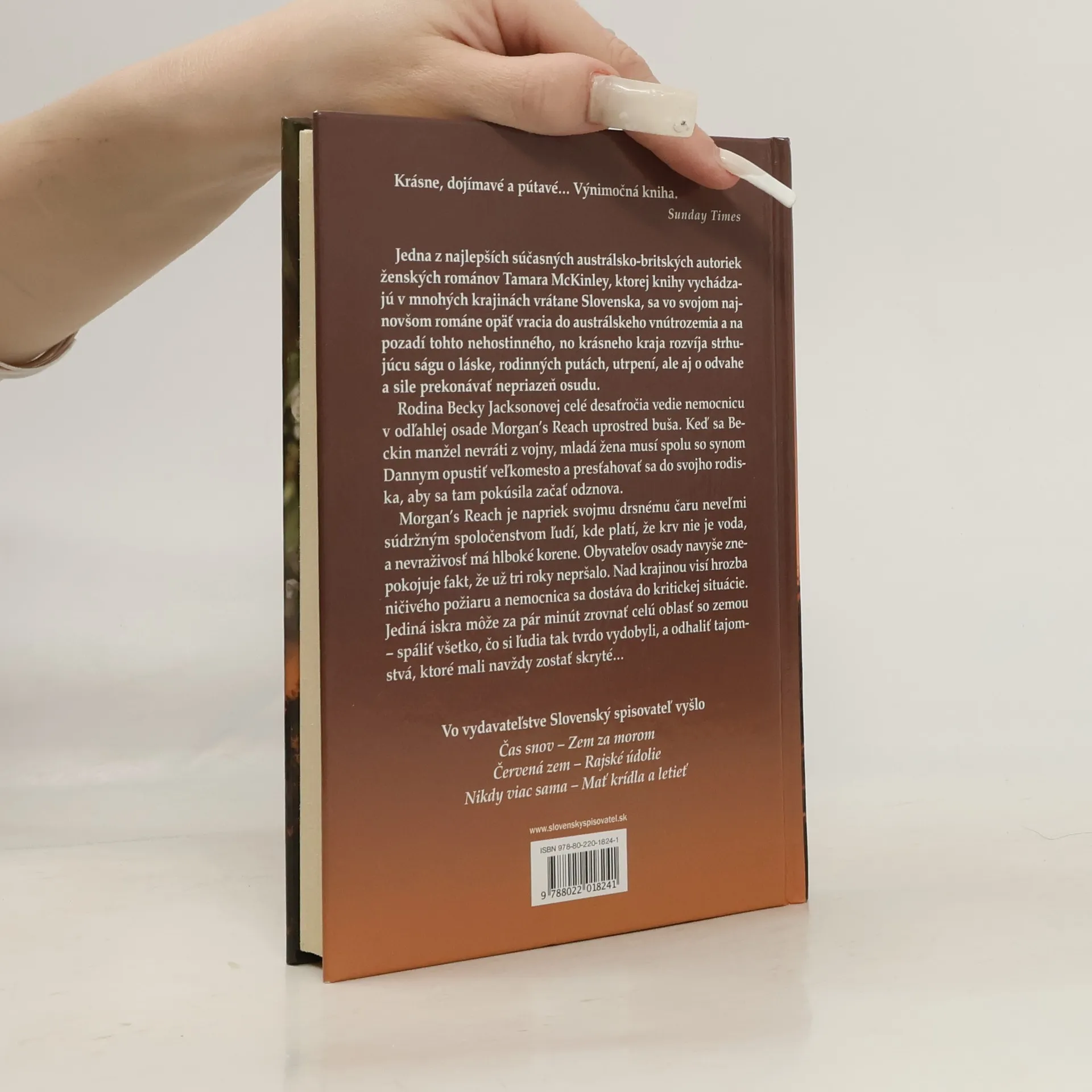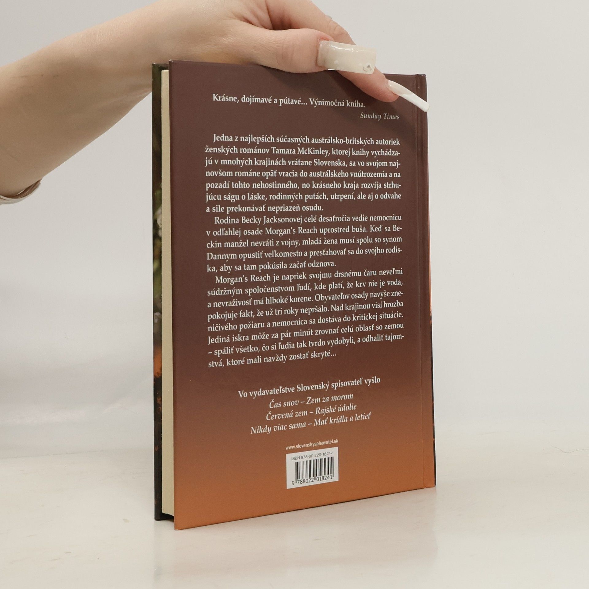 Strhujúca rodinná sága z austrálskeho vnútrozemia. Rodina Becky Jacksonovej celé desaťročia vedie nemocnicu v osade Morgan´s Reach uprostred buša. Keď sa Beckin manžel nevráti z vojny, mladá žena sa spolu so synom Dannym presťahuje do svojho rodiska a pokúsi sa začať odznova. V tomto drsno-krásnom kraji však už tri roky nepršalo. Nad krajinou visí hrozba ničivého požiaru. Jediná iskra môže za pár minút spáliť všetko, čo si ľudia tvrdo vydobyli, a odhaliť tajomstvá, ktoré mali navždy zostať skryté...