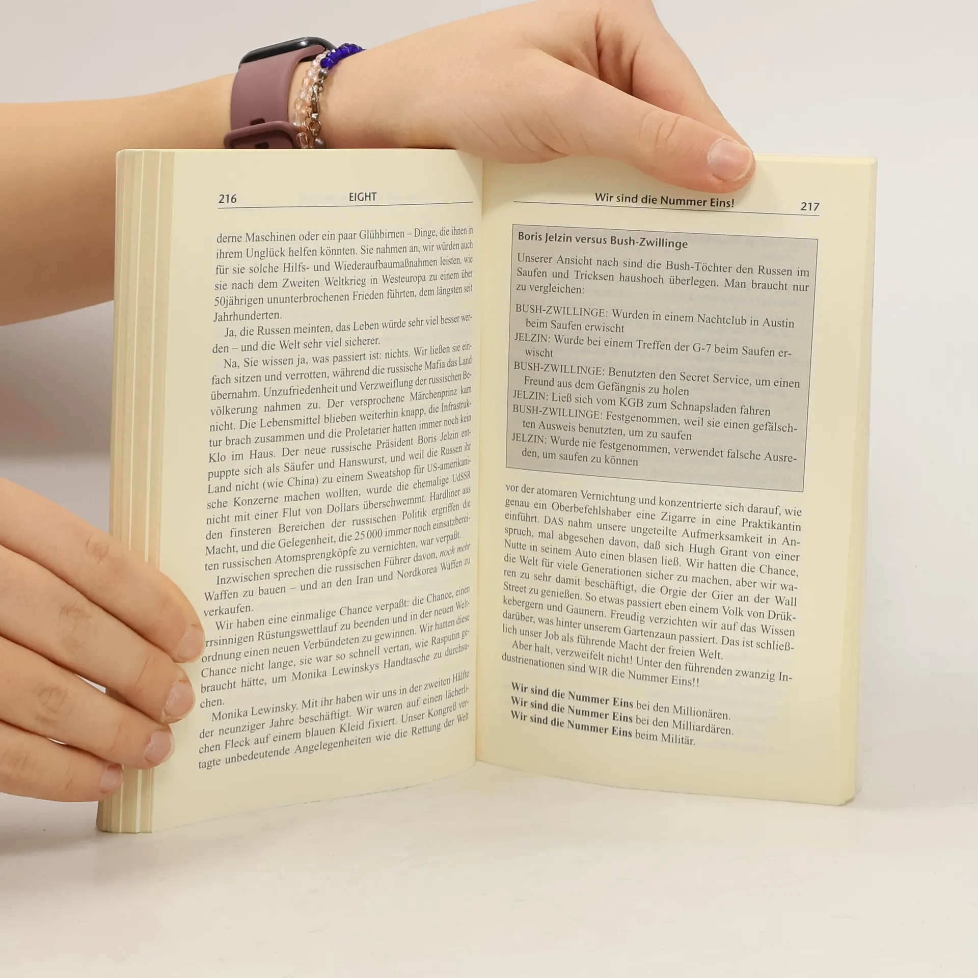 Bananenrepublik USA: Im weißen Haus sitzt 'Baby Bush mit seiner Kamarilla', ein Präsident, der nie gewählt wurde, und der regieren läßt - hauptsächlich von Geschäftsfreunden seines Vaters. Die Lage der Nation ist entsprechend: die Außenpolitik eine Serie von haarsträubenden Fehlentscheidungen, die Börse entpuppt sich als eine Spielwiese für Betrüger, viele Anleger sind ruiniert, die Wirtschaft auf Talfahrt. In dieser Abrechnung voll boshaftem Witz zeigt Michael Moore, was alles schief läuft in der einzig noch verbliebenen Weltmacht USA. Er schont dabei nichts und niemanden, zeigt die Schwächen des politischen Systems ebenso auf wie die Auswirkungen des ungebremsten Kapitalismus. Michael Moore gelingt es eine seltene Mischung aus knallhartem politischen Buch und witziger Satire, die niemanden gleichgültig läßt.