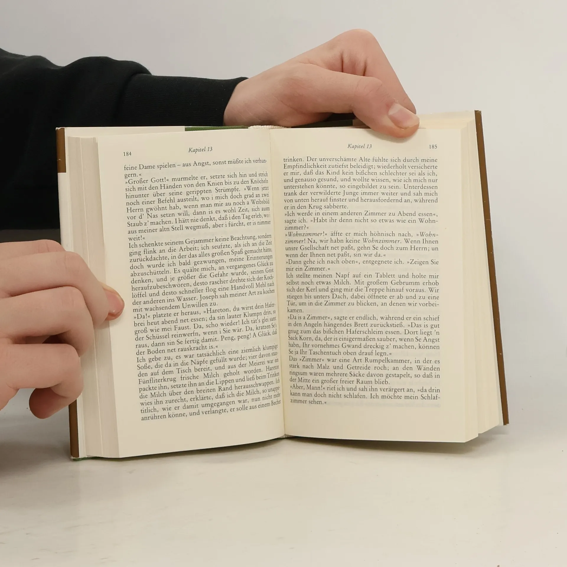 Gleich darauf setzte draussen ein leises Kratzen ein, und der Bücherstapel bewegte sich, als würde er von hinten geschoben. Ich wollte aufspringen, konnte aber kein Glied rühren und schrie, in wahnsinnigem Entsetzen, laut auf. Zu meiner Bestürzung bemerkte ich, dass ich mir den Schrei nicht nur eingebildet hatte. Hastige Schritte näherten sich der Tür zu meinem Zimmer, jemand stiess sie mit kräftiger Hand auf, und ein Lichtschein fiel durch die viereckigen Öffnungen oben an meinem Bett. Ich sass noch schaudernd da und wischte mir den Schweiss von der Stirn. Der Eindringling schien zu zögern und murmelte etwas vor sich hin. Schliesslich fragte er fast flüsternd und offensichtlich, ohne eine Antwort zu erwarten: Ist hier jemand?