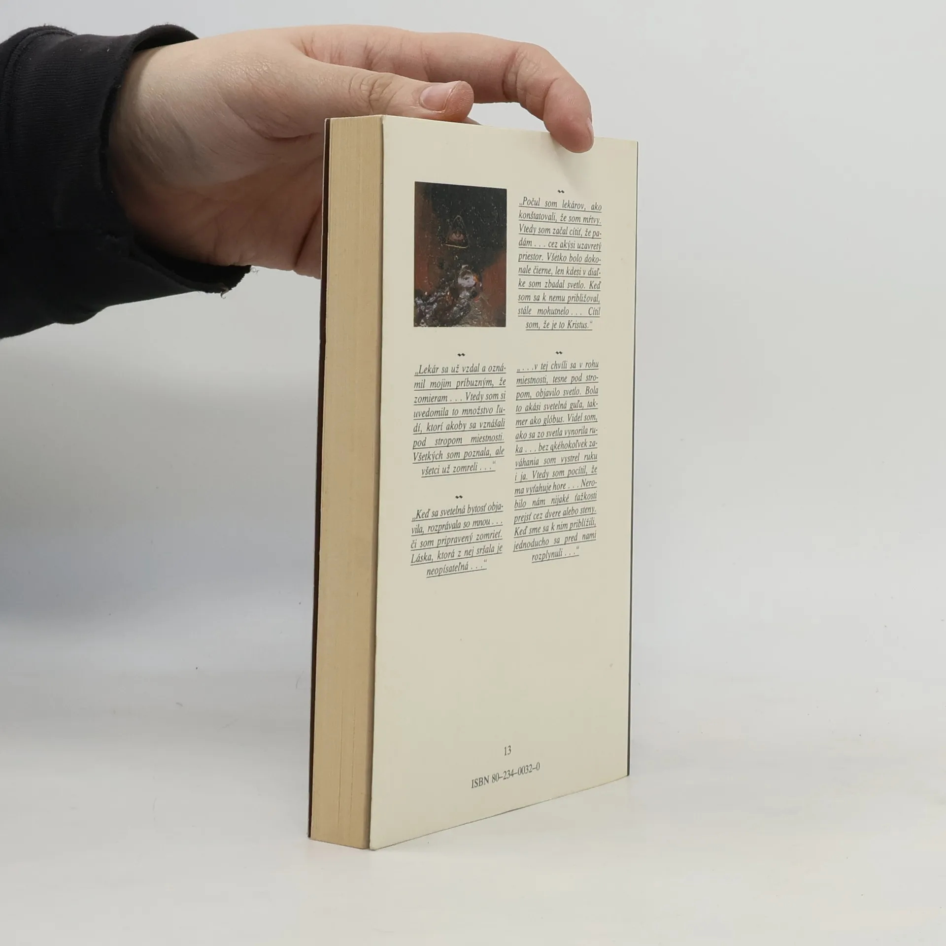 „Lekár sa už vzdal a oznámil mojim príbuzným, že zomieram . . . Vtedy som si uvedomila to množstvo ľudí, ktorí akoby sa vznášali pod stropom miestnosti. Všetkých som poznala, ale všetci už zomreli. . . “ „Keď sa svetelná bytosť objavila, rozprávala so mnou . . . či som pripravený zomrieť. Láska, ktorá z nej sršala je neopísateľná . . .“ ".....v tej chvíli sa v rohu miestnosti, tesne pod stropom, objavilo svetlo. Bola to akási svetelná guľa, takmer ako glóbus. Videl som, ako sa zo svetla vynorila ruka .. . bez akéhokoľvek zaváhania som vystrel ruku i ja. Vtedy som pocítil, že ma vyťahuje hore . . . Nerobilo nám nijaké ťažkosti prejsť cez dvere alebo steny. Keď sme sa k nim priblížili, jednoducho sa pred nami rozplynuli..." „Počul som lekárov, ako konštatovali, že som mŕtvy. Vtedy som začal cítiť, že padám . . . cez akýsi uzavretý priestor. Všetko bolo dokonale čierne, len kdesi v diaľke som zbadal svetlo. Keď som sa k nemu približoval, stále mohutnelo . . . Cítil som, že je to Kristus. “