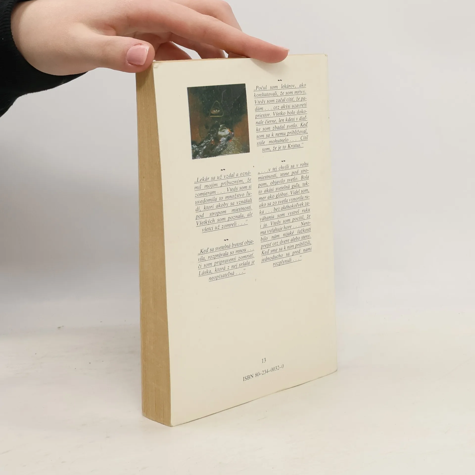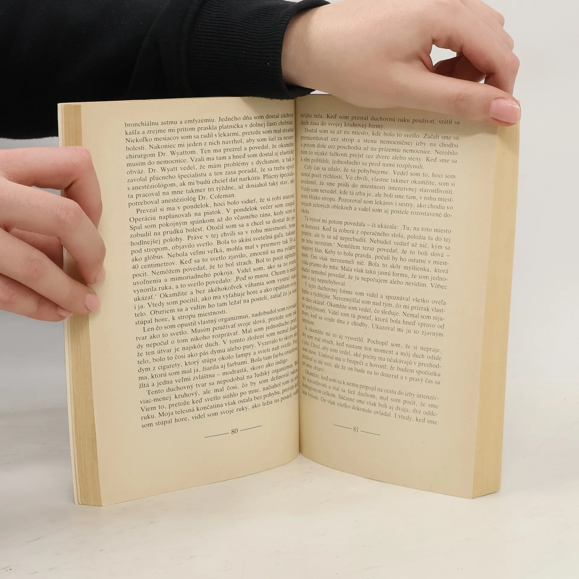 „Lekár sa už vzdal a oznámil mojim príbuzným, že zomieram . . . Vtedy som si uvedomila to množstvo ľudí, ktorí akoby sa vznášali pod stropom miestnosti. Všetkých som poznala, ale všetci už zomreli. . . “ „Keď sa svetelná bytosť objavila, rozprávala so mnou . . . či som pripravený zomrieť. Láska, ktorá z nej sršala je neopísateľná . . .“ ".....v tej chvíli sa v rohu miestnosti, tesne pod stropom, objavilo svetlo. Bola to akási svetelná guľa, takmer ako glóbus. Videl som, ako sa zo svetla vynorila ruka .. . bez akéhokoľvek zaváhania som vystrel ruku i ja. Vtedy som pocítil, že ma vyťahuje hore . . . Nerobilo nám nijaké ťažkosti prejsť cez dvere alebo steny. Keď sme sa k nim priblížili, jednoducho sa pred nami rozplynuli..." „Počul som lekárov, ako konštatovali, že som mŕtvy. Vtedy som začal cítiť, že padám . . . cez akýsi uzavretý priestor. Všetko bolo dokonale čierne, len kdesi v diaľke som zbadal svetlo. Keď som sa k nemu približoval, stále mohutnelo . . . Cítil som, že je to Kristus. “
