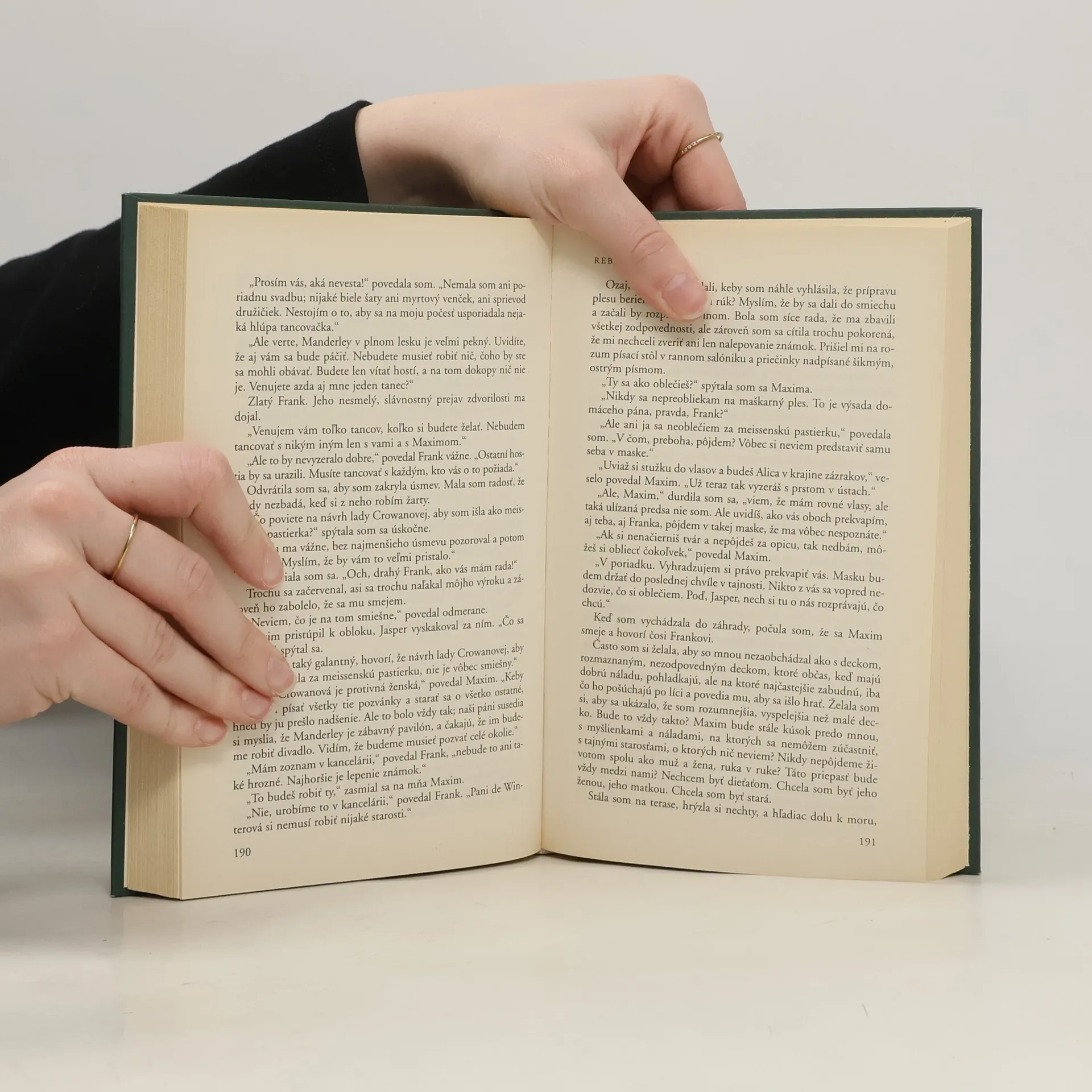 "V noci sa mi snívalo, že som bola opäť v Manderley. Stála som tam pred mrežami hlavnej brány, ale nemohla som dovnútra, lebo bola zamknutá na retiazku s visacou zámkou. V sne som volala vrátnika, no nik sa neozval; keď som sa lepšie prizrela pomedzi zahrdzavené tyče, videla som, že vo vrátnici nik nebýva." Týmito slovami začína rozprávanie hlavnej hrdinky, ktorá sa na Francúzskej Riviére zaľúbila do príťažlivého a zámožného Angličana Maximiliana de Winter. Ľúbostný vzťah je zakrátko spečatený manželským sľubom a zdá sa, že mladá manželka si rýchlo zvykne na nový domov. Netuší však, že na jej šťastie čoskoro začne vrhať tieň tajomný prízrak Maximovej prvej ženy - nebohej Rebeky. Vo vytváraní stiesňujúceho ovzdušia nemalú rolu zohráva komorná, pani Danversová, ktorá je presvedčená o tom, že nikto nemôže a nesmie nahradiť predchádzajúcu pani domu, šarmantnú a vo všetkom dokonalú Rebeku. Neštíti sa pritom nijakých prostriedkov, keď ide o to, aby novej manželke pána domu strpčila život. Romantickú, priam mátožnú atmosféru stupňujúcich sa udalostí podfarbuje hučanie mora, v ktorom sa tají tragédia, ktorá navždy poznačila pána domu a jeho starú služobníčku. Román Rebeka, podľa ktorého v roku 1941 svetoznámy majster hororovej atmosféry Alfred Hitchcock nakrútil dvomi Oscarmi ocenený film, neprestajne vychádza v nových vydaniach po celom svete.