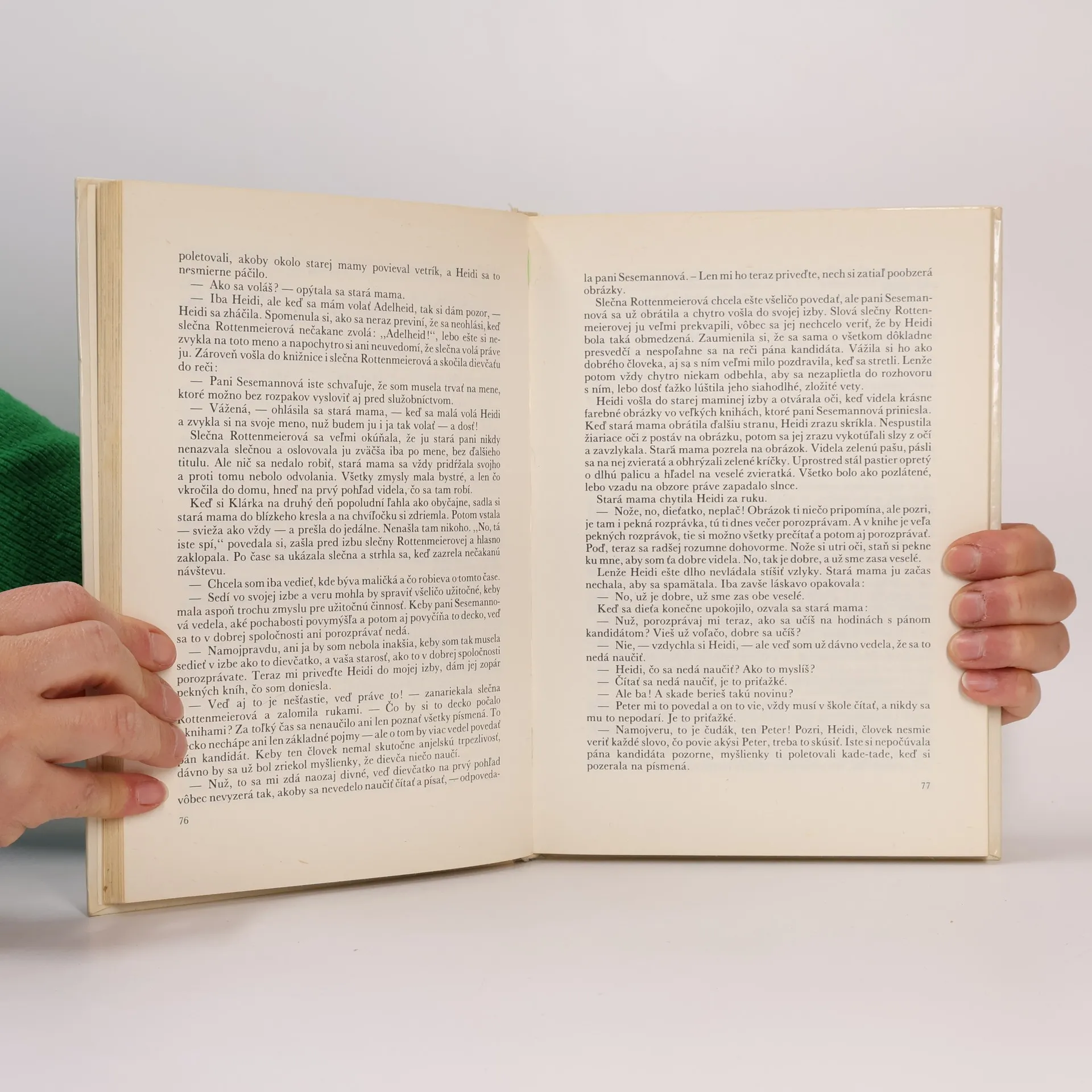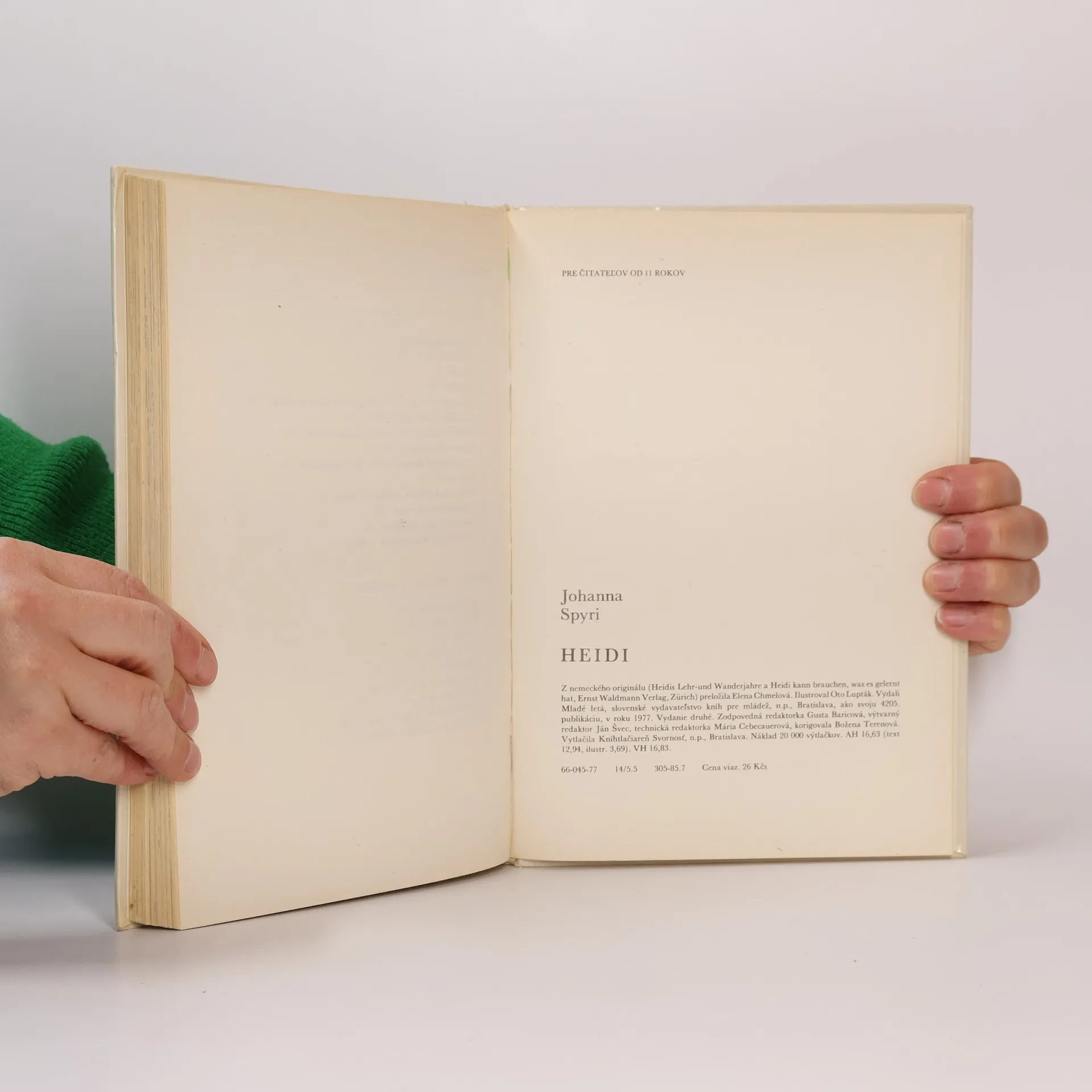 Kapitoly: I. Heidine učňovské roky-Cesta na poľanu, Pri starom otcovi, Na paši, U starkej, Príde návšteva a potom i ďalšia, čo má vážne následky, Nová kapitola a samé nové veci, Slečna Rottenmeireová prežije nepokojný deň, Nepokoj u Sesemannov, Domáci pán sa doma dozvie všeličo neslýchané, Stará mama, Heidi jednak priberá, jednak jej ubúda, U Sesemannov máta, Letný večer opäť na poľane, V nedeľu, keď zvony zvonia. II. Heidi sa zíde, čo sa naučila-Prípravy na cestu, Hosť na poľane, Odmena, Zima v dedinke, Zima sa drží, Ďalekí priatelia sa ohlásia, Ako si žili na poľane Prihodí sa niečo, čo nikto nečakal, Rozlúčka, ale zároveň i " do videnia". Vydanie prvé. Cena knihy v čase vydania: 26.- Kčs.