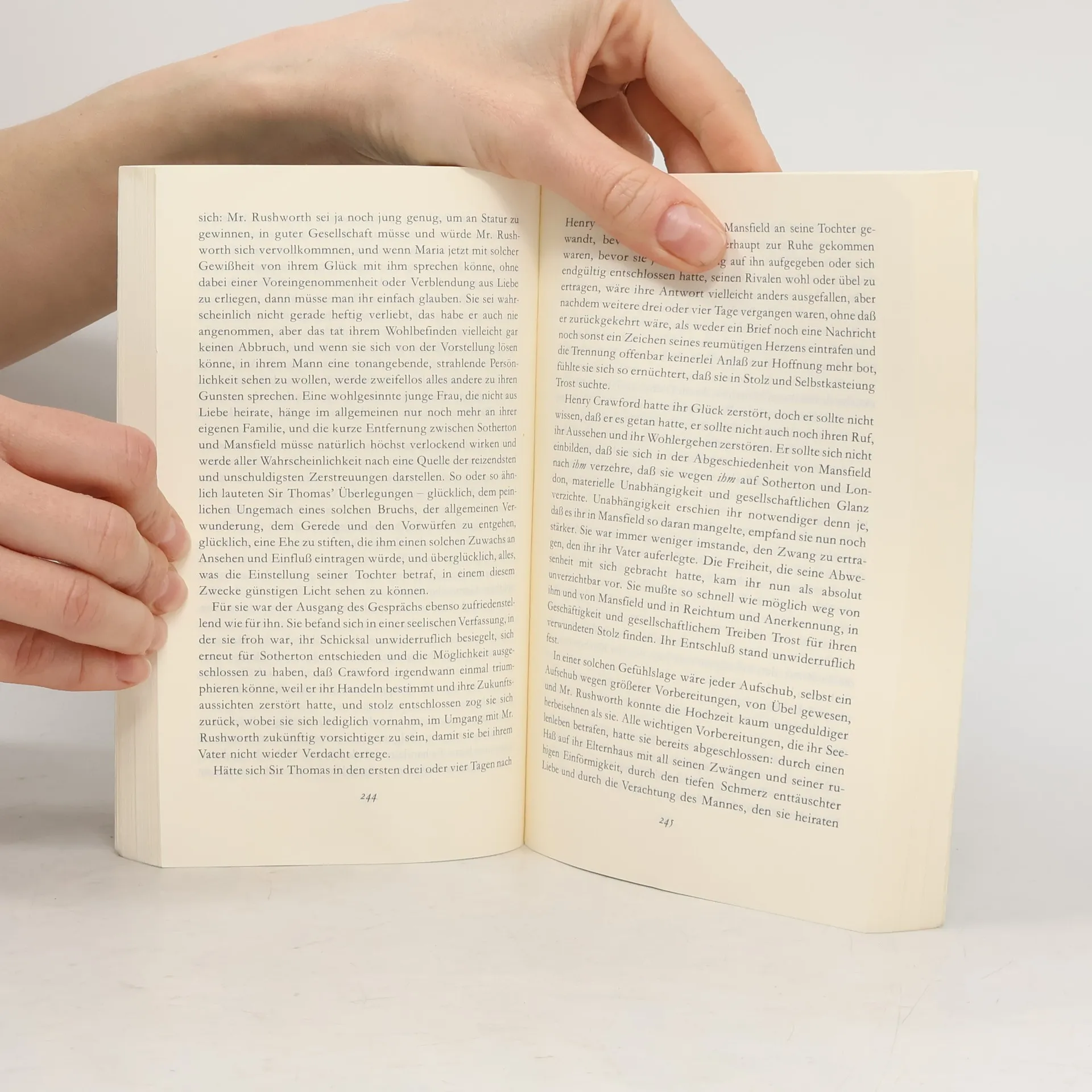 In der Geschichte einer jungen Frau, die den passenden Partner fürs Leben sucht, nimmt Jane Austen die Verhaltensmuster der Eheschließung aufs Korn, die Vereinnahmung der Frau in der Ehe durch die männlich geprägte Umwelt.