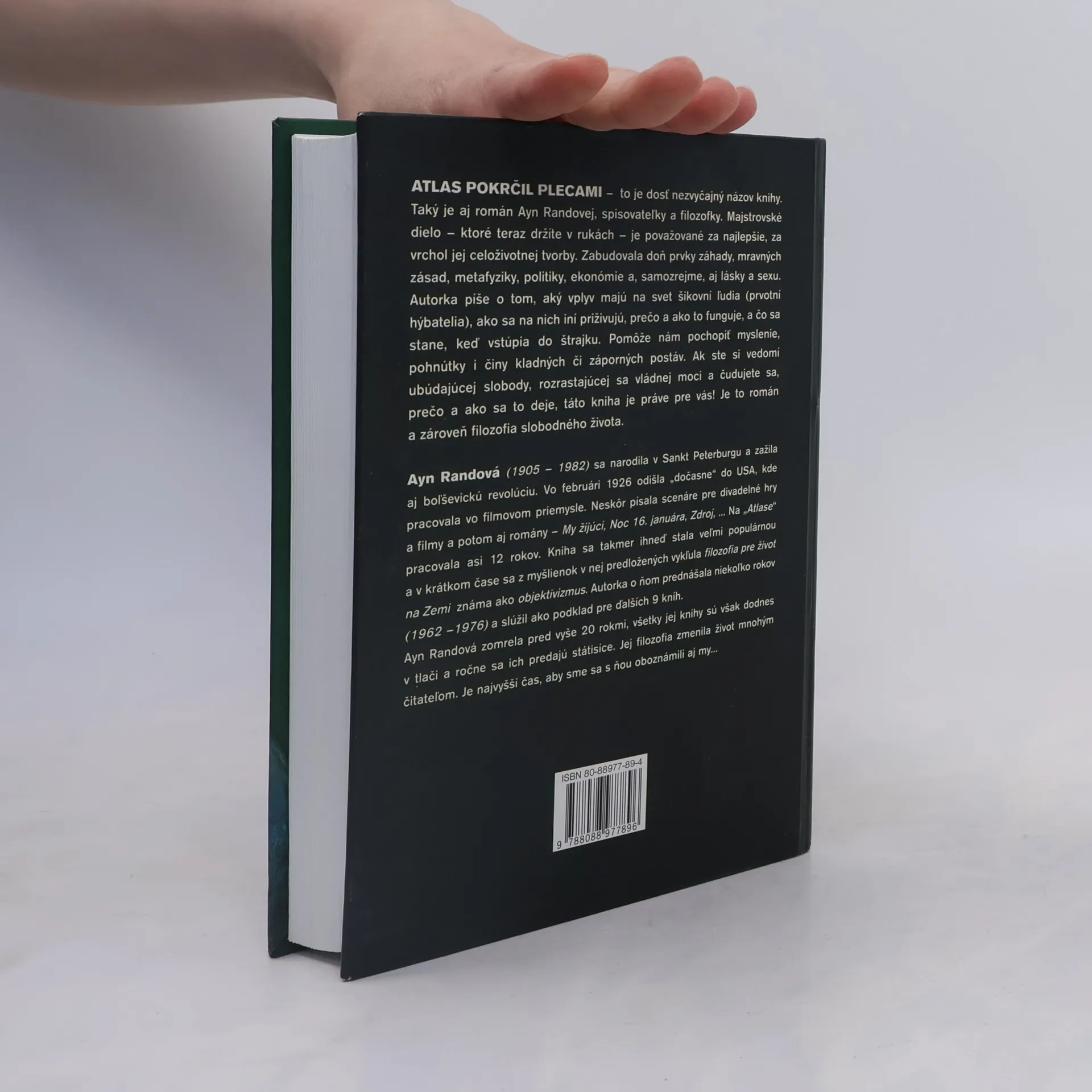 Atlas pokrčil pokrčil – to je dosť nezvyčajný názov knihy. Taký je aj Ayn Randovej, spisovateľky a filozofky. Toto dielo je považované za najlepšie, za vrchol jej celoživotnej tvorby. Zabudovala doň prvky záhady, mravných zásad, metafyziky, politiky, ekonómie, a samozrejme, aj lásky a sexu. Autorka píše o tom, aký vplyv majú na svet šikovní ľudia (prvotní hýbatelia), ako sa na nich iní priživujú, prečo a ako to funguje, a čo sa stane, keď vstúpia do štrajku. Pomôže nám pochopiť myslenie, pohnútky i činy kladných či záporných postáv. Ak ste si vedomí ubúdajúcej slobody, rozrastajúcej sa vládnej moci a čudujete sa, prečo a ako sa to deje, táto kniha je práve pre vás! Je to román a zároveň filozofia slobodného života.