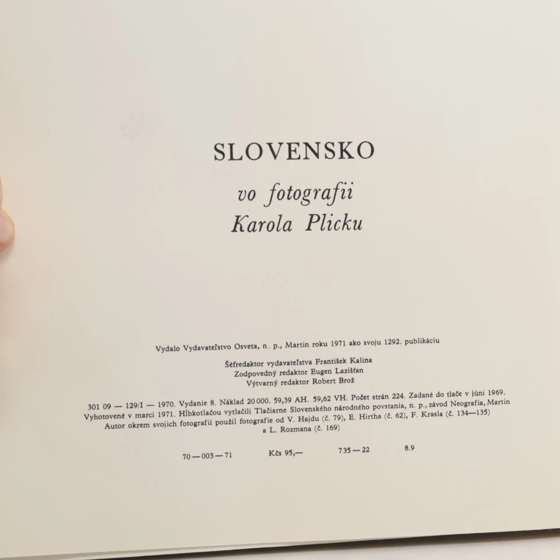 Fotografie Karola Plicky, které sám pro tuhle publikaci vybral a mapuje Slovensko těch časů - Celkem 224 hnědobílých celostránkových fotografií (snímok) - dokonale reprodukované čarovné Plickové fotografické zábery. - Kníha je pokladnicou umenia minulosti, pokladnicou živých i zabúdaných tradícií ľudových, uchovávateľom rázovitých typov slovenských ľudí. Je vznešeným, hymnickým spevom Slovenska. prvé vydanie, 620 Kčs.