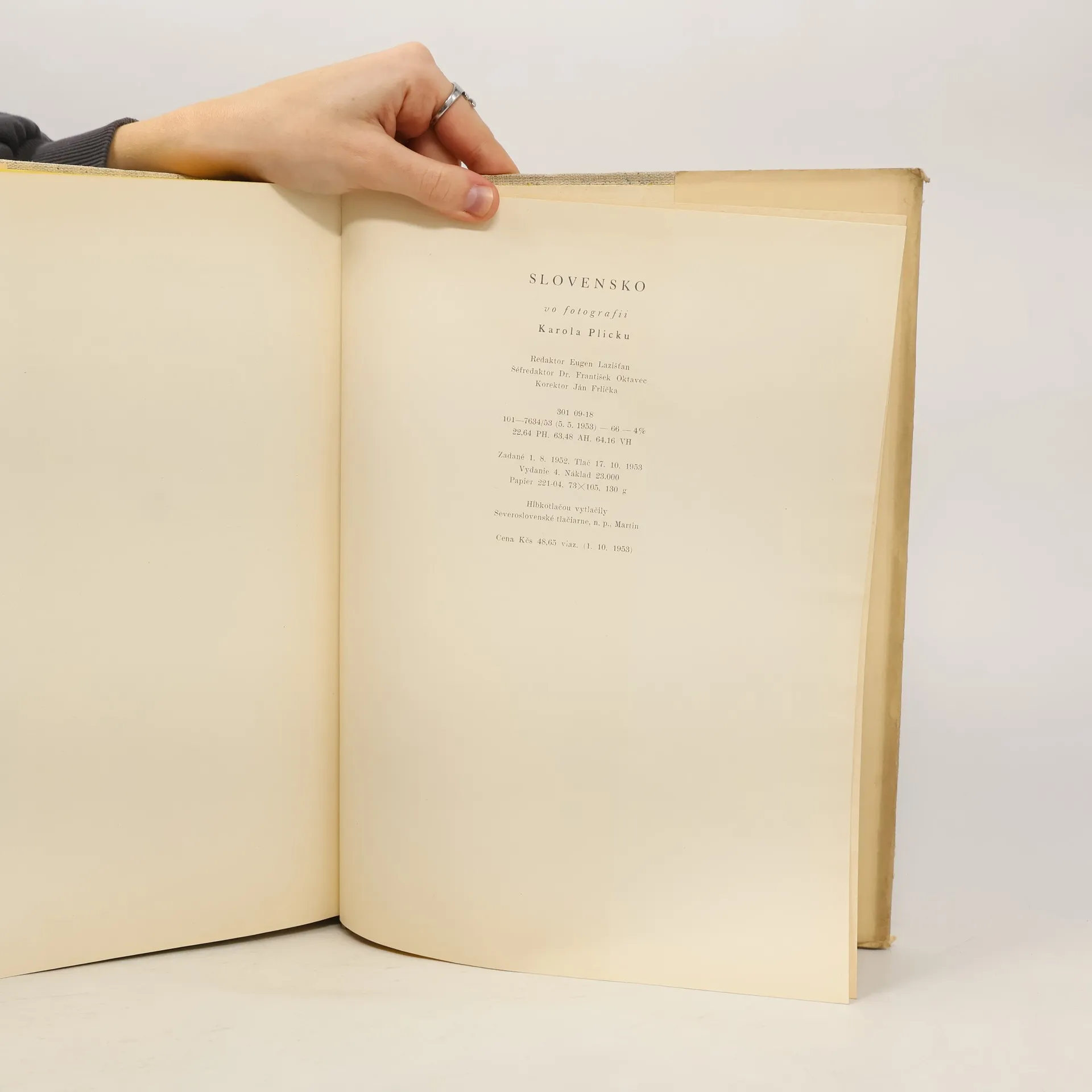 Fotografie Karola Plicky, které sám pro tuhle publikaci vybral a mapuje Slovensko těch časů - Celkem 224 hnědobílých celostránkových fotografií (snímok) - dokonale reprodukované čarovné Plickové fotografické zábery. - Kníha je pokladnicou umenia minulosti, pokladnicou živých i zabúdaných tradícií ľudových, uchovávateľom rázovitých typov slovenských ľudí. Je vznešeným, hymnickým spevom Slovenska. prvé vydanie, 620 Kčs.