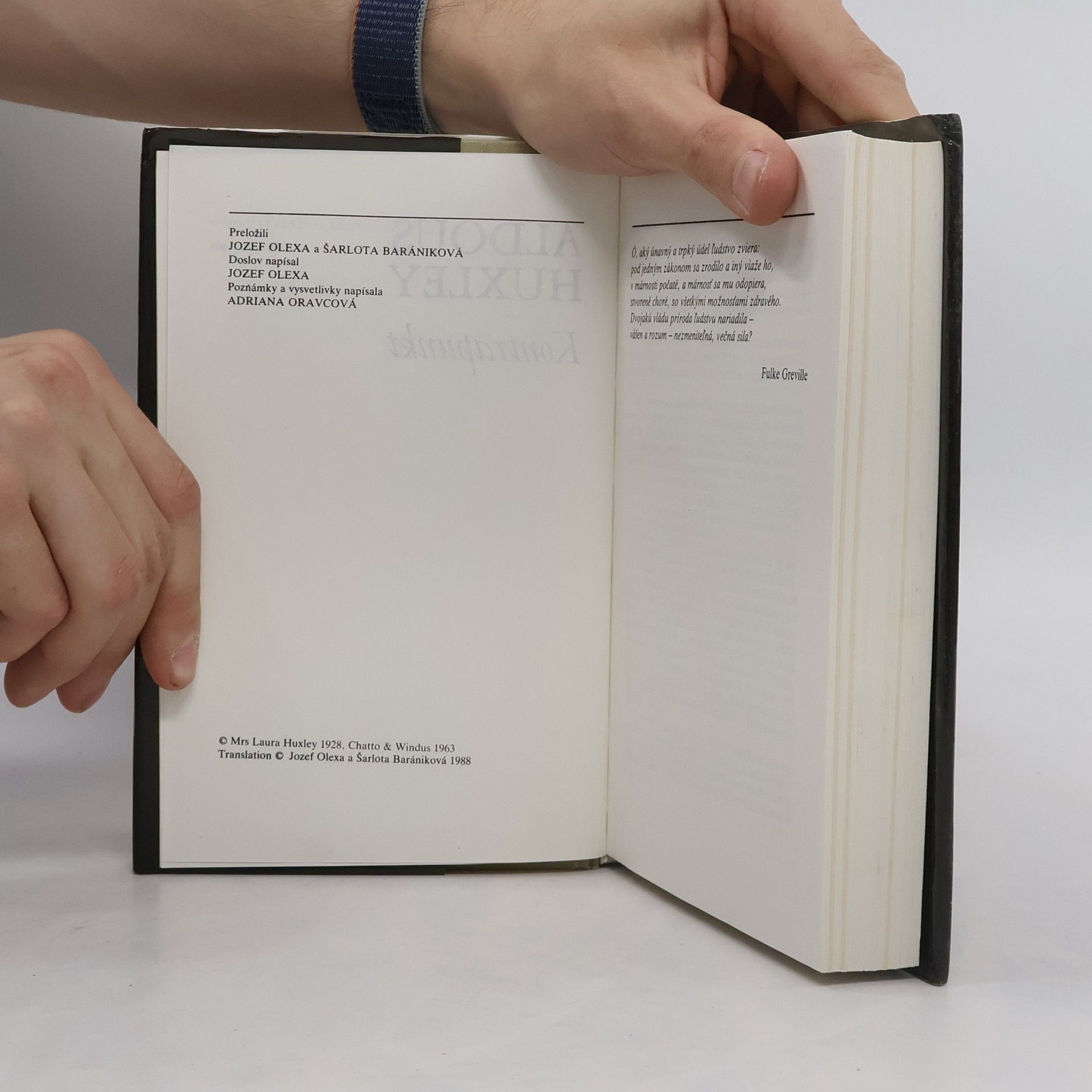 Román Kontrapunkt predstavuje vrcholné dielo jedného z najvýraznejších anglických spisovateľov tohto storočia. Prvý raz vyšiel roku 1928 a dodnes nestratil nič zo svojej pôsobivosti, originality, vtipnej hravosti a vážnej polemickosti, ktorými Huxley doslova očaril čitateľov medzi dvoma svetovými vojnami. Huxley sa tu pokúša kriticky zachytiť duchovnú a spoločenskú situáciu anglickej aristokracie na konci dvadsiatych rokov, ktorú charakterizovala povojnová skepsa, ideová bezvýchodiskovosť, hedonizmus a morálny úpadok. Tak ako sa v hudobnej kompozícii samostatne rozvíjajú a vzájomne prelínajú jednotlivé motívy, tak vkladá autor do románu množstvo postáv v paralelných kontrapunktických dejoch a vzťahoch - nihilizmus spoločenského parazita Spandrella stojí v ostrom protiklade s optimistickým životným postojom Marka Rampiona (portrét Huxleyho priateľa, spisovateľa D. H. Lawrencea), meštiacky intelektuál Philip Quarles (kritický autoportrét samého Huxleyho), neschopný hlbšej citovej väzby, sa bezmocne prizerá, ako jeho žena podlieha sugestívnemu vplyvu demagóga Webleyho, cynická a rozkošnícka Lucy Tantamountová kontrastuje s nudnou Marjorie Carlingovou. Tieto charakterové i názorové protiklady autor predstavuje s ľahkou iróniou, satiricky i veľmi vážne, s dôkladným poznaním duševného i morálneho úpadku vyšších vrstiev anglickej spoločnosti po prvej svetovej vojne.