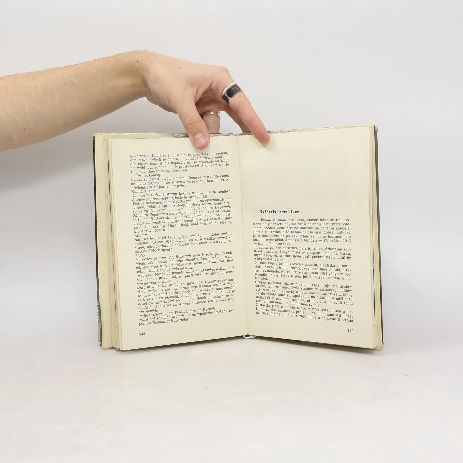 Kniha o atentátu na Heydricha složená z fiktivních monologů (ovšem faktograficky podložených a ověřených) osob, které byly svědky atentátu nebo jeho příprav či následků. V knize jsou i monology historika a vzpomínky svědků. Součástí jsou černobílé fotografie.