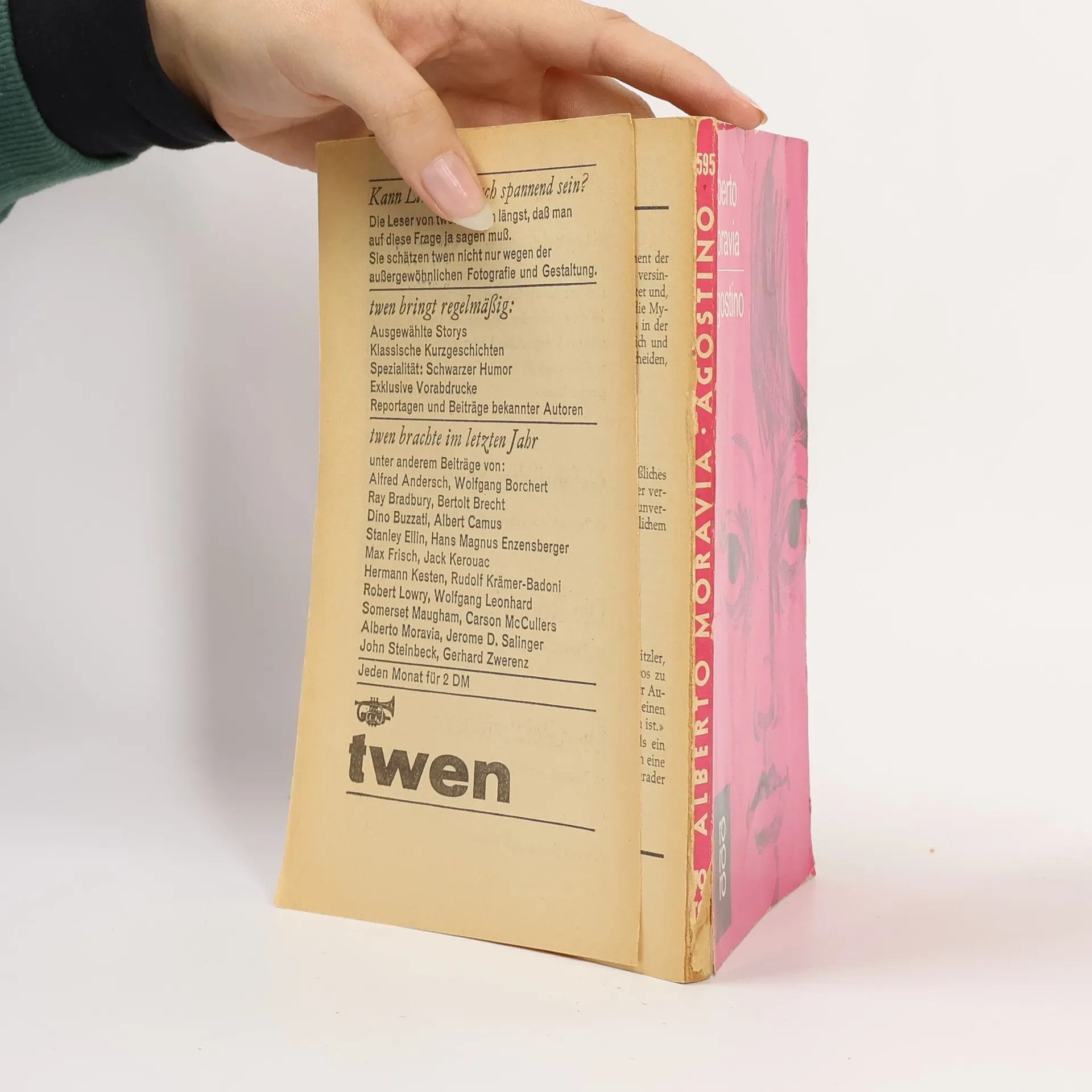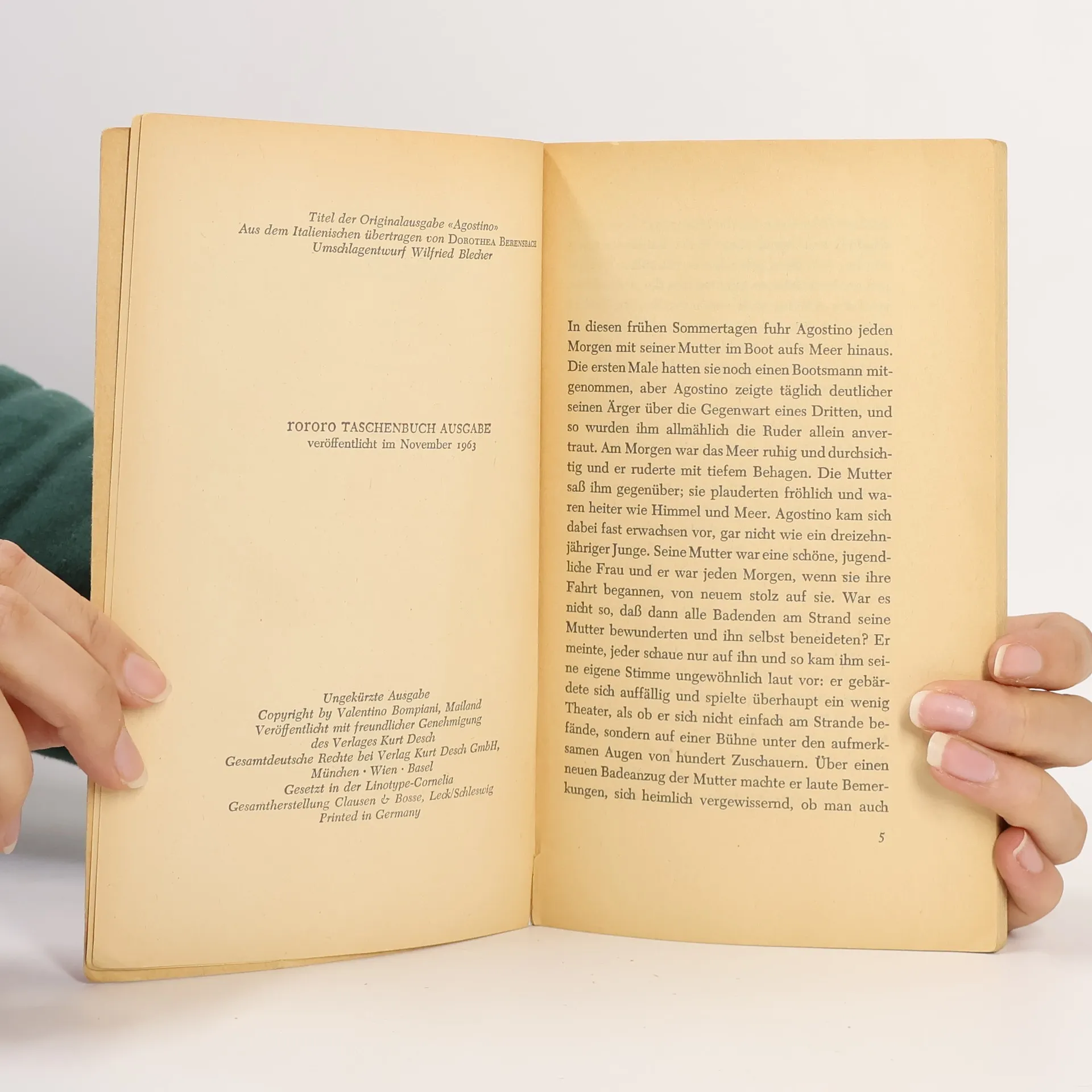 Der kurze brillante Roman Agostino behandelt die großen Themen Moravias: Die Gewalt der Sexualität, die Macht des Geldes und die fragwürdige Moral des Bürgertums. Der dreizehnjährige, wohlbehütete Agostino verbringt mit seiner jugendlichen Mutter den üblichen italienischen Strandurlaub. Damit der schöne Schein gewahrt bleibt, muss der Junge täglich die Mutter und deren Verehrer auf Bootsfahrten begleiten – brav auf der Ruderbank sitzend, ohne sich umzudrehen. Durch Zufall gerät er in die ortsansässige Bande von armen Fischerjungen, die ihn drastisch und anschaulich über seine Mutter aufklären und ihn wegen seiner Unwissenheit verspotten. Die verwirrenden Entdeckungen lassen Agostino nicht zur Ruhe kommen: Abgestoßen von der Derbheit der Bande, gelangweilt von den Gleichaltrigen, nicht ernstgenommen von der Mutter, gehört Agostino nirgends dazu – weder zu den Kindern noch zu den Erwachsenen, weder zu den Reichen noch zu den Armen.