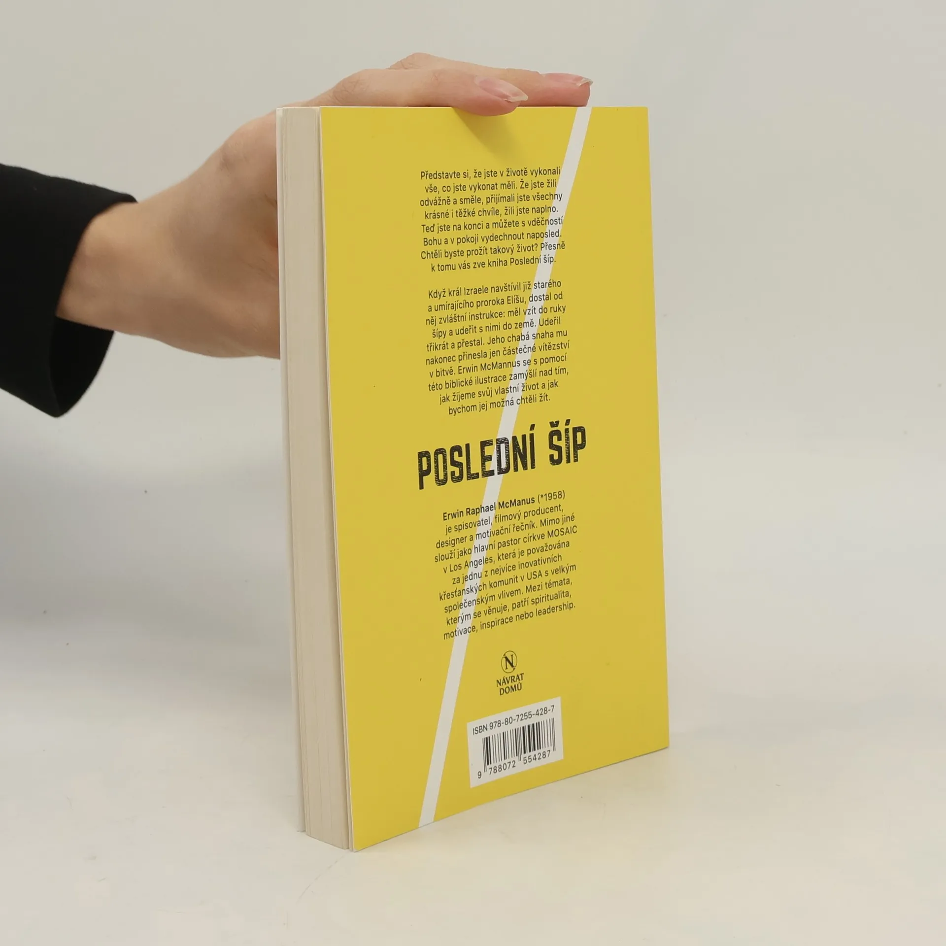 Představte si, že jste v životě vykonali vše, co jste vykonat měli. Že jste žili odvážně a směle, přijímali jste všechny krásné i těžké chvíle, žili jste naplno. Teď jste na konci a můžete s vděčností Bohu a v pokoji vydechnout naposled. Chtěli byste prožít takový život? Přesně k tomu vás zve kniha Poslední šíp. Když král Izraele navštívil již starého a umírajícího proroka Elíšu, dostal od něj zvláštní instrukce: měl vzít do ruky šípy a udeřit s nimi do země. Udeřil třikrát a přestal. Jeho chabá snaha mu nakonec přinesla jen částečné vítězství v bitvě. Erwin McManus se s pomocí této biblické ilustrace zamýšlí nad tím, jak žijeme svůj vlastní život a jak bychom jej možná chtěli žít.