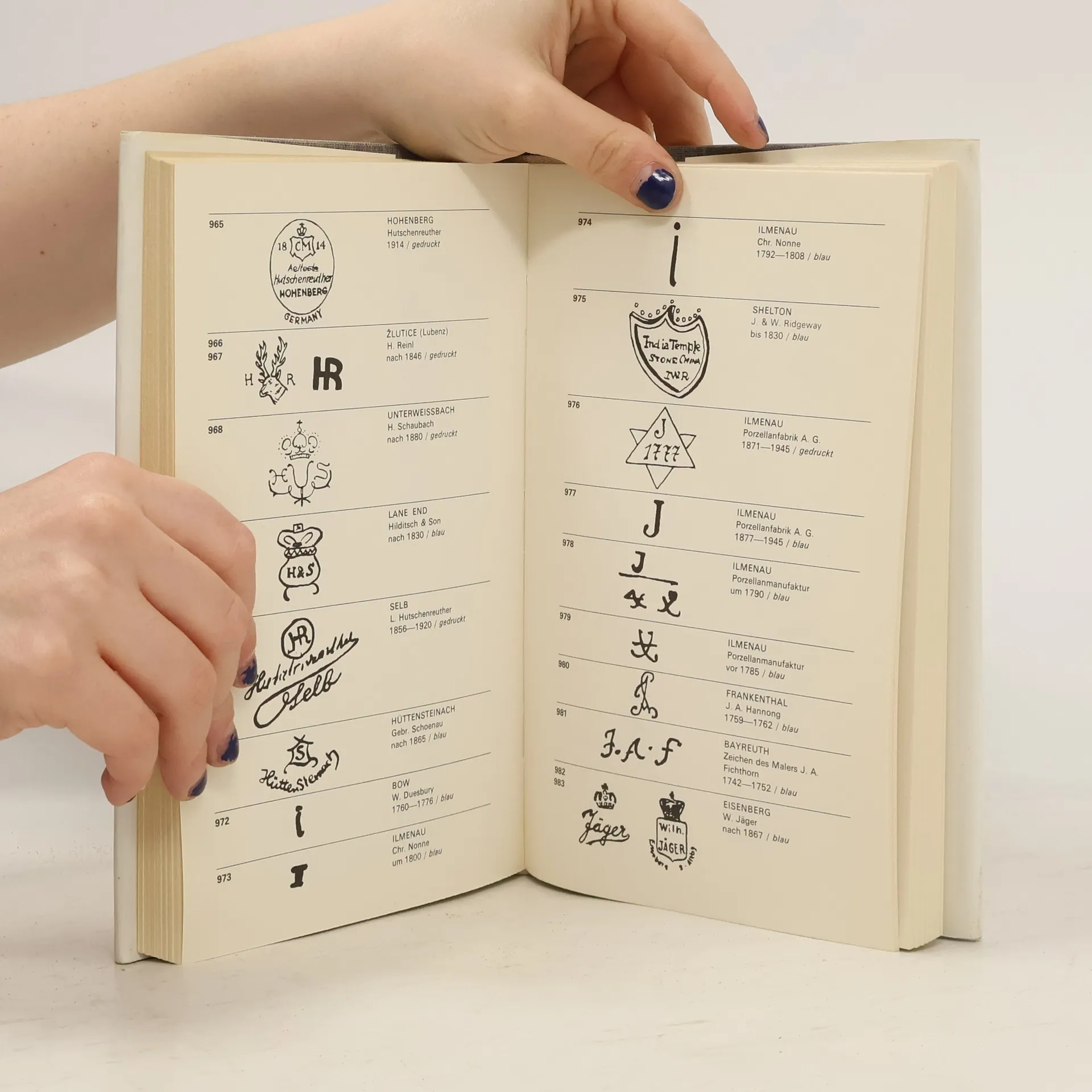 Toto je asi nejlepší kniha pro sběratele porcelánu. Obsahuje nepřeberné množství značek porcelánu a jejich ilustrace s lety, kdy byly používány. Na konci knihy je abecední rejstřík podle výrobců a míst. Snadno tak podle nich určíte stáří porcelánu. Některé méně používané značky jsme tam nenašel, ale stále je to asi nejlepší kniha svého druhu.