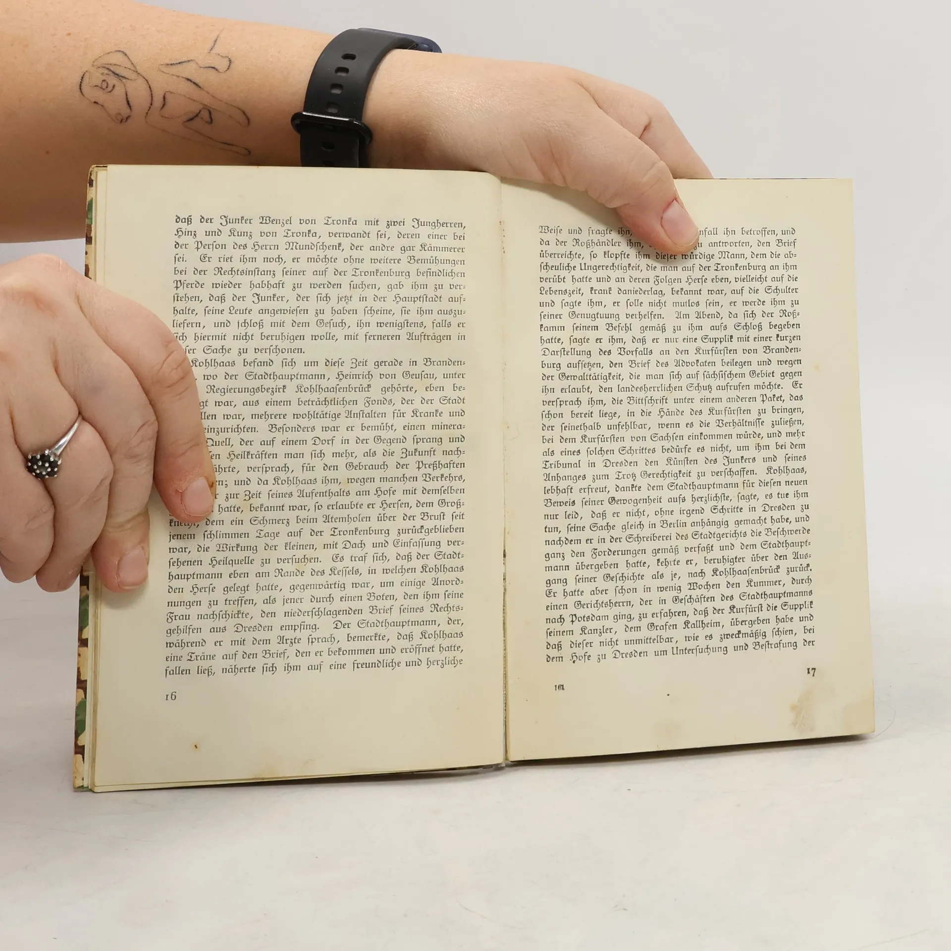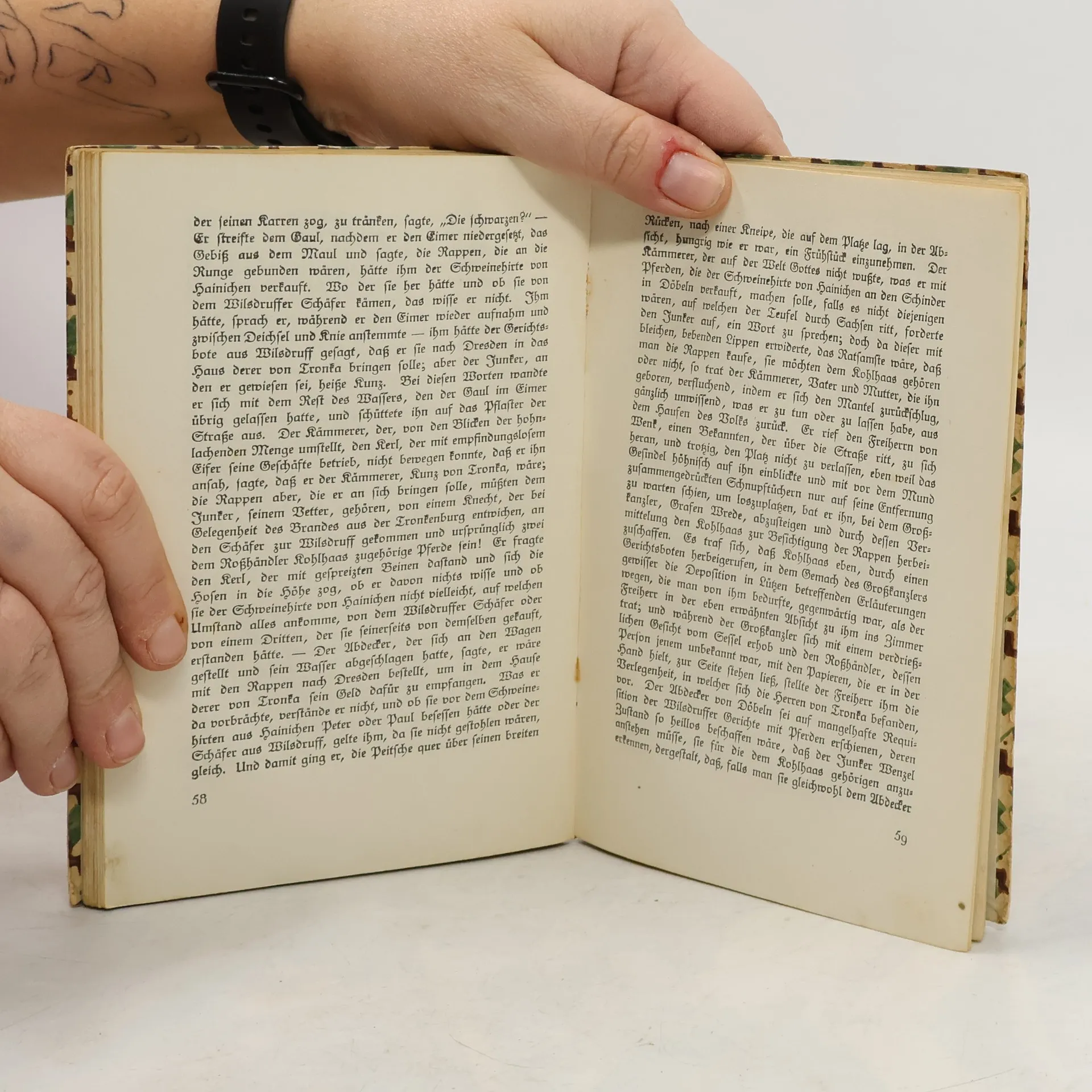 Der Rosshändler Michael Kohlhaas sucht sein Recht und wird darüber zum Räuber. Er muss erkennen, dass es das absolute Recht nicht geben kann, sondern dass die Rechtsprechung an die Gesellschaft gebunden ist. Schliesslich ereilt ihn selbst das Gericht, dem er sich beugt: Er stirbt auf dem Schaffot. Diese Novelle beruht, wie der Untertitel angibt, auf einer alten Chronik, aus der der Anhang Auszüge bringt. Über Leben und Werk des Dichters gibt das Nachwort Auskunft. Die Anmerkungen enthalten Erklärungen für den Schüler.