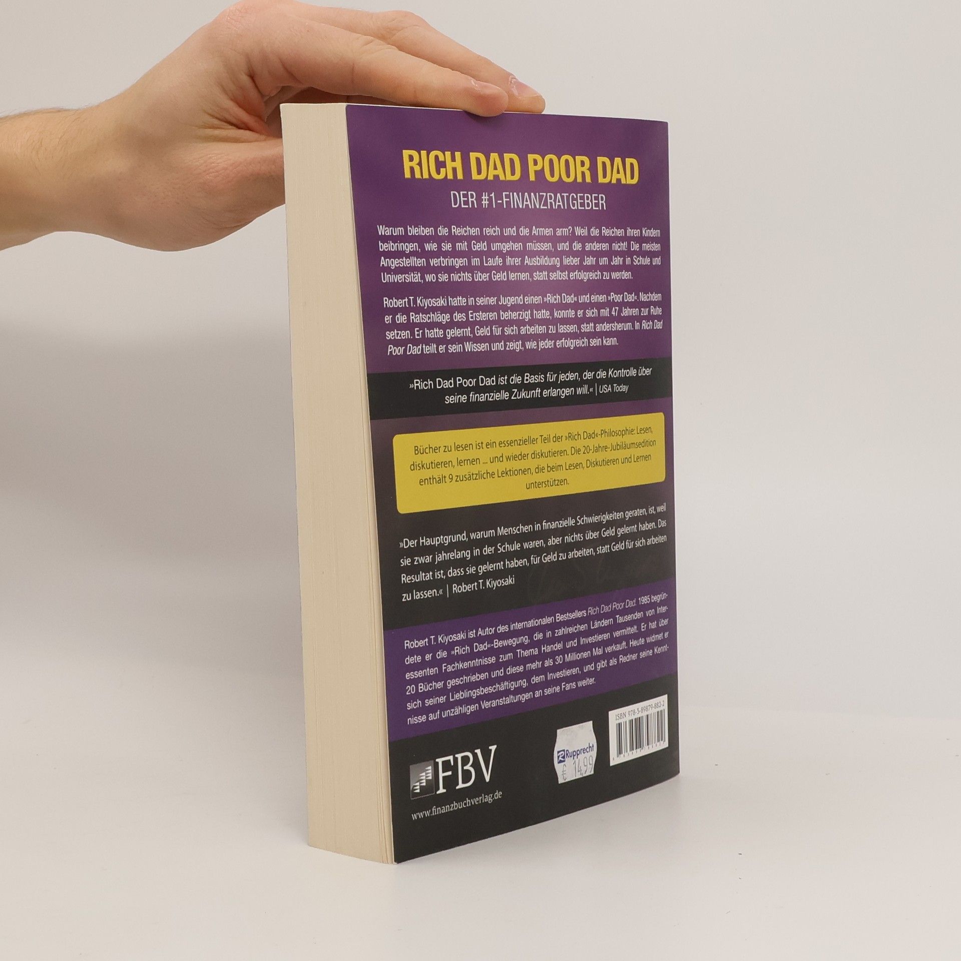 Warum bleiben die Reichen reich und die Armen arm? Weil die Reichen ihren Kindern beibringen, wie sie mit Geld umgehen müssen, und die anderen nicht! Die meisten Angestellten verbringen im Laufe ihrer Ausbildung lieber Jahr um Jahr in Schule und Universität, wo sie nichts über Geld lernen, statt selbst erfolgreich zu werden. Robert T. Kiyosaki hatte in seiner Jugend einen »Rich Dad« und einen »Poor Dad«. Nachdem er die Ratschläge des Ersteren beherzigt hatte, konnte er sich mit 47 Jahren zur Ruhe setzen. Er hatte gelernt, Geld für sich arbeiten zu lassen, statt andersherum. In Rich Dad Poor Dad teilt er sein Wissen und zeigt, wie jeder erfolgreich sein kann. © Autorenfoto: Rich Dad Company