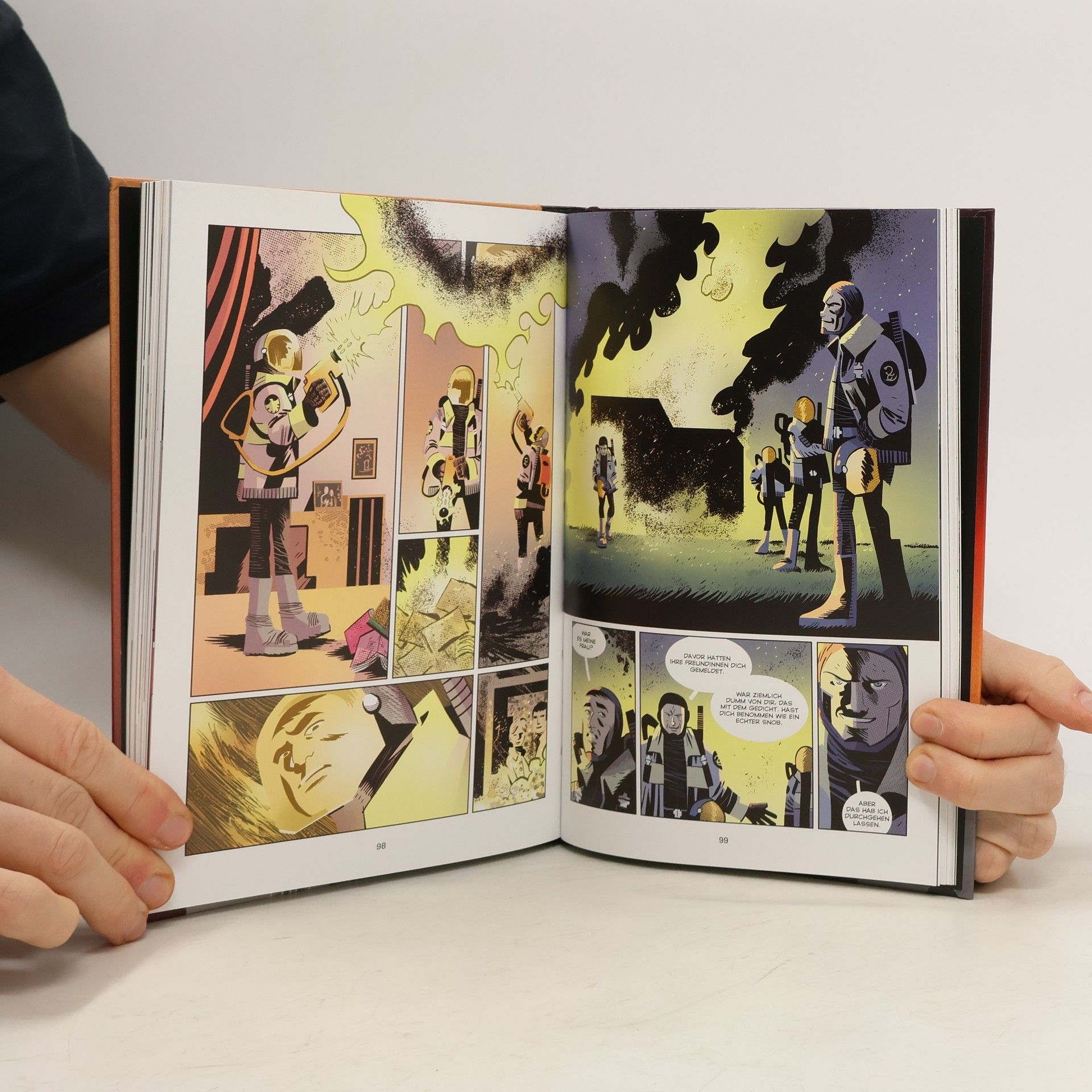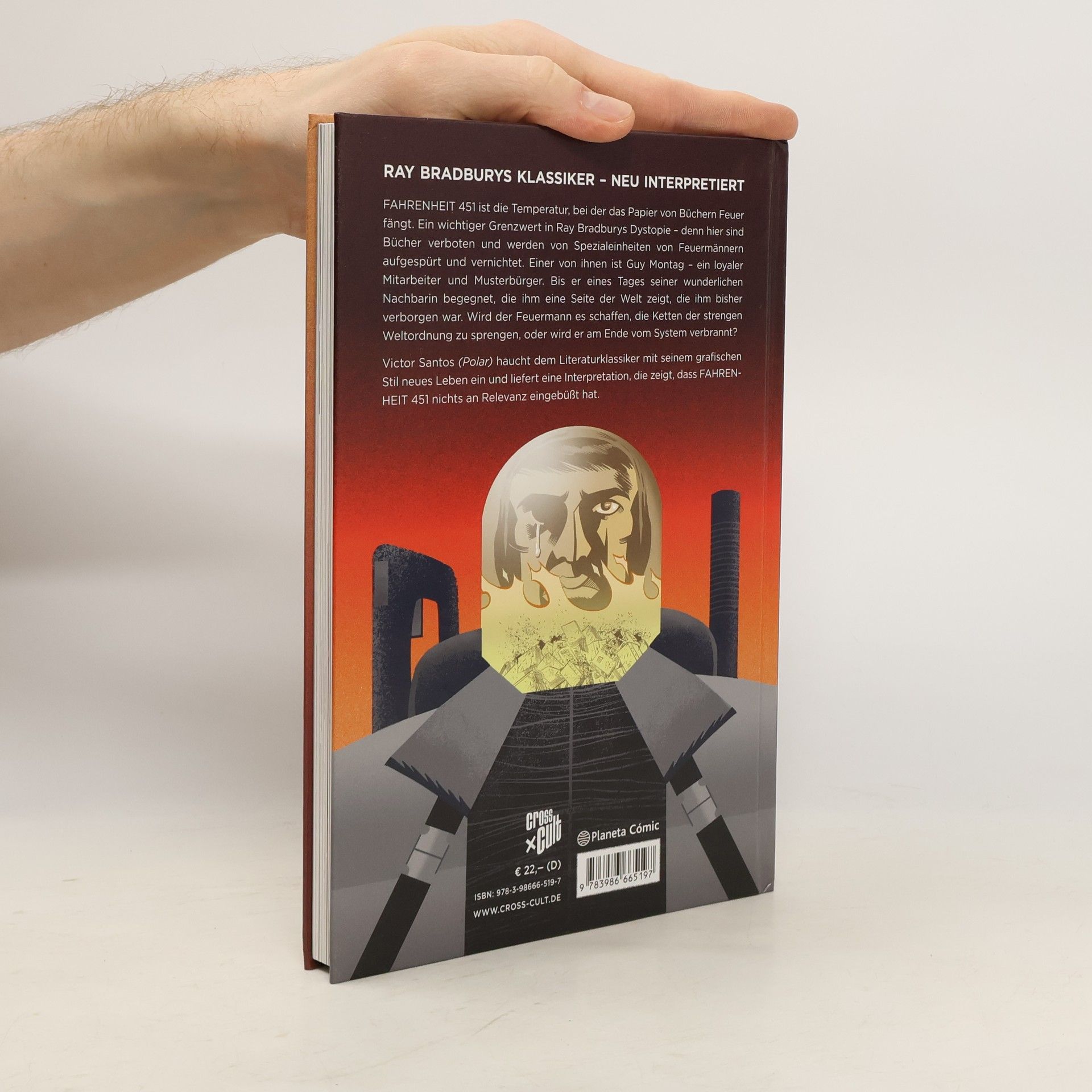 Guy Montag ist Feuerwehrmann, aber in Fahrenheit 451 besteht seine Aufgabe nicht darin, Brände zu löschen, sondern Bücher zu verbrennen, ein Gegenstand, der verboten ist, weil er Zwietracht und Leid verursacht. Der mechanische Jagdhund der Feuerwehr, bewaffnet mit einer tödlichen Injektion, begleitet von Hubschraubern, ist bereit, Dissidenten aufzuspüren, die noch Bücher aufbewahren und lesen. Víctor Santos, Autor von Polar, einem Werk, das auf Netflix verfilmt wurde, fängt in seiner Zeichnung die von den Medien versklavte Zivilisation und den Konformismus von Ray Bradburys dystopischem Klassiker ein.