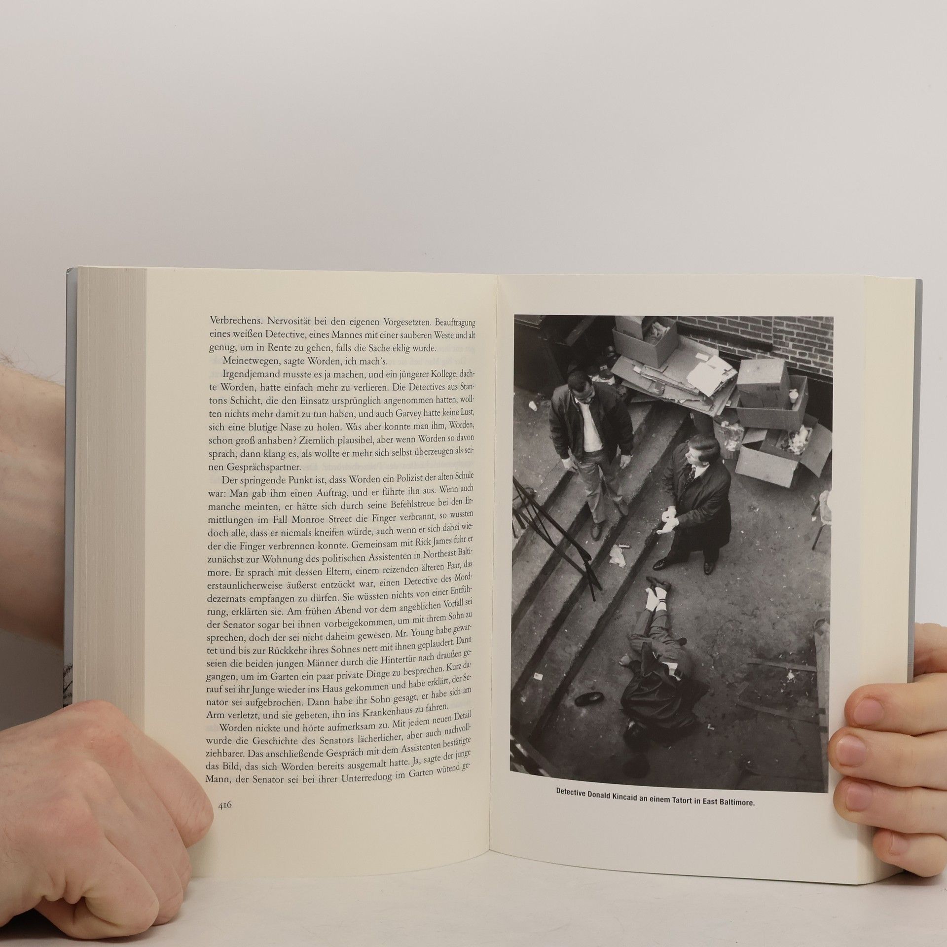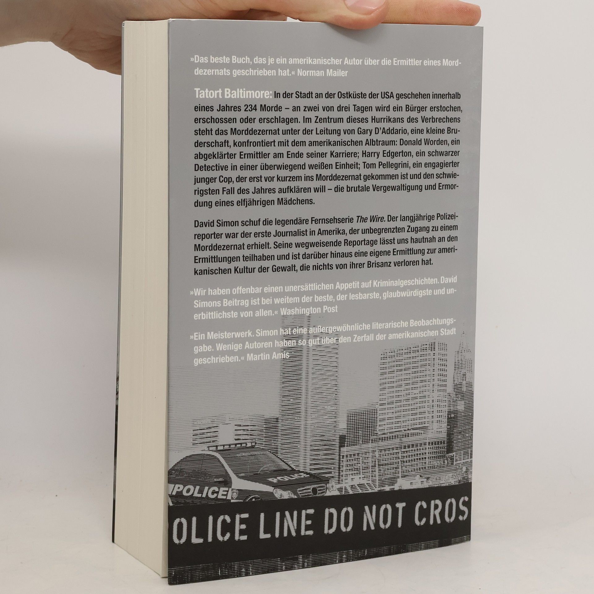 Tatort Baltimore: In der Stadt an der Ostküste der USA geschehen innerhalb eines Jahres 234 Morde – an zwei von drei Tagen wird ein Bürger erstochen, erschossen oder erschlagen. Im Zentrum dieses Hurrikans des Verbrechens steht die Mordkommission unter der Leitung von Lieutenant Gary D’Addario, eine kleine Bruderschaft, konfrontiert mit dem amerikanischen Albtraum: Donald Worden, ein abgeklärter Ermittler am Ende seiner Karriere; Harry Edgerton, ein schwarzer Detective in einer überwiegend weißen Einheit; und Tom Pellegrini, ein engagierter junger Cop, der erst vor kurzem zur Mordkommission gekommen ist und den schwierigsten Fall des Jahres aufklären will – die brutale Vergewaltigung und Ermordung eines elfjährigen Mädchens. David Simon schuf die legendäre Fernsehserie „The Wire“. Der langjährige Polizeireporter der Baltimore Sun war der erste Reporter in Amerika, der unbegrenzten Zugang zu einer Mordkommission erhielt – er folgte ein Jahr lang den Ermittlern. Seine meisterhafte Reportage, die sowohl den Edgar als auch den Anthony Award gewann, lässt uns hautnah an den Ermittlungen der Mordkommission teilhaben und ist darüber hinaus eine eigene Ermittlung zur amerikanischen Kultur der Gewalt, die nichts von ihrer Brisanz verloren hat.