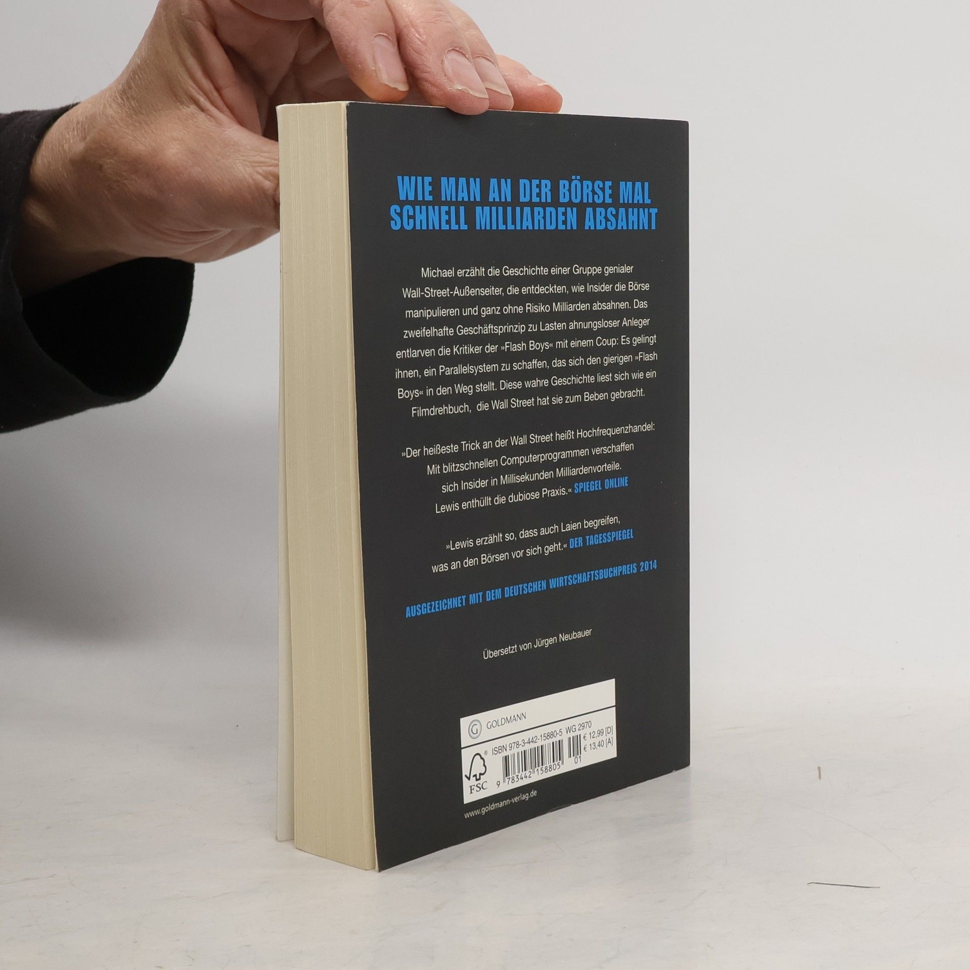 Michael Lewis enthüllt in seinem neuesten Buch die Geschichte einer Gruppe genialer Wall-Street-Außenseiter. Sie haben herausgefunden, wie Insider die Börse zu ihrem Vorteil manipulieren und ohne Risiko Milliarden absahnen. Der Entschluss der „Helden“: Sie schaffen ein paralleles System, das sich den raffgierigen „Flash Boys“ in den Weg stellt. Lewis bringt Licht in die dunkelste Ecke des Börsenhandels. Eine Geschichte über den Kampf um Geschwindigkeit auf einem Markt, den zwar keiner sieht, aber der unsere Wirtschaft ernsthaft bedroht. Was sich liest wie ein Filmdrehbuch, hat die Wall Street zum Beben gebracht.