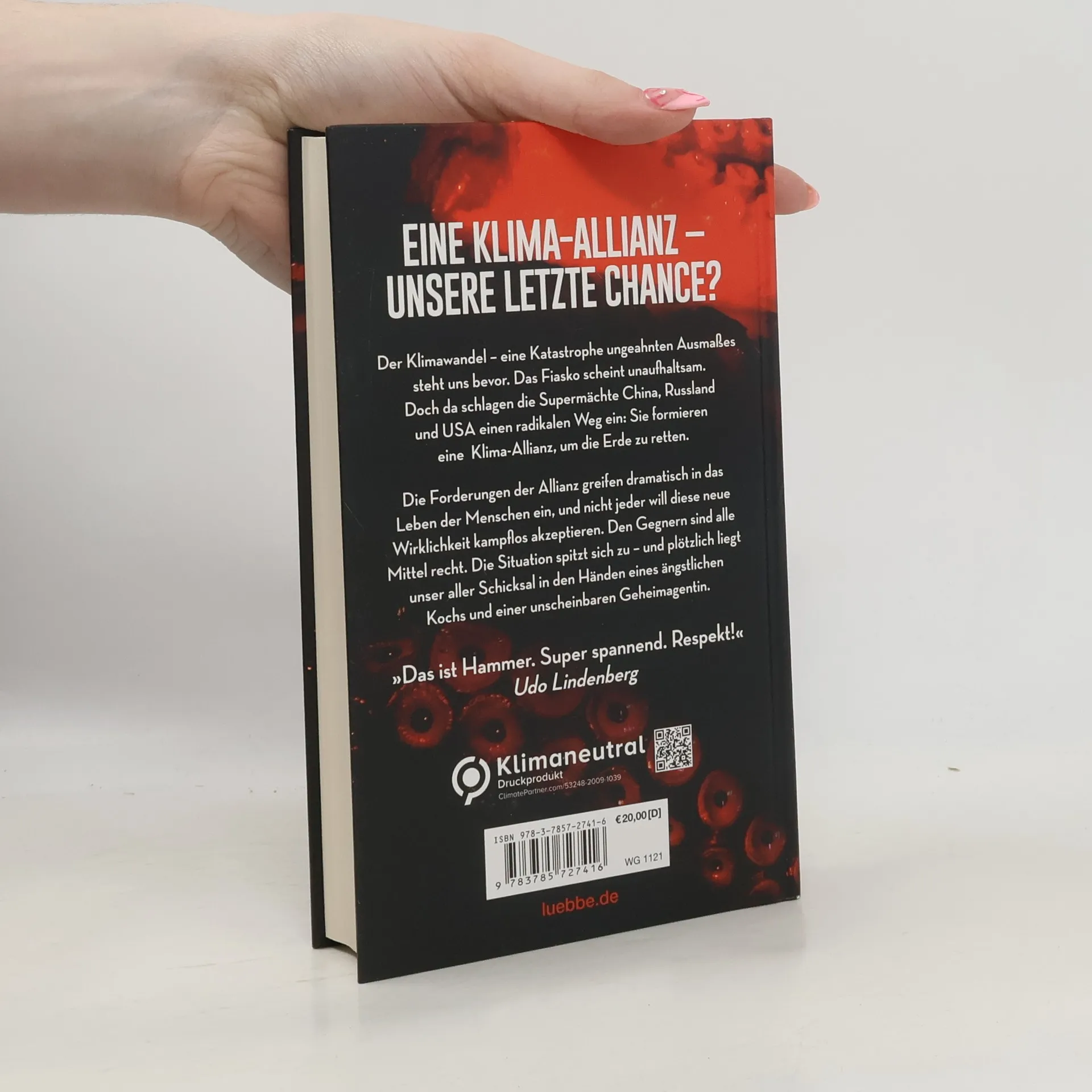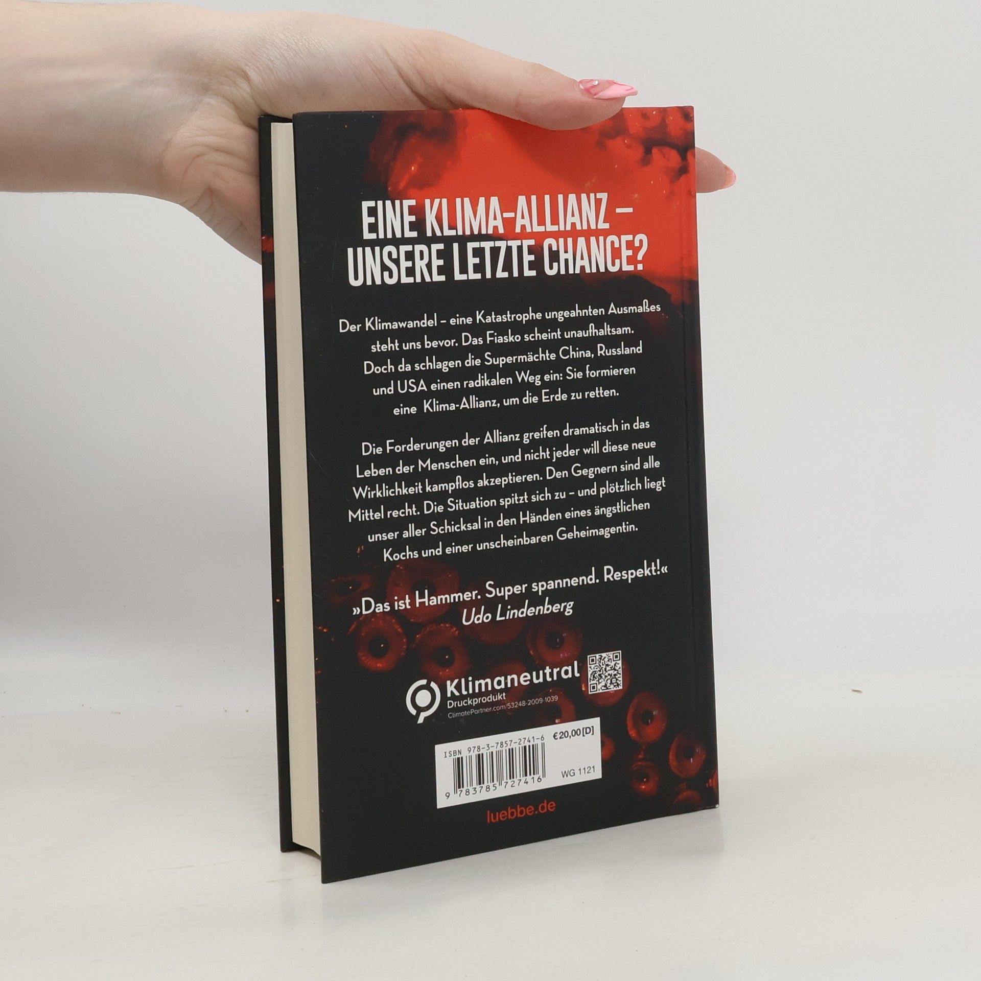 Eine Klima-Allianz - unsere letzte Chance? Der Klimawandel - eine Katastrophe ungeahnten Ausmaßes steht uns bevor. Verändert unsere Erde. Verändert unser aller Leben. Das Fiasko scheint unaufhaltsam. Bis die drei Supermächte China, Russland und die USA einen radikalen Weg einschlagen. Doch wird diese starke Klima-Allianz das Ruder noch herumreißen? Die Maßnahmen der Allianz greifen gravierend in das Leben der Menschen ein, und nicht jeder will diese neue Wirklichkeit kampflos akzeptieren. Alle Mittel sind den Gegnern recht, um ihre ökonomischen und machtpolitischen Interessen zu verteidigen. Die Situation spitzt sich dramatisch zu, und plötzlich liegt das Schicksal der Erde in den Händen eines schüchternen Kochs und einer unscheinbaren Geheimagentin. „Das ist Hammer. Super spannend. Respekt!“ Udo Lindenberg