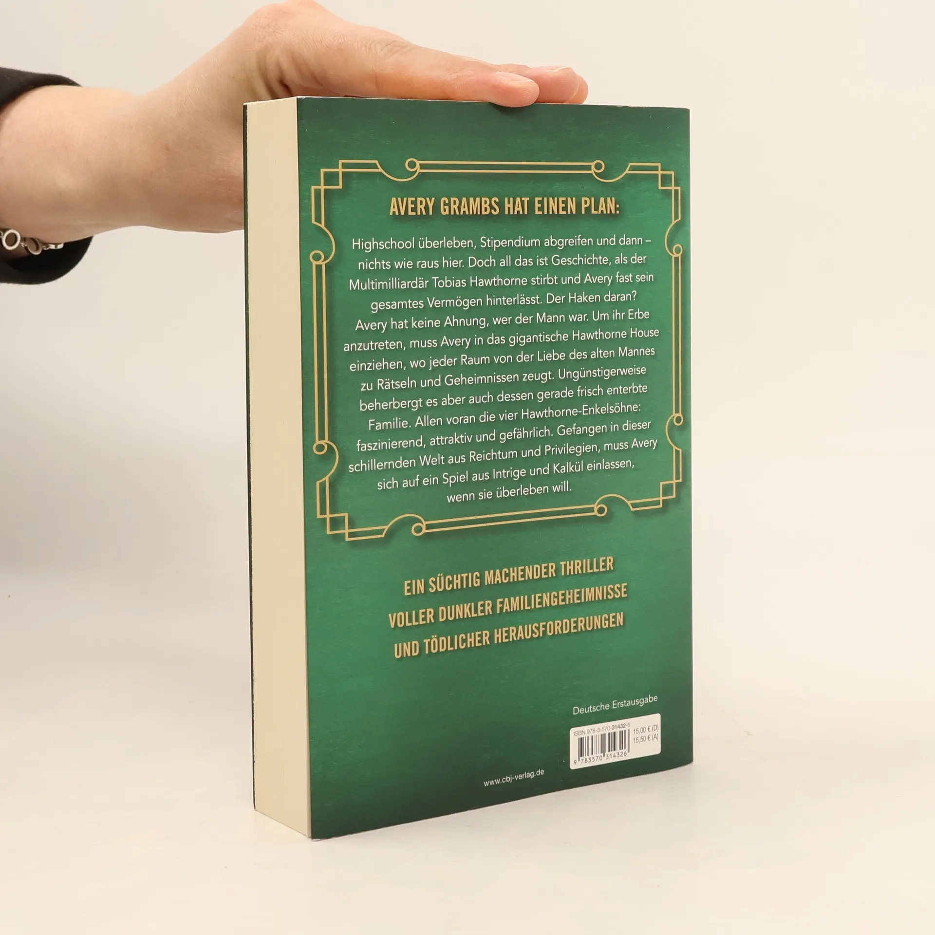 50 Milliarden Dollar – Eine unbekannte Erbin – Vier mörderische Nachkommen. Für alle ab 14 Jahren! Avery Grambs hat einen Plan: Highschool überleben, Stipendium abgreifen und dann – nichts wie raus hier. Doch all das ist Geschichte, als der Multimilliardär Tobias Hawthorne stirbt und Avery fast sein gesamtes Vermögen hinterlässt. Der Haken daran? Avery hat keine Ahnung, wer der Mann war. Um ihr Erbe anzutreten, muss Avery in das gigantische Hawthorne House einziehen, wo jeder Raum von der Liebe des alten Mannes zu Rätseln und Geheimnissen zeugt. Ungünstigerweise beherbergt es aber auch dessen gerade frisch enterbte Familie. Allen voran die vier Hawthorne-Enkelsöhne: faszinierend, attraktiv und gefährlich. Gefangen in dieser schillernden Welt aus Reichtum und Privilegien, muss Avery sich auf ein Spiel aus Intrige und Kalkül einlassen, wenn sie überleben will. Ein süchtig machender Thriller voller dunkler Familiengeheimnisse und tödlicher Herausforderungen. Die Inheritance-Reihe: The Inheritance Games (Band 1) The Inheritance Games - Das Spiel geht weiter (Band 2) The Inheritance Games - Der letzte Schachzug (Band 3)