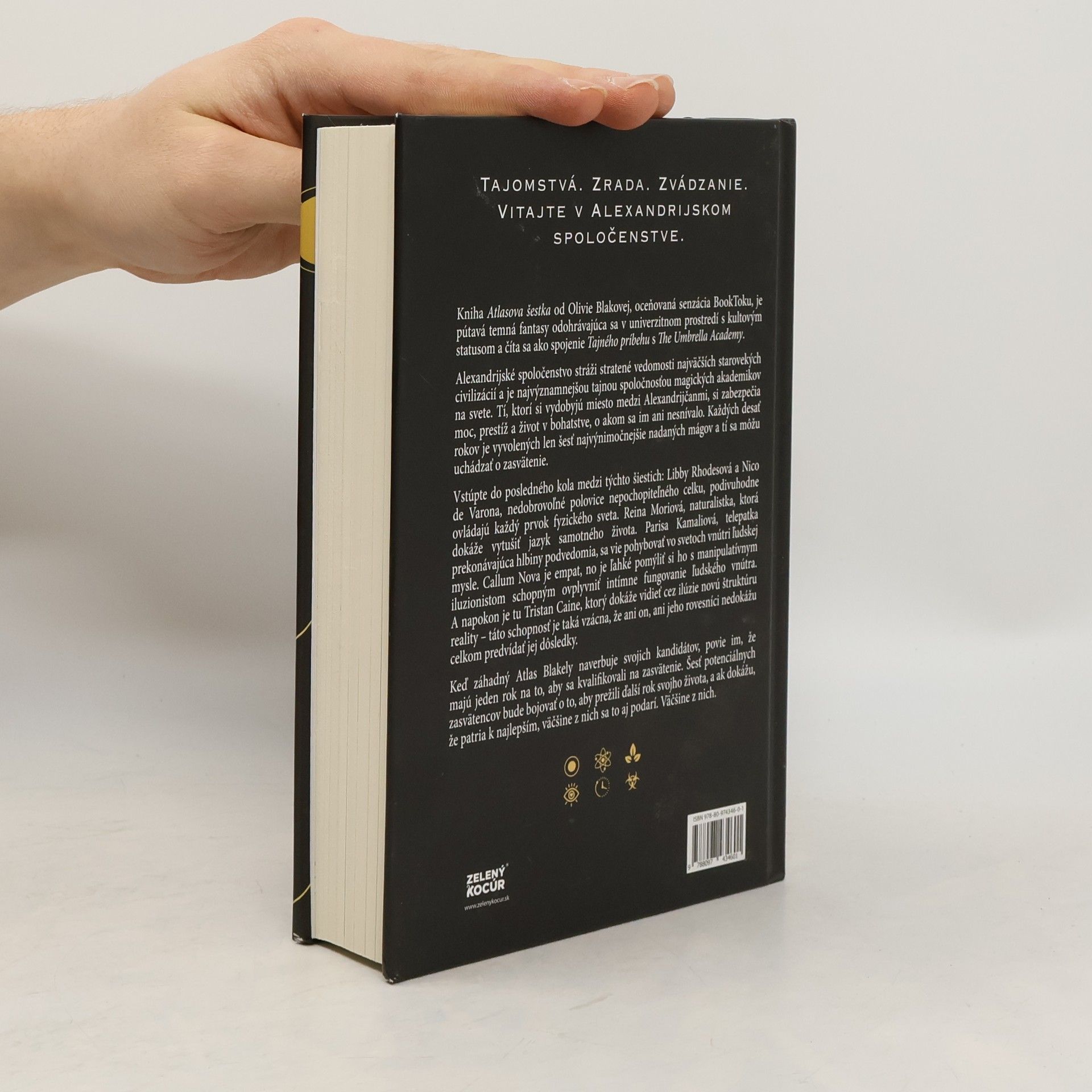 Kniha Atlasova šestka od Olivie Blakovej je pútavá temná fantasy odohrávajúca sa v univerzitnom prostredí, kombinujúca prvky Tajného príbehu a The Umbrella Academy. Alexandrijské spoločenstvo stráži stratené vedomosti starovekých civilizácií a je najvýznamnejšou tajnou spoločnosťou magických akademikov. Tí, ktorí sa dostanú medzi Alexandrijčanov, získajú moc, prestíž a bohatstvo. Každých desať rokov je vybraných iba šesť najvýnimočnejších mágov, ktorí sa uchádzajú o zasvätenie. Medzi nimi sú Libby Rhodesová a Nico de Varona, ovládajúci každý element fyzického sveta, Reina Moriová, naturalistka, ktorá chápe jazyk života, a Parisa Kamaliová, telepatka, ktorá preniká do hĺbok podvedomia. Callum Nova, empat, sa môže javiť ako manipulatívny iluzionista, zatiaľ čo Tristan Caine vidí cez ilúzie novú štruktúru reality. Záhadný Atlas Blakely naverbuje svojich kandidátov a oznámi im, že majú rok na kvalifikáciu na zasvätenie. Týchto šesť potenciálnych zasvätencov bude bojovať o prežitie a šancu na úspech, pričom väčšina z nich sa snaží dokázať, že patria medzi najlepších. Väčšine z nich.