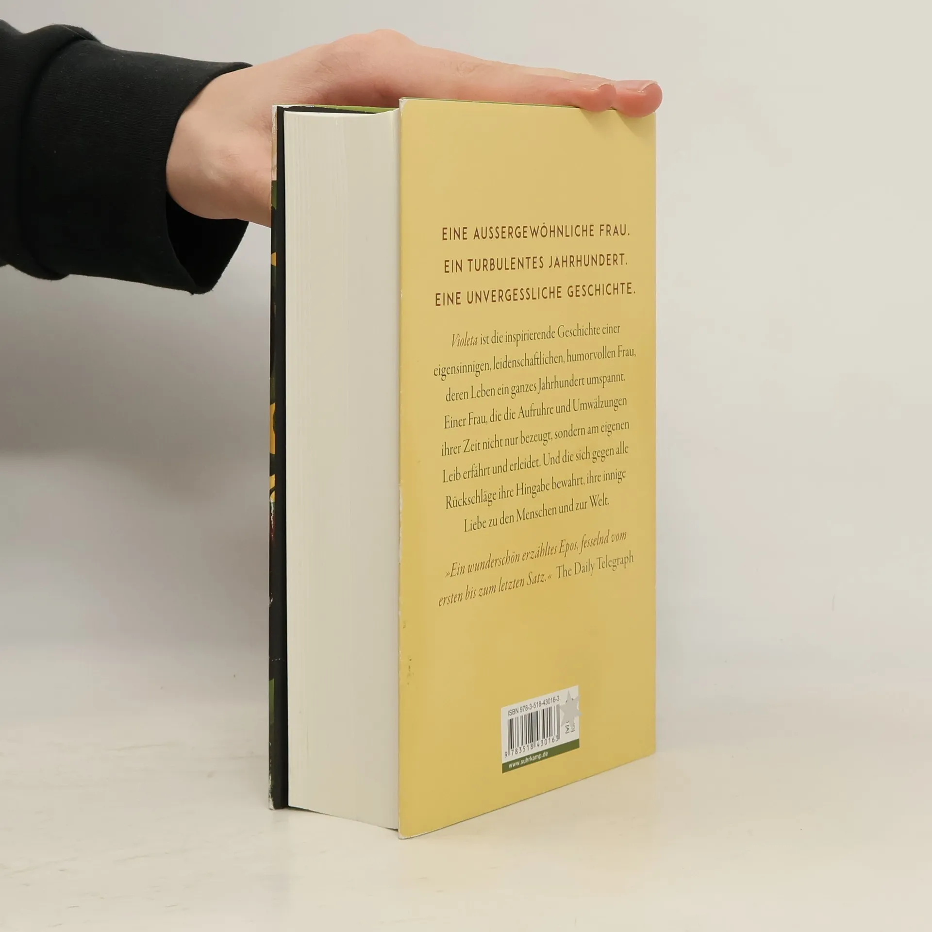 An einem stürmischen Tag des Jahres 1920 kommt sie zur Welt, jüngste Schwester von fünf übermütigen Brüdern, Violeta del Valle. Die Auswirkungen des Krieges sind noch immer spürbar, da verwüstet die Spanische Grippe bereits ihre südamerikanische Heimat. Zum Glück hat der Vater vorgesorgt, die Familie kommt durch, doch schon droht das nächste Unheil, die Weltwirtschaftskrise wird das vornehme Stadtleben, in dem Violeta aufwächst, für immer beenden, die del Valles ziehen sich ins wild-schöne Hinterland zurück. Dort wird Violeta volljährig, und schon steht der erste Verehrer vor der Tür …Violeta erzählt uns selbst ihr Leben, am Ende ihrer Tage schreibt sie ihrem geliebten Enkel einen langen Brief – sie schreibt von ihren halsbrecherischen Affären, den Jahren der Armut, von schrecklichen Verlusten und tiefempfundener Freude, von historischen Vorkommnissen, die ihr Leben geprägt haben: von dem Kampf für die Rechte der Frauen, dem Aufstieg und Fall von Tyrannen und von zwei schrecklichen Pandemien. Violeta ist die inspirierende Geschichte einer eigensinnigen, leidenschaftlichen, humorvollen Frau, deren Leben ein ganzes Jahrhundert umspannt. Einer Frau, die Aufruhr und Umwälzungen ihrer Zeit nicht nur bezeugt, sondern am eigenen Leib erfährt und erleidet. Und die sich gegen alle Rückschläge ihre Hingabe bewahrt, ihre innige Liebe zu den Menschen und zur Welt.