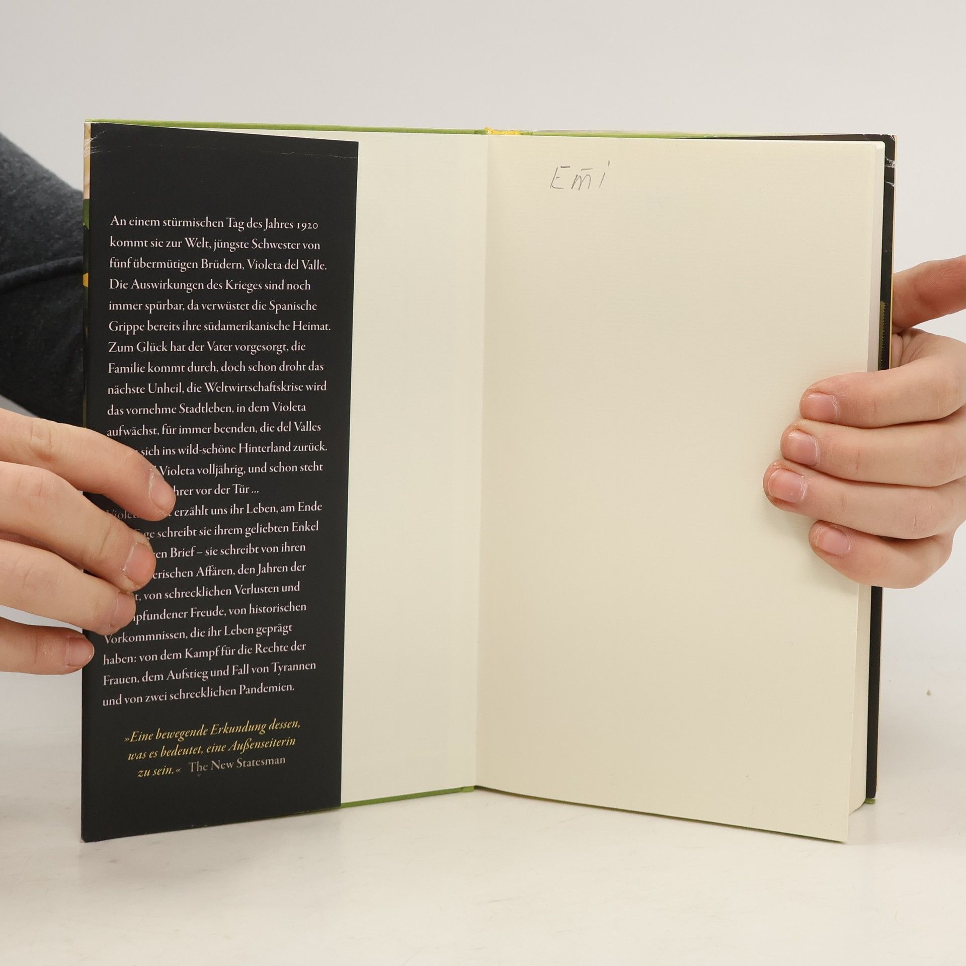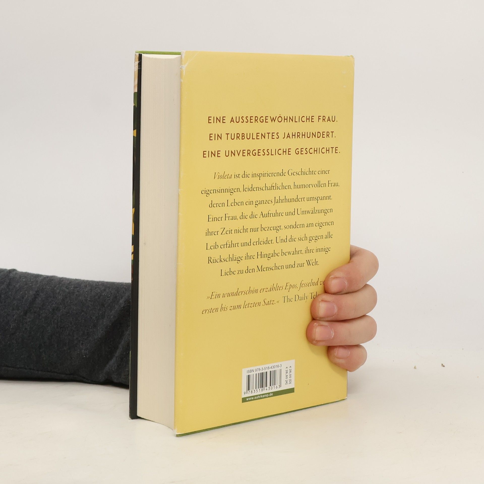 An einem stürmischen Tag des Jahres 1920 kommt sie zur Welt, jüngste Schwester von fünf übermütigen Brüdern, Violeta del Valle. Die Auswirkungen des Krieges sind noch immer spürbar, da verwüstet die Spanische Grippe bereits ihre südamerikanische Heimat. Zum Glück hat der Vater vorgesorgt, die Familie kommt durch, doch schon droht das nächste Unheil, die Weltwirtschaftskrise wird das vornehme Stadtleben, in dem Violeta aufwächst, für immer beenden, die del Valles ziehen sich ins wild-schöne Hinterland zurück. Dort wird Violeta volljährig, und schon steht der erste Verehrer vor der Tür …Violeta erzählt uns selbst ihr Leben, am Ende ihrer Tage schreibt sie ihrem geliebten Enkel einen langen Brief – sie schreibt von ihren halsbrecherischen Affären, den Jahren der Armut, von schrecklichen Verlusten und tiefempfundener Freude, von historischen Vorkommnissen, die ihr Leben geprägt haben: von dem Kampf für die Rechte der Frauen, dem Aufstieg und Fall von Tyrannen und von zwei schrecklichen Pandemien. Violeta ist die inspirierende Geschichte einer eigensinnigen, leidenschaftlichen, humorvollen Frau, deren Leben ein ganzes Jahrhundert umspannt. Einer Frau, die Aufruhr und Umwälzungen ihrer Zeit nicht nur bezeugt, sondern am eigenen Leib erfährt und erleidet. Und die sich gegen alle Rückschläge ihre Hingabe bewahrt, ihre innige Liebe zu den Menschen und zur Welt.