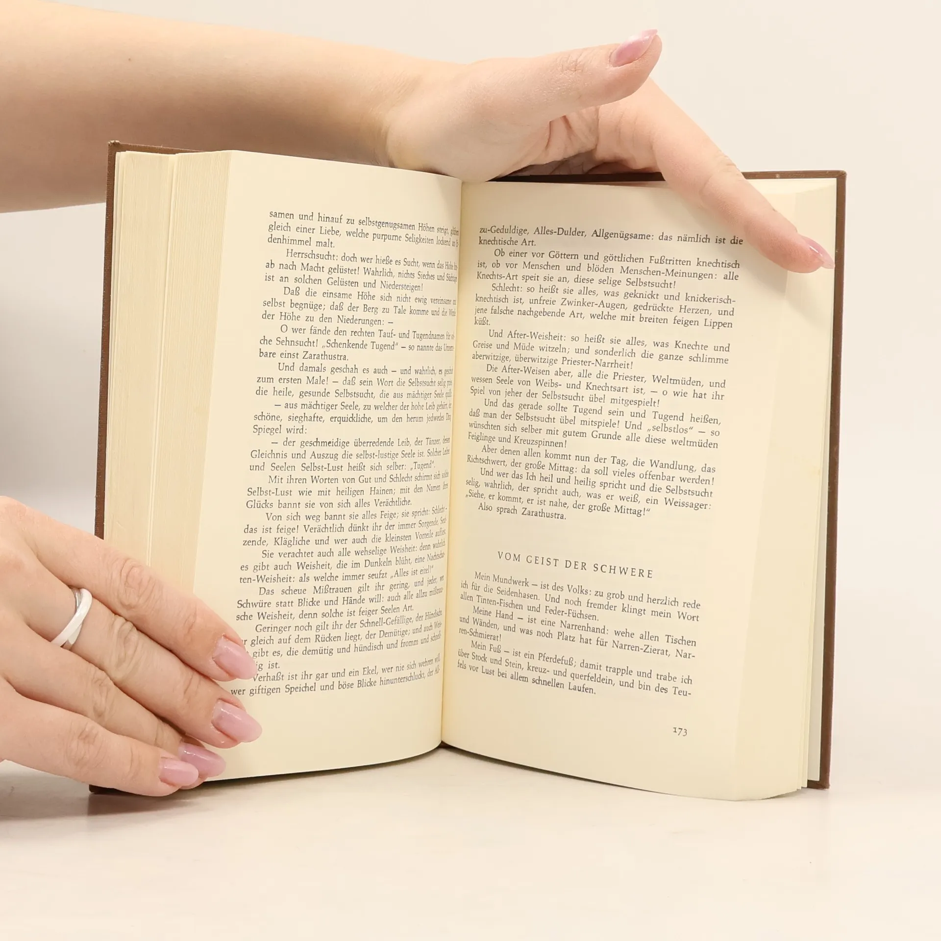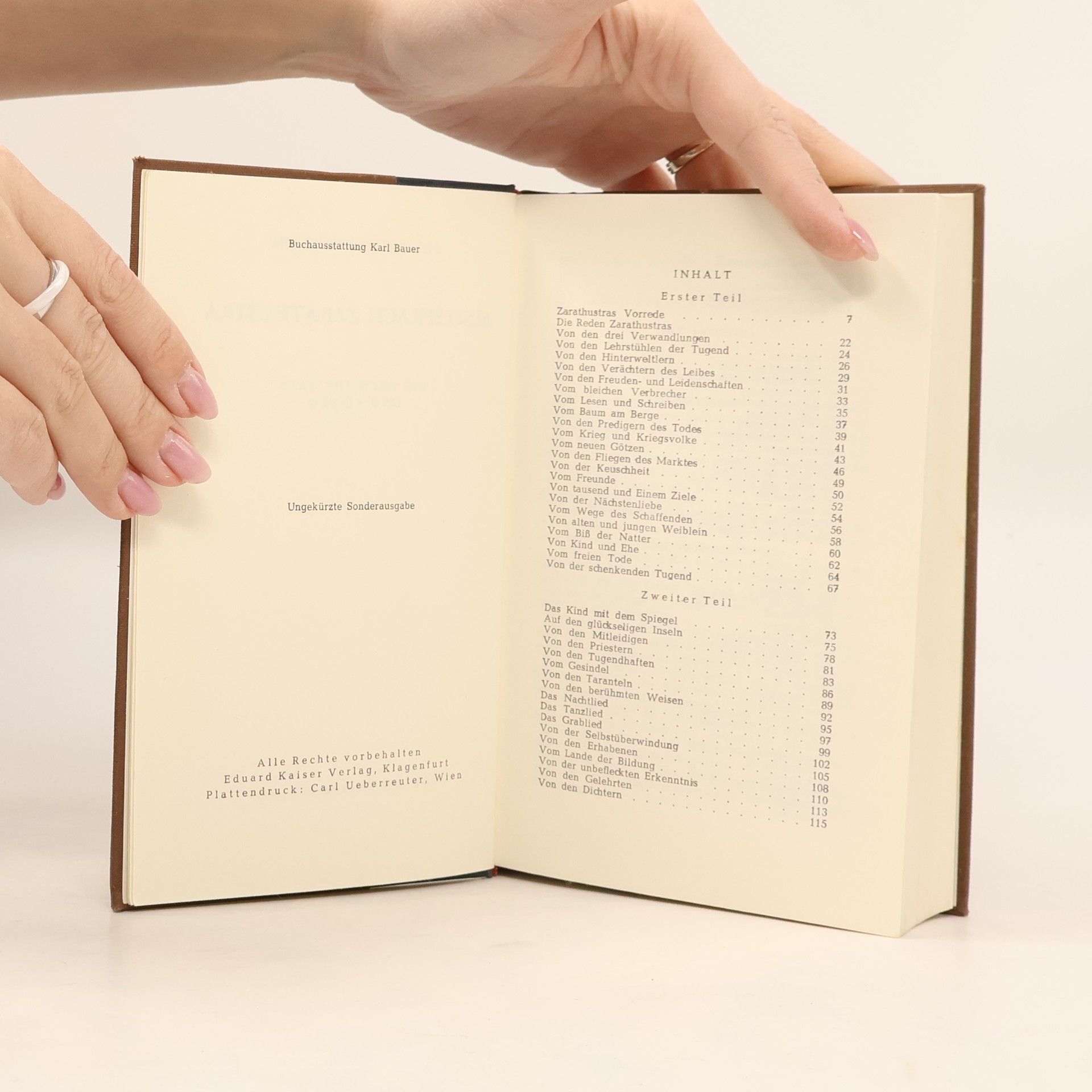 Zarathustra, inspiriert von einem persischen Religionsstifter des 6. Jahrhunderts v. Chr., kämpft gegen den Nihilismus, der aus der Erkenntnis "Gott ist tot" resultiert. Er strebt an, einen neuen Glauben zu begründen: den Glauben an den 'Übermenschen'. Während schwache Menschen den Geboten des toten Gottes folgen, sucht der Übermensch sein Heil in der Ausrichtung auf das Irdische, auf Macht, Vitalität und Stärke, um der Welt einen neuen Sinn zu geben. Der Übermensch hat die Fähigkeit, alte moralische Werte abzuschaffen und in völliger Freiheit das Leben zu verbessern. Das Werk besteht hauptsächlich aus den Reden Zarathustras, der sich mit 30 Jahren in eine Höhle zurückzieht, um seine Lehre zu entwickeln und dem Nihilismus entgegenzuwirken. Das Buch gliedert sich in vier Teile: In den ersten beiden verkündet Zarathustra die Lehre vom Übermenschen. Im dritten Teil formuliert er den zentralen Gedanken seiner Philosophie: die ewige Wiederkehr des Gleichen und deren Sinnlosigkeit, was ihn gegen einen übergeordneten Sinn und ein Ziel der Geschichte richtet. Trotz des nihilistischen Gedankens erkennt er im Kreislauf des Lebens, auch im Leiden, den Wert des Daseins. Im letzten Teil wird Zarathustra um Hilfe in der durch den Tod Gottes verursachten Verzweiflung gebeten. Sein Wissen um die Wiederkehr des Gleichen ermöglicht es ihm, die christlichen Werte zu verwerfen und dem Ideal des Übermenschen zu entsprechen. Nietzsches ständige T