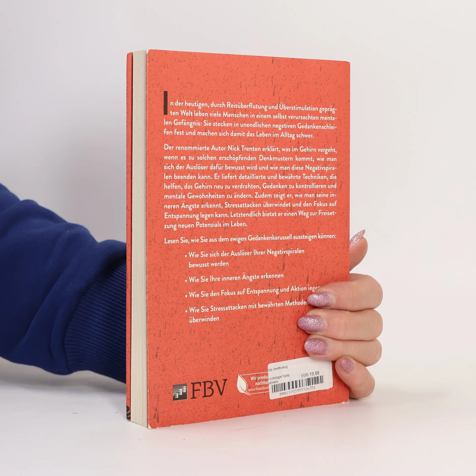 In der heutigen, durch Reizüberflutung und Überstimulation geprägten Welt leben viele Menschen in einem selbst verursachten mentalen Gefängnis: Sie stecken in unendlichen negativen Gedankenschleifen fest und machen sich damit das Leben im Alltag schwer. Dieses Buch erklärt, was im Gehirn vorgeht, wenn es zu solchen erschöpfenden Denkmustern kommt, wie man sich der Auslöser dafür bewusst wird und wie man diese Negativspiralen beenden kann. Der renommierte Autor Nick Trenton liefert detaillierte und bewährte Techniken, die helfen, das Gehirn neu zu verdrahten, Gedanken zu kontrollieren und mentale Gewohnheiten zu ändern. Er zeigt, wie man seine inneren Ängste erkennt, Stressattacken überwindet und den Fokus auf Entspannung legen kann. Letztendlich bietet er einen Weg zur Freisetzung neuen Potenzials im Leben.