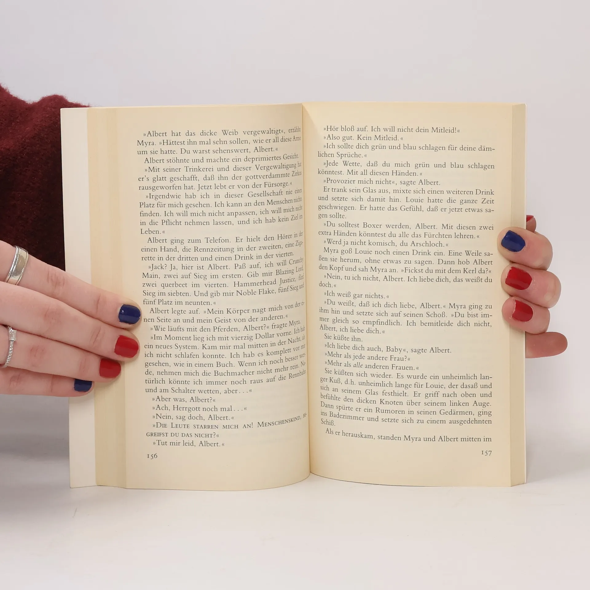”Ich erinnere mich, wie ich als Junge diesen Roman von Hemingway gelesen habe. Da steigt ein Kerl immer wieder mit einer Frau ins Bett, aber es geht nicht. Dabei liebt er sie, und sie liebt ihn auch. Mein Gott, dachte ich, was für ein großartiges Buch. All die Jahrhunderte, und noch nie hat einer über diesen Aspekt der Sache geschrieben. Ich dachte, der Kerl wäre einfach zu dumm zum Ficken gewesen. Weiter hinten im Buch stellte sich dann heraus, dass er im Krieg seine Genitalien eingebüßt hatte. War das eine Enttäuschung.“ - Bukowski denkt sich keine großen Sachen aus, um Dinge zu beweisen, die sowieso niemand glaubt. Eher unauffällig schleichen sich in das große Fressen, Saufen und Ficken auch ganz andere Begriffe, wie: Jesus, Hitler, Jeanne d'Arc, Malerei oder Tod. ”Der Mensch ist der Abschaum des Universums“, heißt es gleich in der ersten Geschichte, und die restlichen 35 geben Gelegenheit, diese Theorie zu überprüfen.
