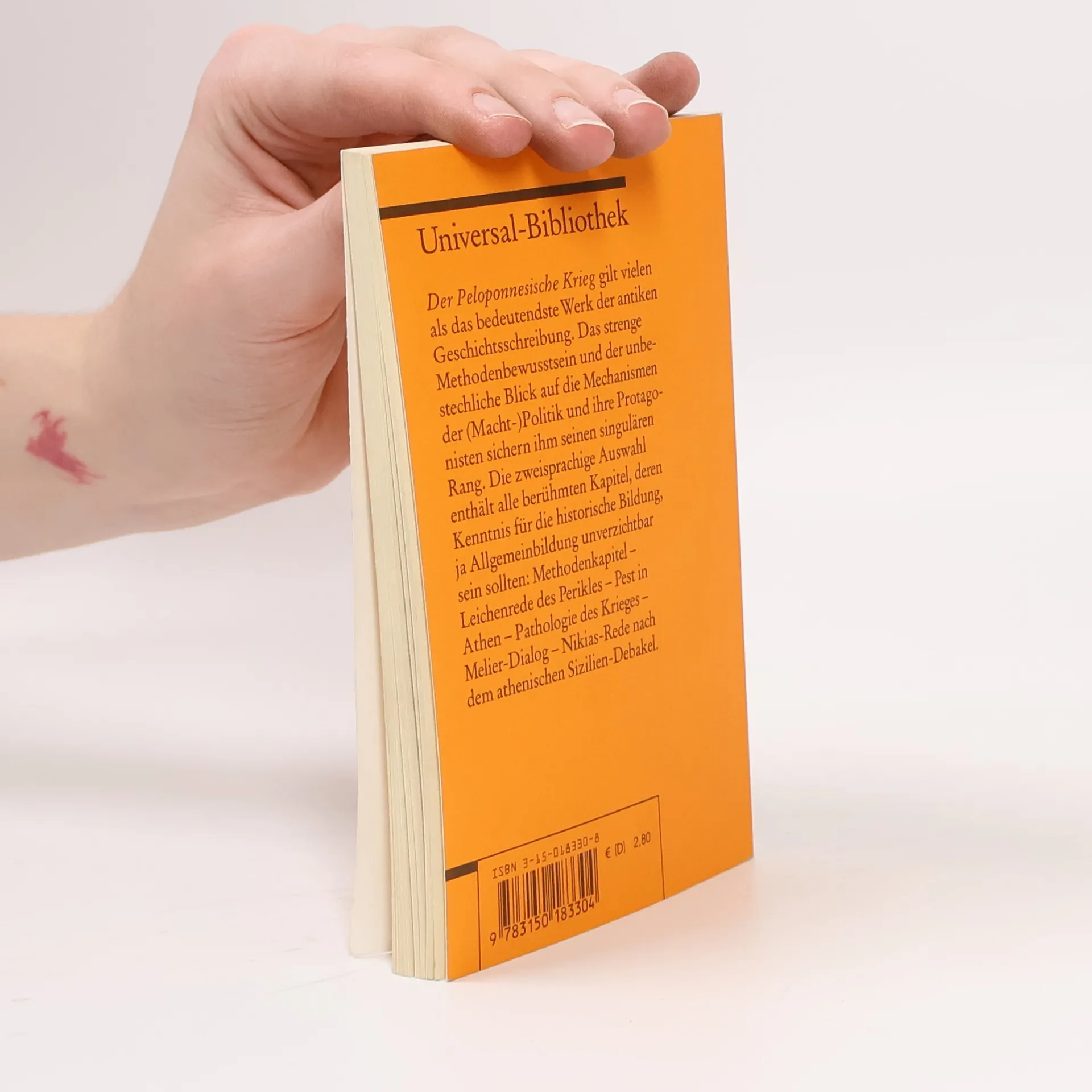 Thukydides' strenges Methodenbewusstsein, sein unbestechlicher Blick auf die Mechanismen der Politik sowie seine sprachliche Prägnanz machen sein Werk zum wohl bedeutendsten antiker Geschichtsschreibung. Die Auswahl enthält alle berühmten Kapitel, deren Kenntnis für die historische Bildung, ja Allgemeinbildung unverzichtbar sein sollte: Methodenkapitel - Leichenrede des Perikles - Pest in Athen - Pathologie des Krieges - Melier-Dialog - Nikias-Rede nach dem athenischen Sizilien-Debakel.