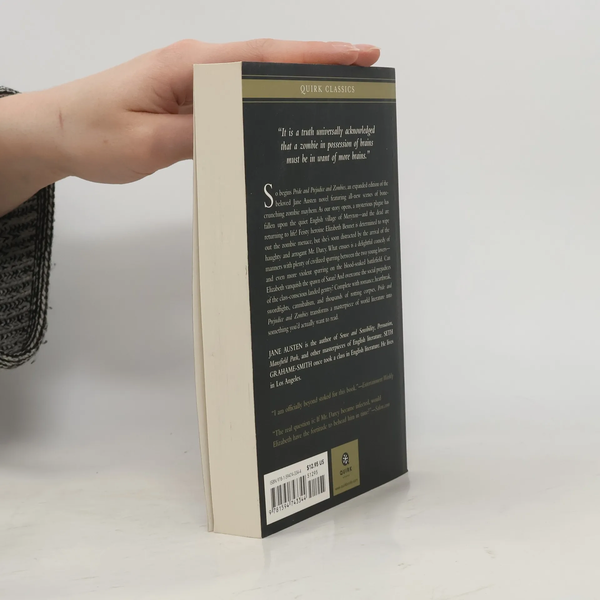 “It is a truth universally acknowledged that a zombie in possession of brains must be in want of more brains.”So begins Pride and Prejudice and Zombies, an expanded edition of the beloved Jane Austen novel featuring all-new scenes of bone-crunching zombie mayhem. As our story opens, a mysterious plague has fallen upon the quiet English village of Meryton—and the dead are returning to life! Feisty heroine Elizabeth Bennet is determined to wipe out the zombie menace, but she’s soon distracted by the arrival of the haughty and arrogant Mr. Darcy. What ensues is a delightful comedy of manners with plenty of civilized sparring between the two young lovers—and even more violent sparring on the blood-soaked battlefield. Can Elizabeth vanquish the spawn of Satan? And overcome the social prejudices of the class-conscious landed gentry? Complete with romance, heartbreak, swordfights, cannibalism, and thousands of rotting corpses,
