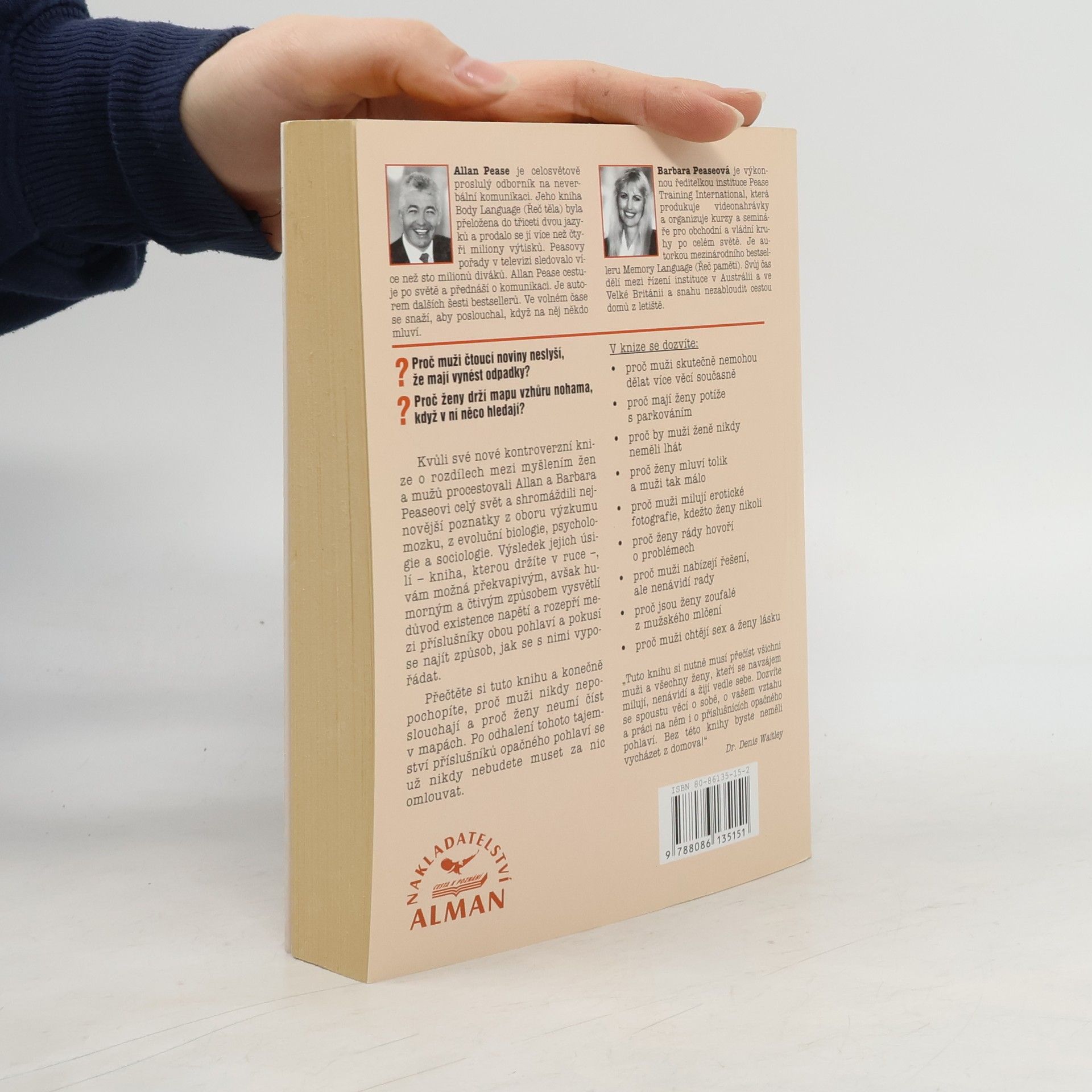 Kvůli své kontroverzní knize o rozdílech mezi myšlením žen a mužů procestovali Allan a Barbara Peaseovi celý svět a shromáždili nejnovější poznatky z oboru výzkumu mozku, z evoluční biologie, psychologie a sociologie. Výsledek jejich úsilí, vám možná překvapivým, avšak humorným a čtivým způsobem vysvětlí důvod existence napětí rozepří mezi příslušníky obou pohlaví a pokusí se najít způsob, jak se s nimi vypořádat. Přečtěte si tuto knihu a konečně pochopíte, proč muži nikdy neposlouchají a proč ženy neumí číst v mapách. Po odhalení tohoto tajemství příslušníků opačného pohlaví se už nikdy nebudete muset za nic omlouvat.